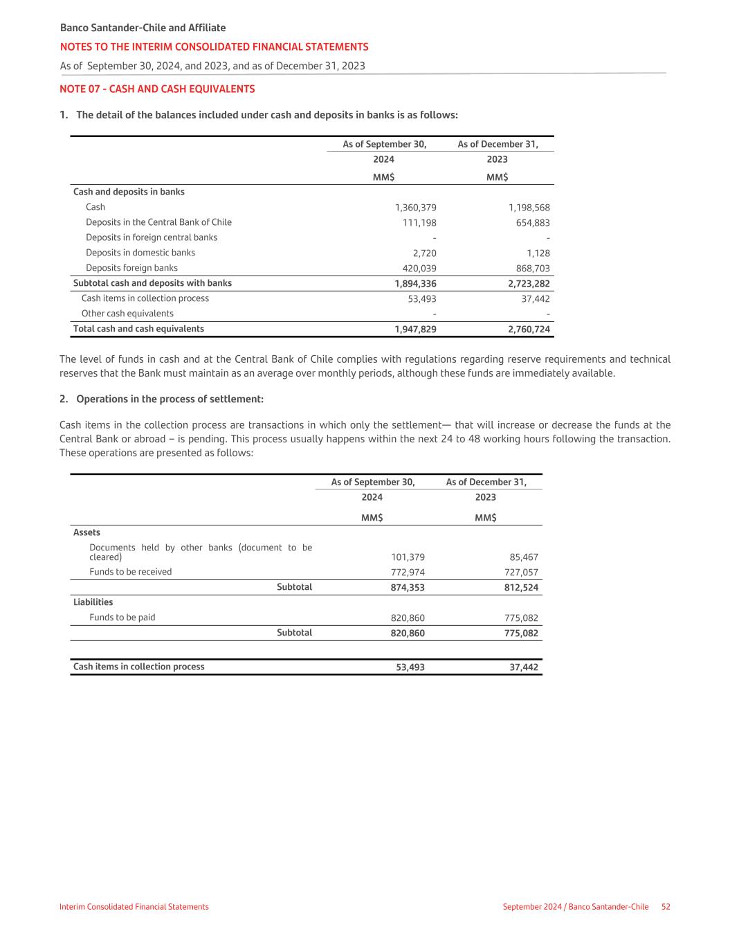 NOTE 07 - CASH AND CASH EQUIVALENTS 1. The detail of the balances included under cash and deposits in banks is as follows: As of September 30, As of December 31, 2024 2023 MM$ MM$ Cash and deposits in banks Cash 1,360,379 1,198,568 Deposits in the Central Bank of Chile 111,198 654,883 Deposits in foreign central banks - - Deposits in domestic banks 2,720 1,128 Deposits foreign banks 420,039 868,703 Subtotal cash and deposits with banks 1,894,336 2,723,282 Cash items in collection process 53,493 37,442 Other cash equivalents - - Total cash and cash equivalents 1,947,829 2,760,724 The level of funds in cash and at the Central Bank of Chile complies with regulations regarding reserve requirements and technical reserves that the Bank must maintain as an average over monthly periods, although these funds are immediately available. 2. Operations in the process of settlement: Cash items in the collection process are transactions in which only the settlement— that will increase or decrease the funds at the Central Bank or abroad – is pending. This process usually happens within the next 24 to 48 working hours following the transaction. These operations are presented as follows: As of September 30, As of December 31, 2024 2023 MM$ MM$ Assets Documents held by other banks (document to be cleared) 101,379 85,467 Funds to be received 772,974 727,057 Subtotal 874,353 812,524 Liabilities Funds to be paid 820,860 775,082 Subtotal 820,860 775,082 Cash items in collection process 53,493 37,442 Banco Santander-Chile and Affiliate NOTES TO THE INTERIM CONSOLIDATED FINANCIAL STATEMENTS As of September 30, 2024, and 2023, and as of December 31, 2023 Interim Consolidated Financial Statements September 2024 / Banco Santander-Chile 52