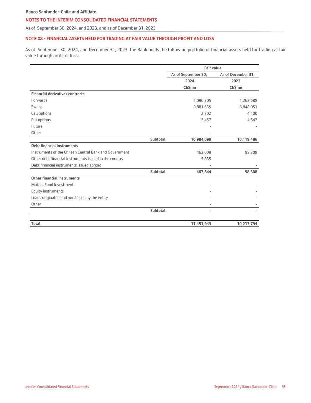 NOTE 08 - FINANCIAL ASSETS HELD FOR TRADING AT FAIR VALUE THROUGH PROFIT AND LOSS As of September 30, 2024, and December 31, 2023, the Bank holds the following portfolio of financial assets held for trading at fair value through profit or loss: Fair value As of September 30, As of December 31, 2024 2023   Ch$mn Ch$mn Financial derivatives contracts     Forwards 1,096,305 1,262,688 Swaps 9,881,635 8,848,051 Call options 2,702 4,100 Put options 3,457 4,647 Future - - Other - - Subtotal 10,984,099 10,119,486 Debt financial instruments   Instruments of the Chilean Central Bank and Government 462,009 98,308 Other debt financial instruments issued in the country 5,835 - Debt financial instruments issued abroad - - Subtotal 467,844 98,308 Other financial instruments   Mutual Fund Investments - - Equity instruments - - Loans originated and purchased by the entity - - Other - - Subtotal - - Total 11,451,943 10,217,794 Banco Santander-Chile and Affiliate NOTES TO THE INTERIM CONSOLIDATED FINANCIAL STATEMENTS As of September 30, 2024, and 2023, and as of December 31, 2023 Interim Consolidated Financial Statements September 2024 / Banco Santander-Chile 53