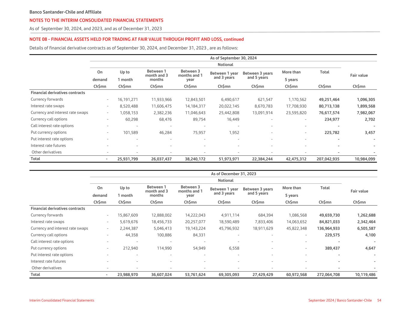 NOTE 08 - FINANCIAL ASSETS HELD FOR TRADING AT FAIR VALUE THROUGH PROFIT AND LOSS, continued Details of financial derivative contracts as of September 30, 2024, and December 31, 2023 , are as follows: As of September 30, 2024 Notional On Up to Between 1 month and 3 months Between 3 months and 1 year Between 1 year and 3 years Between 3 years and 5 years More than Total Fair value demand 1 month 5 years   Ch$mn Ch$mn Ch$mn Ch$mn Ch$mn Ch$mn Ch$mn Ch$mn Ch$mn Financial derivatives contracts               Currency forwards - 16,191,271 11,933,966 12,843,501 6,490,617 621,547 1,170,562 49,251,464 1,096,305 Interest rate swaps - 8,520,488 11,606,475 14,184,317 20,022,145 8,670,783 17,708,930 80,713,138 1,899,568 Currency and interest rate swaps - 1,058,153 2,382,236 11,046,643 25,442,808 13,091,914 23,595,820 76,617,574 7,982,067 Currency call options - 60,298 68,476 89,754 16,449 - - 234,977 2,702 Call interest rate options - - - - - - - - - Put currency options - 101,589 46,284 75,957 1,952 - - 225,782 3,457 Put interest rate options - - - - - - - - - Interest rate futures - - - - - - - - - Other derivatives - - - - - - - - - Total -  25,931,799 26,037,437 38,240,172 51,973,971 22,384,244 42,475,312 207,042,935 10,984,099 As of December 31, 2023 Notional On Up to Between 1 month and 3 months Between 3 months and 1 year Between 1 year and 3 years Between 3 years and 5 years More than Total Fair value demand 1 month 5 years   Ch$mn Ch$mn Ch$mn Ch$mn Ch$mn Ch$mn Ch$mn Ch$mn Ch$mn Financial derivatives contracts                 Currency forwards - 15,867,609 12,888,002 14,222,043 4,911,114 684,394 1,086,568 49,659,730 1,262,688 Interest rate swaps - 5,619,676 18,456,733 20,257,077 18,590,489 7,833,406 14,063,652 84,821,033 2,342,464 Currency and interest rate swaps - 2,244,387 5,046,413 19,143,224 45,796,932 18,911,629 45,822,348 136,964,933 6,505,587 Currency call options - 44,358 100,886 84,331 - - - 229,575 4,100 Call interest rate options - - - - - - - - - Put currency options - 212,940 114,990 54,949 6,558 - - 389,437 4,647 Put interest rate options - - - - - - - - - Interest rate futures - - - - - - - - - Other derivatives - - - - - - - - - Total -  23,988,970 36,607,024 53,761,624 69,305,093 27,429,429 60,972,568 272,064,708 10,119,486 Banco Santander-Chile and Affiliate NOTES TO THE INTERIM CONSOLIDATED FINANCIAL STATEMENTS As of September 30, 2024, and 2023, and as of December 31, 2023 Interim Consolidated Financial Statements September 2024 / Banco Santander-Chile 54