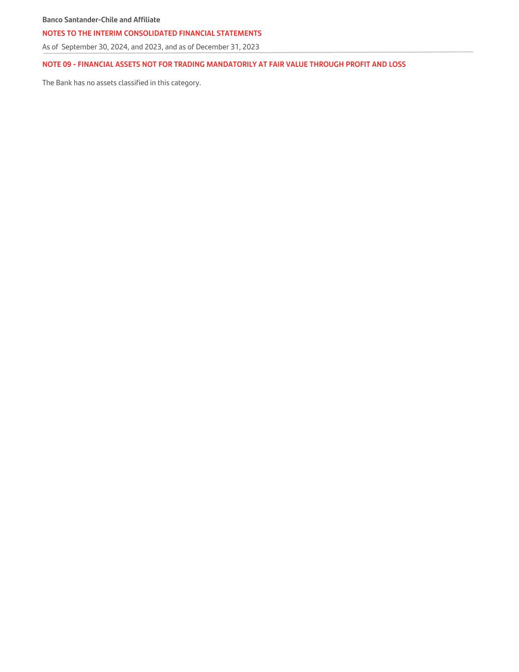NOTE 09 - FINANCIAL ASSETS NOT FOR TRADING MANDATORILY AT FAIR VALUE THROUGH PROFIT AND LOSS The Bank has no assets classified in this category. Banco Santander-Chile and Affiliate NOTES TO THE INTERIM CONSOLIDATED FINANCIAL STATEMENTS As of September 30, 2024, and 2023, and as of December 31, 2023
