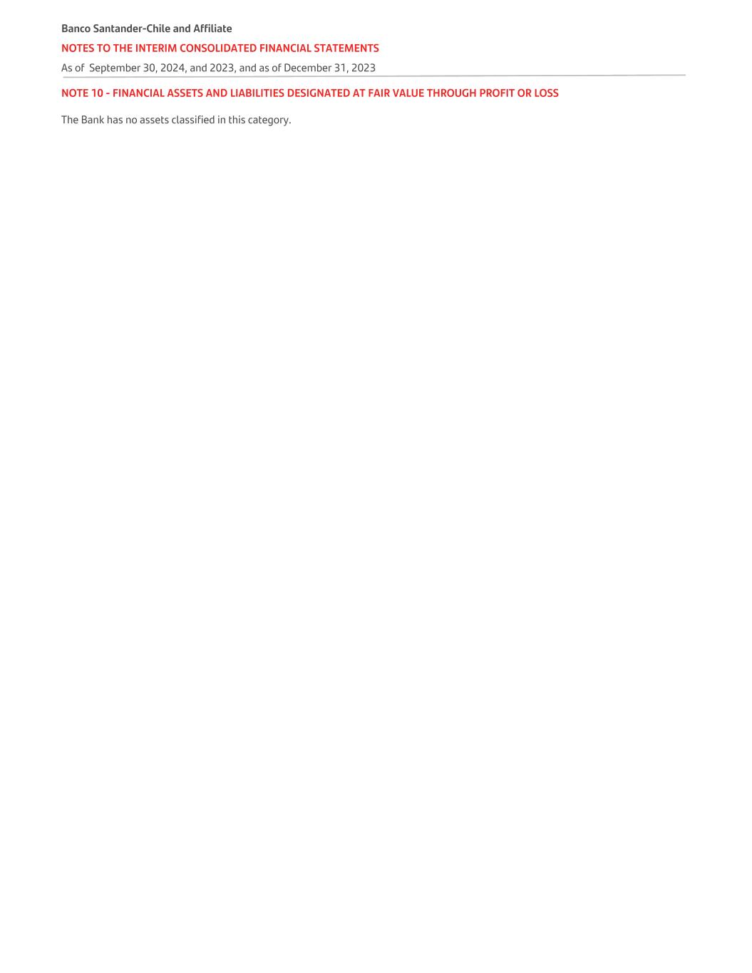 NOTE 10 - FINANCIAL ASSETS AND LIABILITIES DESIGNATED AT FAIR VALUE THROUGH PROFIT OR LOSS The Bank has no assets classified in this category. Banco Santander-Chile and Affiliate NOTES TO THE INTERIM CONSOLIDATED FINANCIAL STATEMENTS As of September 30, 2024, and 2023, and as of December 31, 2023