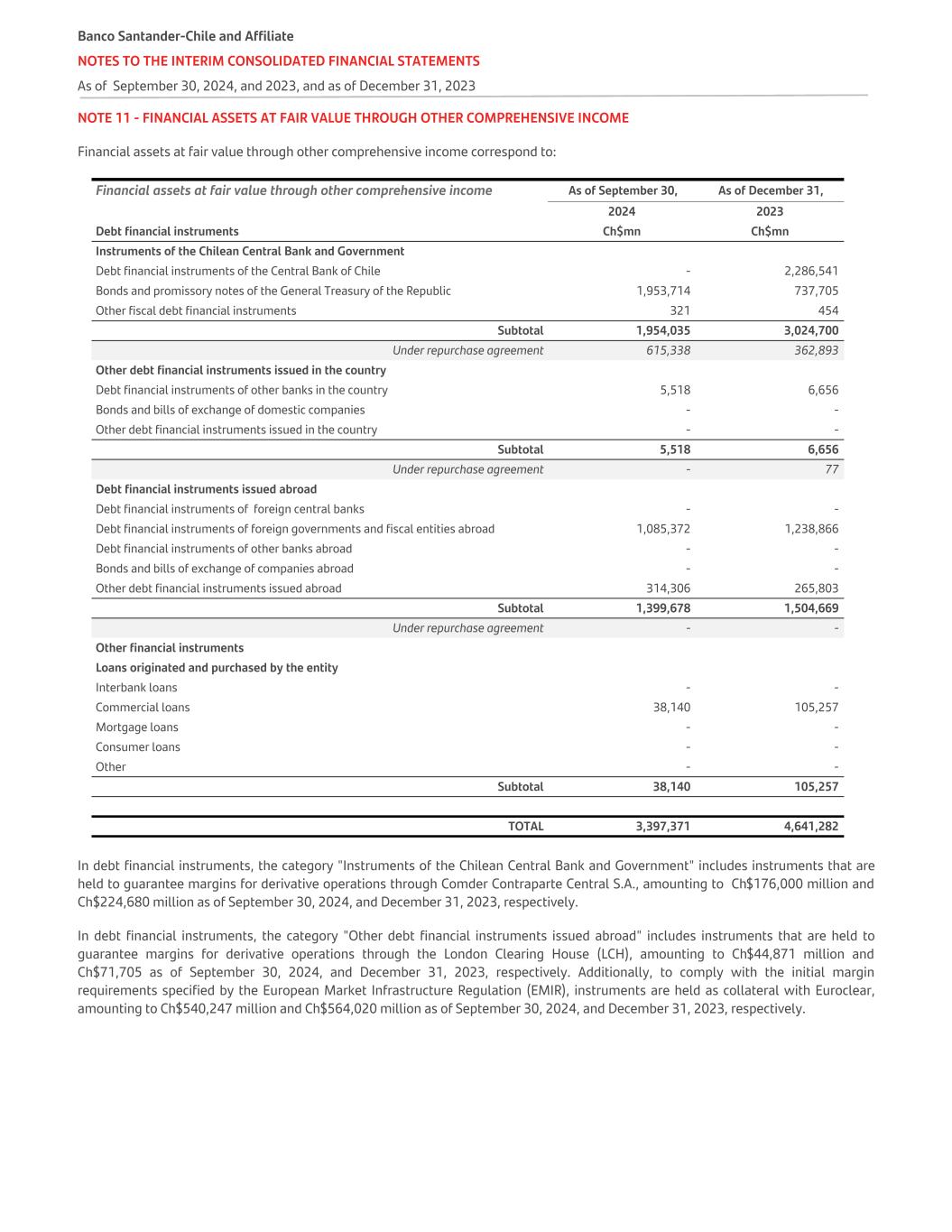 NOTE 11 - FINANCIAL ASSETS AT FAIR VALUE THROUGH OTHER COMPREHENSIVE INCOME Financial assets at fair value through other comprehensive income correspond to: Financial assets at fair value through other comprehensive income As of September 30, As of December 31, 2024 2023 Debt financial instruments Ch$mn Ch$mn Instruments of the Chilean Central Bank and Government Debt financial instruments of the Central Bank of Chile - 2,286,541 Bonds and promissory notes of the General Treasury of the Republic 1,953,714 737,705 Other fiscal debt financial instruments 321 454 Subtotal 1,954,035 3,024,700 Under repurchase agreement 615,338 362,893 Other debt financial instruments issued in the country Debt financial instruments of other banks in the country 5,518 6,656 Bonds and bills of exchange of domestic companies - - Other debt financial instruments issued in the country - - Subtotal 5,518 6,656 Under repurchase agreement - 77 Debt financial instruments issued abroad Debt financial instruments of foreign central banks - - Debt financial instruments of foreign governments and fiscal entities abroad 1,085,372 1,238,866 Debt financial instruments of other banks abroad - - Bonds and bills of exchange of companies abroad - - Other debt financial instruments issued abroad 314,306 265,803 Subtotal 1,399,678 1,504,669 Under repurchase agreement - - Other financial instruments Loans originated and purchased by the entity Interbank loans - - Commercial loans 38,140 105,257 Mortgage loans - - Consumer loans - - Other - - Subtotal 38,140 105,257 TOTAL 3,397,371 4,641,282 In debt financial instruments, the category "Instruments of the Chilean Central Bank and Government" includes instruments that are held to guarantee margins for derivative operations through Comder Contraparte Central S.A., amounting to Ch$176,000 million and Ch$224,680 million as of September 30, 2024, and December 31, 2023, respectively. In debt financial instruments, the category "Other debt financial instruments issued abroad" includes instruments that are held to guarantee margins for derivative operations through the London Clearing House (LCH), amounting to Ch$44,871 million and Ch$71,705 as of September 30, 2024, and December 31, 2023, respectively. Additionally, to comply with the initial margin requirements specified by the European Market Infrastructure Regulation (EMIR), instruments are held as collateral with Euroclear, amounting to Ch$540,247 million and Ch$564,020 million as of September 30, 2024, and December 31, 2023, respectively. Banco Santander-Chile and Affiliate NOTES TO THE INTERIM CONSOLIDATED FINANCIAL STATEMENTS As of September 30, 2024, and 2023, and as of December 31, 2023