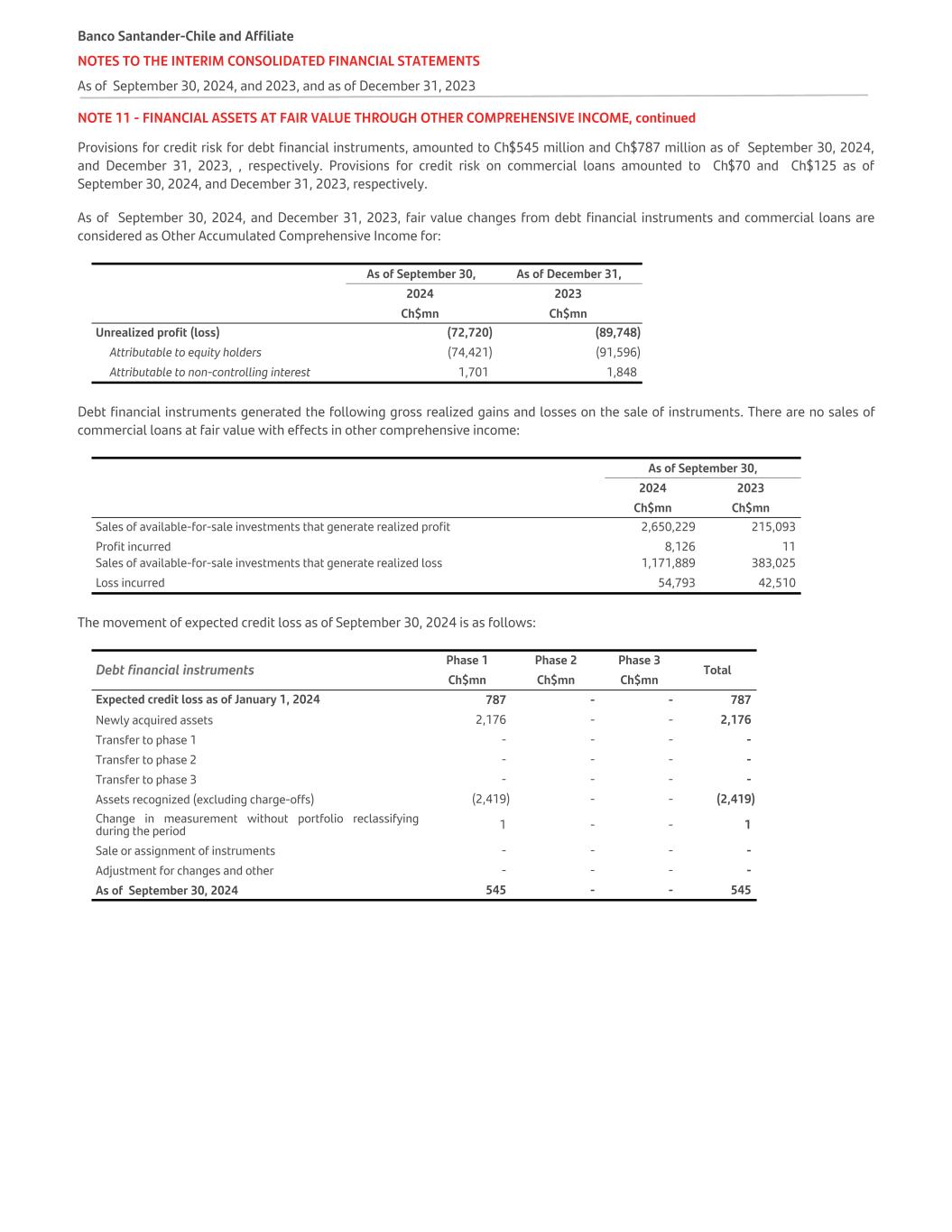 NOTE 11 - FINANCIAL ASSETS AT FAIR VALUE THROUGH OTHER COMPREHENSIVE INCOME, continued Provisions for credit risk for debt financial instruments, amounted to Ch$545 million and Ch$787 million as of September 30, 2024, and December 31, 2023, , respectively. Provisions for credit risk on commercial loans amounted to Ch$70 and Ch$125 as of September 30, 2024, and December 31, 2023, respectively. As of September 30, 2024, and December 31, 2023, fair value changes from debt financial instruments and commercial loans are considered as Other Accumulated Comprehensive Income for: As of September 30, As of December 31, 2024 2023 Ch$mn Ch$mn Unrealized profit (loss) (72,720) (89,748) Attributable to equity holders (74,421) (91,596) Attributable to non-controlling interest 1,701 1,848 Debt financial instruments generated the following gross realized gains and losses on the sale of instruments. There are no sales of commercial loans at fair value with effects in other comprehensive income: As of September 30, 2024 2023   Ch$mn Ch$mn Sales of available-for-sale investments that generate realized profit 2,650,229 215,093 Profit incurred 8,126 11 Sales of available-for-sale investments that generate realized loss 1,171,889 383,025 Loss incurred 54,793 42,510 The movement of expected credit loss as of September 30, 2024 is as follows: Debt financial instruments Phase 1 Phase 2 Phase 3 Total Ch$mn Ch$mn Ch$mn Expected credit loss as of January 1, 2024 787 - - 787 Newly acquired assets 2,176 - - 2,176 Transfer to phase 1 - - - - Transfer to phase 2 - - - - Transfer to phase 3 - - - - Assets recognized (excluding charge-offs) (2,419) - - (2,419) Change in measurement without portfolio reclassifying during the period 1 - - 1 Sale or assignment of instruments - - - - Adjustment for changes and other - - - - As of September 30, 2024 545 - - 545 Banco Santander-Chile and Affiliate NOTES TO THE INTERIM CONSOLIDATED FINANCIAL STATEMENTS As of September 30, 2024, and 2023, and as of December 31, 2023