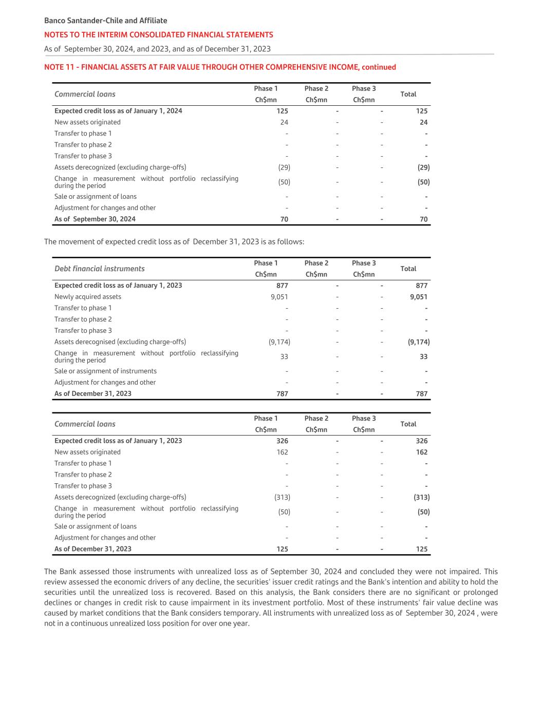 NOTE 11 - FINANCIAL ASSETS AT FAIR VALUE THROUGH OTHER COMPREHENSIVE INCOME, continued Commercial loans Phase 1 Phase 2 Phase 3 Total Ch$mn Ch$mn Ch$mn Expected credit loss as of January 1, 2024 125 - - 125 New assets originated 24 - - 24 Transfer to phase 1 - - - - Transfer to phase 2 - - - - Transfer to phase 3 - - - - Assets derecognized (excluding charge-offs) (29) - - (29) Change in measurement without portfolio reclassifying during the period (50) - - (50) Sale or assignment of loans - - - - Adjustment for changes and other - - - - As of September 30, 2024 70 - - 70 The movement of expected credit loss as of December 31, 2023 is as follows: Debt financial instruments Phase 1 Phase 2 Phase 3 Total Ch$mn Ch$mn Ch$mn Expected credit loss as of January 1, 2023 877 - - 877 Newly acquired assets 9,051 - - 9,051 Transfer to phase 1 - - - - Transfer to phase 2 - - - - Transfer to phase 3 - - - - Assets derecognised (excluding charge-offs) (9,174) - - (9,174) Change in measurement without portfolio reclassifying during the period 33 - - 33 Sale or assignment of instruments - - - - Adjustment for changes and other - - - - As of December 31, 2023 787 - - 787 Commercial loans Phase 1 Phase 2 Phase 3 Total Ch$mn Ch$mn Ch$mn Expected credit loss as of January 1, 2023 326 - - 326 New assets originated 162 - - 162 Transfer to phase 1 - - - - Transfer to phase 2 - - - - Transfer to phase 3 - - - - Assets derecognized (excluding charge-offs) (313) - - (313) Change in measurement without portfolio reclassifying during the period (50) - - (50) Sale or assignment of loans - - - - Adjustment for changes and other - - - - As of December 31, 2023 125 - - 125 The Bank assessed those instruments with unrealized loss as of September 30, 2024 and concluded they were not impaired. This review assessed the economic drivers of any decline, the securities' issuer credit ratings and the Bank's intention and ability to hold the securities until the unrealized loss is recovered. Based on this analysis, the Bank considers there are no significant or prolonged declines or changes in credit risk to cause impairment in its investment portfolio. Most of these instruments' fair value decline was caused by market conditions that the Bank considers temporary. All instruments with unrealized loss as of September 30, 2024 , were not in a continuous unrealized loss position for over one year. Banco Santander-Chile and Affiliate NOTES TO THE INTERIM CONSOLIDATED FINANCIAL STATEMENTS As of September 30, 2024, and 2023, and as of December 31, 2023
