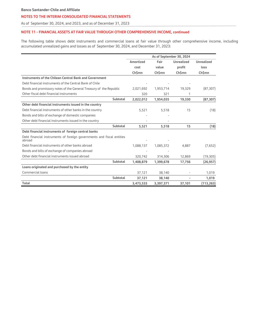 NOTE 11 - FINANCIAL ASSETS AT FAIR VALUE THROUGH OTHER COMPREHENSIVE INCOME, continued The following table shows debt instruments and commercial loans at fair value through other comprehensive income, including accumulated unrealized gains and losses as of September 30, 2024, and December 31, 2023: As of September 30, 2024 Amortized Fair Unrealized Unrealized cost value profit loss   Ch$mn Ch$mn Ch$mn Ch$mn Instruments of the Chilean Central Bank and Government Debt financial instruments of the Central Bank of Chile - - - Bonds and promissory notes of the General Treasury of the Republic 2,021,692 1,953,714 19,329 (87,307) Other fiscal debt financial instruments 320 321 1 Subtotal 2,022,012 1,954,035 19,330 (87,307) Other debt financial instruments issued in the country Debt financial instruments of other banks in the country 5,521 5,518 15 (18) Bonds and bills of exchange of domestic companies - - Other debt financial instruments issued in the country - - Subtotal 5,521 5,518 15 (18) Debt financial instruments of foreign central banks Debt financial instruments of foreign governments and fiscal entities abroad - - Debt financial instruments of other banks abroad 1,088,137 1,085,372 4,887 (7,652) Bonds and bills of exchange of companies abroad - - Other debt financial instruments issued abroad 320,742 314,306 12,869 (19,305) Subtotal 1,408,879 1,399,678 17,756 (26,957) Loans originated and purchased by the entity Commercial loans 37,121 38,140 - 1,019 Subtotal 37,121 38,140 - 1,019 Total 3,473,533 3,397,371 37,101 (113,263) Banco Santander-Chile and Affiliate NOTES TO THE INTERIM CONSOLIDATED FINANCIAL STATEMENTS As of September 30, 2024, and 2023, and as of December 31, 2023