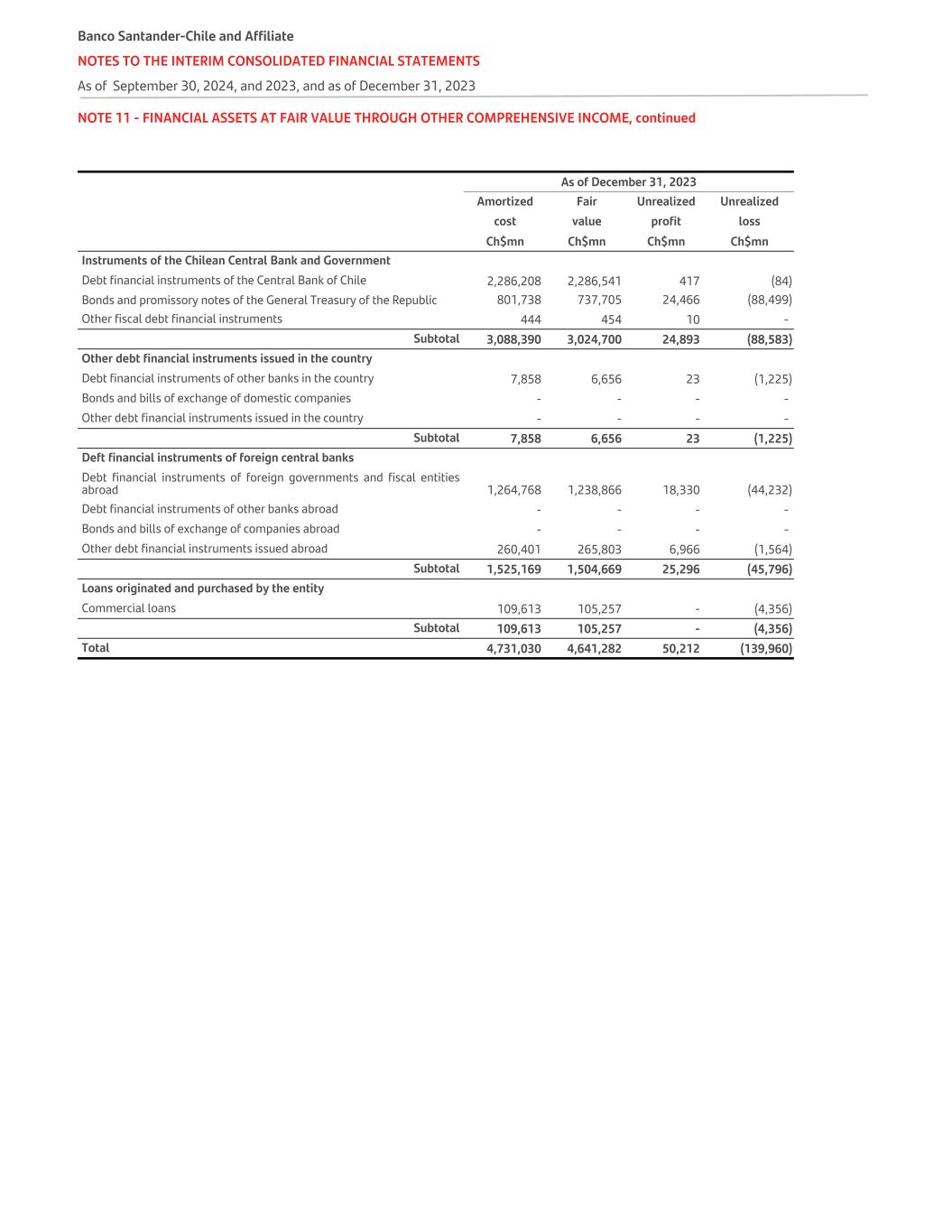 NOTE 11 - FINANCIAL ASSETS AT FAIR VALUE THROUGH OTHER COMPREHENSIVE INCOME, continued As of December 31, 2023 Amortized Fair Unrealized Unrealized cost value profit loss   Ch$mn Ch$mn Ch$mn Ch$mn Instruments of the Chilean Central Bank and Government Debt financial instruments of the Central Bank of Chile 2,286,208 2,286,541 417 (84) Bonds and promissory notes of the General Treasury of the Republic 801,738 737,705 24,466 (88,499) Other fiscal debt financial instruments 444 454 10 - Subtotal 3,088,390 3,024,700 24,893 (88,583) Other debt financial instruments issued in the country Debt financial instruments of other banks in the country 7,858 6,656 23 (1,225) Bonds and bills of exchange of domestic companies - - - - Other debt financial instruments issued in the country - - - - Subtotal 7,858 6,656 23 (1,225) Deft financial instruments of foreign central banks Debt financial instruments of foreign governments and fiscal entities abroad 1,264,768 1,238,866 18,330 (44,232) Debt financial instruments of other banks abroad - - - - Bonds and bills of exchange of companies abroad - - - - Other debt financial instruments issued abroad 260,401 265,803 6,966 (1,564) Subtotal 1,525,169 1,504,669 25,296 (45,796) Loans originated and purchased by the entity Commercial loans 109,613 105,257 - (4,356) Subtotal 109,613 105,257 - (4,356) Total 4,731,030 4,641,282 50,212 (139,960) Banco Santander-Chile and Affiliate NOTES TO THE INTERIM CONSOLIDATED FINANCIAL STATEMENTS As of September 30, 2024, and 2023, and as of December 31, 2023
