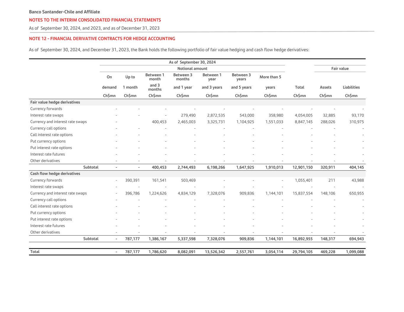 NOTE 12 - FINANCIAL DERIVATIVE CONTRACTS FOR HEDGE ACCOUNTING As of September 30, 2024, and December 31, 2023, the Bank holds the following portfolio of fair value hedging and cash flow hedge derivatives:   As of September 30, 2024       Notional amount Fair value On Up to Between 1 month Between 3 months Between 1 year Between 3 years More than 5 demand 1 month and 3 months and 1 year and 3 years and 5 years years Total Assets Liabilities Ch$mn Ch$mn Ch$mn Ch$mn Ch$mn Ch$mn Ch$mn Ch$mn Ch$mn Ch$mn Fair value hedge derivatives                 Currency forwards - - - - - - - - - - Interest rate swaps - - - 279,490 2,872,535 543,000 358,980 4,054,005 32,885 93,170 Currency and interest rate swaps - 400,453 2,465,003 3,325,731 1,104,925 1,551,033 8,847,145 288,026 310,975 Currency call options - - - - - - - - - - Call interest rate options - - - - - - - - - - Put currency options - - - - - - - - - - Put interest rate options - - - - - - - - - - Interest rate futures - - - - - - - - - - Other derivatives - - - - - - - - - - Subtotal - - 400,453 2,744,493 6,198,266 1,647,925 1,910,013 12,901,150 320,911 404,145 Cash flow hedge derivatives Currency forwards - 390,391 161,541 503,469 - - - 1,055,401 211 43,988 Interest rate swaps - - - - - - - - - - Currency and interest rate swaps - 396,786 1,224,626 4,834,129 7,328,076 909,836 1,144,101 15,837,554 148,106 650,955 Currency call options - - - - - - - - - - Call interest rate options - - - - - - - - - - Put currency options - - - - - - - - - - Put interest rate options - - - - - - - - - - Interest rate futures - - - - - - - - - - Other derivatives - - - - - - - - - - Subtotal - 787,177 1,386,167 5,337,598 7,328,076 909,836 1,144,101 16,892,955 148,317 694,943 Total - 787,177 1,786,620 8,082,091 13,526,342 2,557,761 3,054,114 29,794,105 469,228 1,099,088 Banco Santander-Chile and Affiliate NOTES TO THE INTERIM CONSOLIDATED FINANCIAL STATEMENTS As of September 30, 2024, and 2023, and as of December 31, 2023