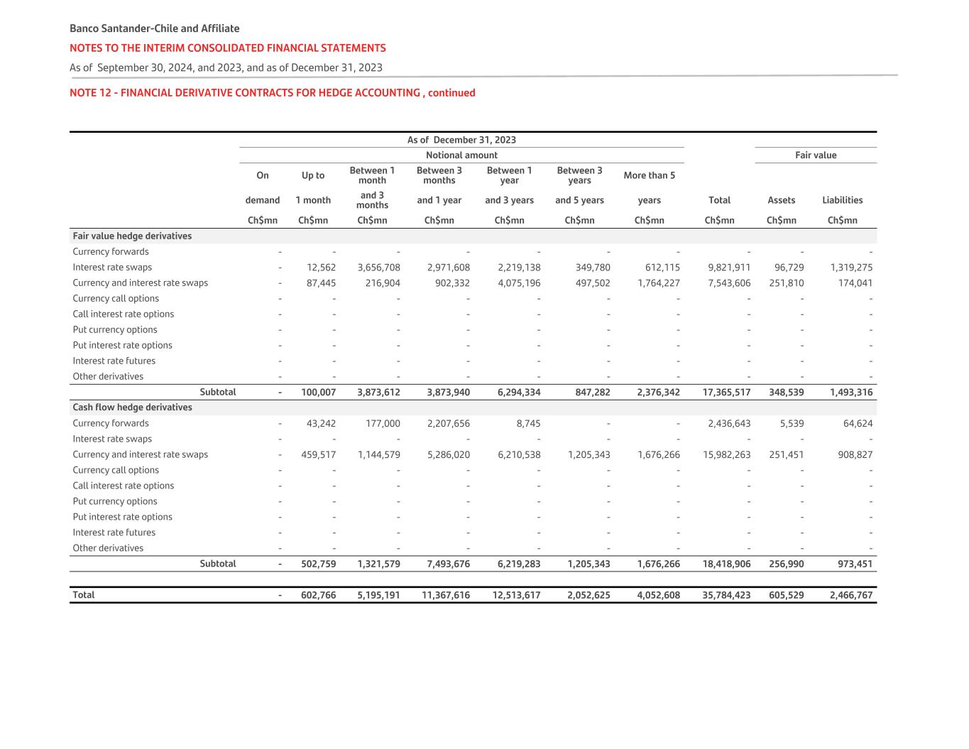 NOTE 12 - FINANCIAL DERIVATIVE CONTRACTS FOR HEDGE ACCOUNTING , continued   As of December 31, 2023       Notional amount Fair value On Up to Between 1 month Between 3 months Between 1 year Between 3 years More than 5 demand 1 month and 3 months and 1 year and 3 years and 5 years years Total Assets Liabilities Ch$mn Ch$mn Ch$mn Ch$mn Ch$mn Ch$mn Ch$mn Ch$mn Ch$mn Ch$mn Fair value hedge derivatives                 Currency forwards - - - - - - - - - - Interest rate swaps - 12,562 3,656,708 2,971,608 2,219,138 349,780 612,115 9,821,911 96,729 1,319,275 Currency and interest rate swaps - 87,445 216,904 902,332 4,075,196 497,502 1,764,227 7,543,606 251,810 174,041 Currency call options - - - - - - - - - - Call interest rate options - - - - - - - - - - Put currency options - - - - - - - - - - Put interest rate options - - - - - - - - - - Interest rate futures - - - - - - - - - - Other derivatives - - - - - - - - - - Subtotal - 100,007 3,873,612 3,873,940 6,294,334 847,282 2,376,342 17,365,517 348,539 1,493,316 Cash flow hedge derivatives Currency forwards - 43,242 177,000 2,207,656 8,745 - - 2,436,643 5,539 64,624 Interest rate swaps - - - - - - - - - - Currency and interest rate swaps - 459,517 1,144,579 5,286,020 6,210,538 1,205,343 1,676,266 15,982,263 251,451 908,827 Currency call options - - - - - - - - - - Call interest rate options - - - - - - - - - - Put currency options - - - - - - - - - - Put interest rate options - - - - - - - - - - Interest rate futures - - - - - - - - - - Other derivatives - - - - - - - - - - Subtotal - 502,759 1,321,579 7,493,676 6,219,283 1,205,343 1,676,266 18,418,906 256,990 973,451 Total - 602,766 5,195,191 11,367,616 12,513,617 2,052,625 4,052,608 35,784,423 605,529 2,466,767 Banco Santander-Chile and Affiliate NOTES TO THE INTERIM CONSOLIDATED FINANCIAL STATEMENTS As of September 30, 2024, and 2023, and as of December 31, 2023
