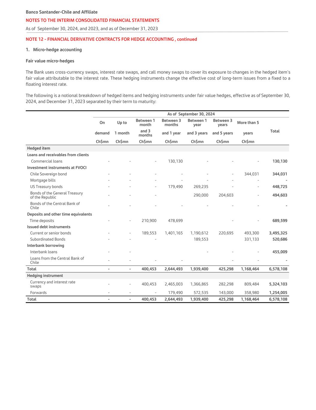 NOTE 12 - FINANCIAL DERIVATIVE CONTRACTS FOR HEDGE ACCOUNTING , continued 1. Micro-hedge accounting Fair value micro-hedges The Bank uses cross-currency swaps, interest rate swaps, and call money swaps to cover its exposure to changes in the hedged item's fair value attributable to the interest rate. These hedging instruments change the effective cost of long-term issues from a fixed to a floating interest rate. The following is a notional breakdown of hedged items and hedging instruments under fair value hedges, effective as of September 30, 2024, and December 31, 2023 separated by their term to maturity:   As of September 30, 2024 On Up to Between 1 month Between 3 months Between 1 year Between 3 years More than 5 Totaldemand 1 month and 3 months and 1 year and 3 years and 5 years years     Ch$mn Ch$mn Ch$mn Ch$mn Ch$mn Ch$mn Ch$mn Hedged item Loans and receivables from clients Commercial loans - - - 130,130 - - - 130,130 Investment instruments at FVOCI Chile Sovereign bond - - - - - - 344,031 344,031 Mortgage bills - - - - - - - - US Treasury bonds - - - 179,490 269,235 - - 448,725 Bonds of the General Treasury of the Republic - - - 290,000 204,603 - 494,603 Bonds of the Central Bank of Chile - - - - - - - - Deposits and other time equivalents Time deposits - - 210,900 478,699 - - 689,599 Issued debt instruments Current or senior bonds - - 189,553 1,401,165 1,190,612 220,695 493,300 3,495,325 Subordinated Bonds - - - 189,553 331,133 520,686 Interbank borrowing Interbank loans   - - - - - 455,009 Loans from the Central Bank of Chile - - - - - - - Total   - - 400,453 2,644,493 1,939,400 425,298 1,168,464 6,578,108 Hedging instrument Currency and interest rate swaps - - 400,453 2,465,003 1,366,865 282,298 809,484 5,324,103 Forwards - - - 179,490 572,535 143,000 358,980 1,254,005 Total - - 400,453 2,644,493 1,939,400 425,298 1,168,464 6,578,108 Banco Santander-Chile and Affiliate NOTES TO THE INTERIM CONSOLIDATED FINANCIAL STATEMENTS As of September 30, 2024, and 2023, and as of December 31, 2023