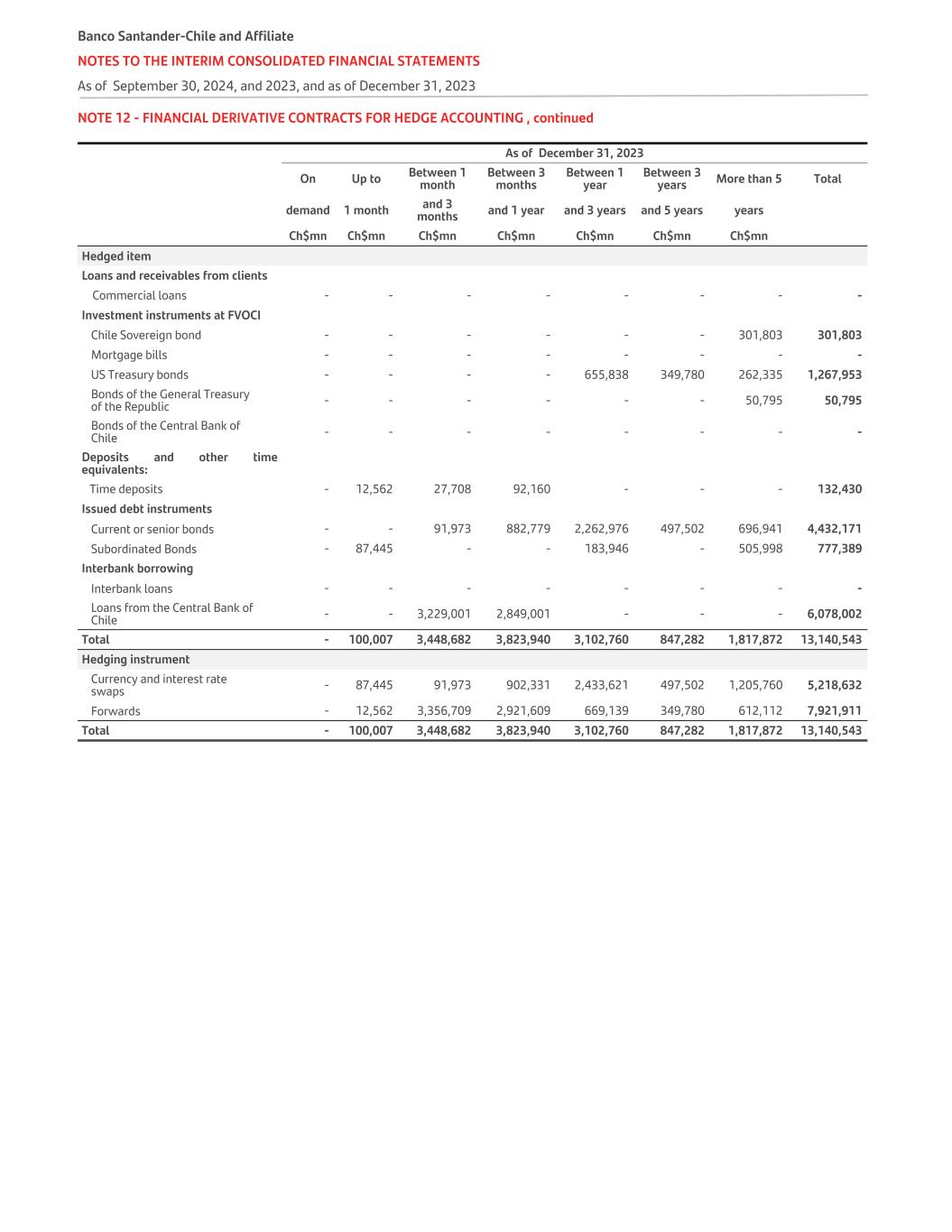 NOTE 12 - FINANCIAL DERIVATIVE CONTRACTS FOR HEDGE ACCOUNTING , continued   As of December 31, 2023 On Up to Between 1 month Between 3 months Between 1 year Between 3 years More than 5 Total demand 1 month and 3 months and 1 year and 3 years and 5 years years     Ch$mn Ch$mn Ch$mn Ch$mn Ch$mn Ch$mn Ch$mn   Hedged item Loans and receivables from clients Commercial loans - - - - - - - - Investment instruments at FVOCI Chile Sovereign bond - - - - - - 301,803 301,803 Mortgage bills - - - - - - - - US Treasury bonds - - - - 655,838 349,780 262,335 1,267,953 Bonds of the General Treasury of the Republic - - - - - - 50,795 50,795 Bonds of the Central Bank of Chile - - - - - - - - Deposits and other time equivalents: Time deposits - 12,562 27,708 92,160 - - - 132,430 Issued debt instruments Current or senior bonds - - 91,973 882,779 2,262,976 497,502 696,941 4,432,171 Subordinated Bonds - 87,445 - - 183,946 - 505,998 777,389 Interbank borrowing Interbank loans   - - - - - - - - Loans from the Central Bank of Chile - - 3,229,001 2,849,001 - - - 6,078,002 Total   - 100,007 3,448,682 3,823,940 3,102,760 847,282 1,817,872 13,140,543 Hedging instrument Currency and interest rate swaps - 87,445 91,973 902,331 2,433,621 497,502 1,205,760 5,218,632 Forwards - 12,562 3,356,709 2,921,609 669,139 349,780 612,112 7,921,911 Total - 100,007 3,448,682 3,823,940 3,102,760 847,282 1,817,872 13,140,543 Banco Santander-Chile and Affiliate NOTES TO THE INTERIM CONSOLIDATED FINANCIAL STATEMENTS As of September 30, 2024, and 2023, and as of December 31, 2023