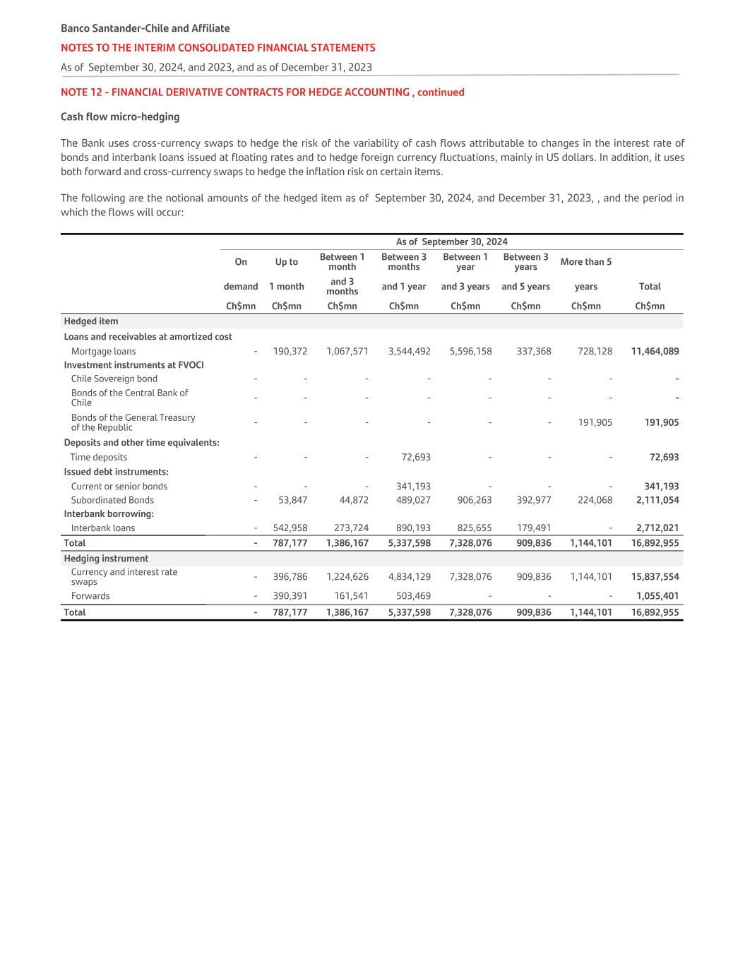 NOTE 12 - FINANCIAL DERIVATIVE CONTRACTS FOR HEDGE ACCOUNTING , continued Cash flow micro-hedging The Bank uses cross-currency swaps to hedge the risk of the variability of cash flows attributable to changes in the interest rate of bonds and interbank loans issued at floating rates and to hedge foreign currency fluctuations, mainly in US dollars. In addition, it uses both forward and cross-currency swaps to hedge the inflation risk on certain items. The following are the notional amounts of the hedged item as of September 30, 2024, and December 31, 2023, , and the period in which the flows will occur:   As of September 30, 2024 On Up to Between 1 month Between 3 months Between 1 year Between 3 years More than 5 demand 1 month and 3 months and 1 year and 3 years and 5 years years Total     Ch$mn Ch$mn Ch$mn Ch$mn Ch$mn Ch$mn Ch$mn Ch$mn Hedged item Loans and receivables at amortized cost Mortgage loans - 190,372 1,067,571 3,544,492 5,596,158 337,368 728,128 11,464,089 Investment instruments at FVOCI Chile Sovereign bond - - - - - - - - Bonds of the Central Bank of Chile - - - - - - - - Bonds of the General Treasury of the Republic - - - - - - 191,905 191,905 Deposits and other time equivalents: Time deposits - - - 72,693 - - - 72,693 Issued debt instruments: Current or senior bonds - - - 341,193 - - - 341,193 Subordinated Bonds - 53,847 44,872 489,027 906,263 392,977 224,068 2,111,054 Interbank borrowing: Interbank loans   - 542,958 273,724 890,193 825,655 179,491 - 2,712,021 Total   - 787,177 1,386,167 5,337,598 7,328,076 909,836 1,144,101 16,892,955 Hedging instrument Currency and interest rate swaps - 396,786 1,224,626 4,834,129 7,328,076 909,836 1,144,101 15,837,554 Forwards   - 390,391 161,541 503,469 - - - 1,055,401 Total   - 787,177 1,386,167 5,337,598 7,328,076 909,836 1,144,101 16,892,955 Banco Santander-Chile and Affiliate NOTES TO THE INTERIM CONSOLIDATED FINANCIAL STATEMENTS As of September 30, 2024, and 2023, and as of December 31, 2023