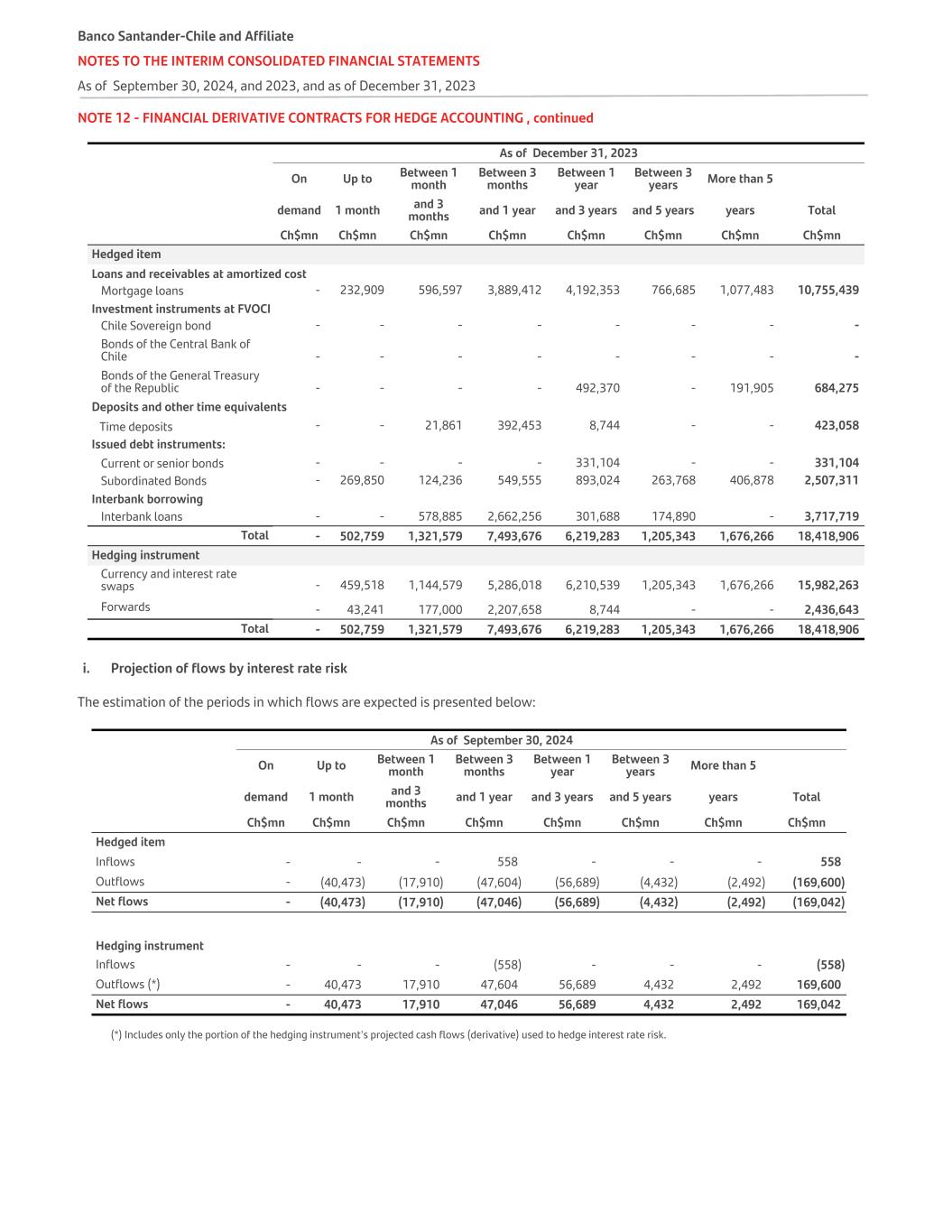 NOTE 12 - FINANCIAL DERIVATIVE CONTRACTS FOR HEDGE ACCOUNTING , continued   As of December 31, 2023 On Up to Between 1 month Between 3 months Between 1 year Between 3 years More than 5 demand 1 month and 3 months and 1 year and 3 years and 5 years years Total   Ch$mn Ch$mn Ch$mn Ch$mn Ch$mn Ch$mn Ch$mn Ch$mn Hedged item Loans and receivables at amortized cost Mortgage loans - 232,909 596,597 3,889,412 4,192,353 766,685 1,077,483 10,755,439 Investment instruments at FVOCI Chile Sovereign bond - - - - - - - - Bonds of the Central Bank of Chile - - - - - - - - Bonds of the General Treasury of the Republic - - - - 492,370 - 191,905 684,275 Deposits and other time equivalents Time deposits - - 21,861 392,453 8,744 - - 423,058 Issued debt instruments: Current or senior bonds - - - - 331,104 - - 331,104 Subordinated Bonds - 269,850 124,236 549,555 893,024 263,768 406,878 2,507,311 Interbank borrowing Interbank loans - - 578,885 2,662,256 301,688 174,890 - 3,717,719 Total - 502,759 1,321,579 7,493,676 6,219,283 1,205,343 1,676,266 18,418,906 Hedging instrument Currency and interest rate swaps - 459,518 1,144,579 5,286,018 6,210,539 1,205,343 1,676,266 15,982,263 Forwards - 43,241 177,000 2,207,658 8,744 - - 2,436,643 Total - 502,759 1,321,579 7,493,676 6,219,283 1,205,343 1,676,266 18,418,906 i. Projection of flows by interest rate risk The estimation of the periods in which flows are expected is presented below:   As of September 30, 2024   On Up to Between 1 month Between 3 months Between 1 year Between 3 years More than 5 demand 1 month and 3 months and 1 year and 3 years and 5 years years Total   Ch$mn Ch$mn Ch$mn Ch$mn Ch$mn Ch$mn Ch$mn Ch$mn Hedged item Inflows - - - 558 - - - 558 Outflows - (40,473) (17,910) (47,604) (56,689) (4,432) (2,492) (169,600) Net flows - (40,473) (17,910) (47,046) (56,689) (4,432) (2,492) (169,042) Hedging instrument Inflows - - - (558) - - - (558) Outflows (*) - 40,473 17,910 47,604 56,689 4,432 2,492 169,600 Net flows - 40,473 17,910 47,046 56,689 4,432 2,492 169,042 (*) Includes only the portion of the hedging instrument's projected cash flows (derivative) used to hedge interest rate risk. Banco Santander-Chile and Affiliate NOTES TO THE INTERIM CONSOLIDATED FINANCIAL STATEMENTS As of September 30, 2024, and 2023, and as of December 31, 2023