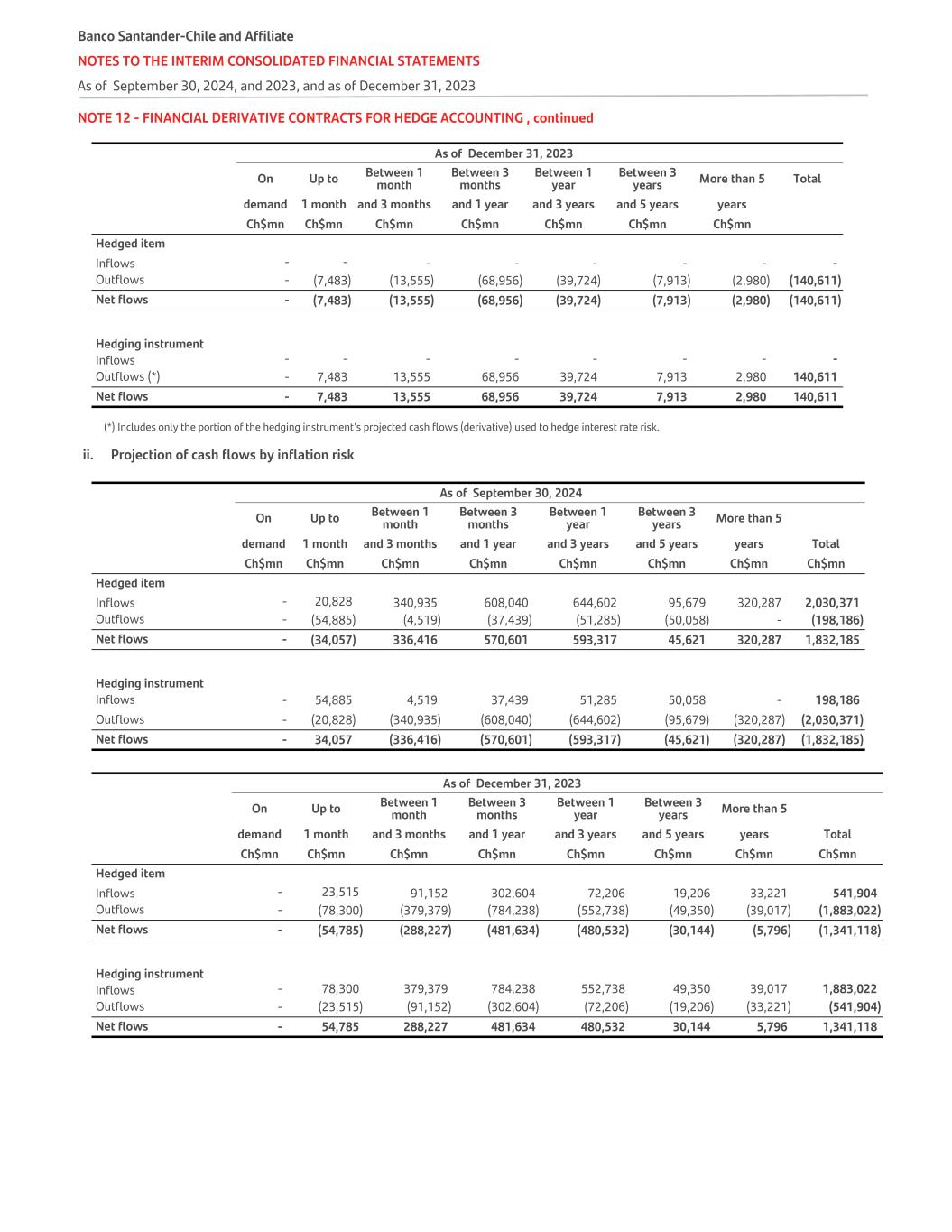NOTE 12 - FINANCIAL DERIVATIVE CONTRACTS FOR HEDGE ACCOUNTING , continued   As of December 31, 2023 On Up to Between 1 month Between 3 months Between 1 year Between 3 years More than 5 Total demand 1 month and 3 months and 1 year and 3 years and 5 years years   Ch$mn Ch$mn Ch$mn Ch$mn Ch$mn Ch$mn Ch$mn Hedged item Inflows - - - - - - - - Outflows - (7,483) (13,555) (68,956) (39,724) (7,913) (2,980) (140,611) Net flows - (7,483) (13,555) (68,956) (39,724) (7,913) (2,980) (140,611) Hedging instrument Inflows - - - - - - - - Outflows (*) - 7,483 13,555 68,956 39,724 7,913 2,980 140,611 Net flows - 7,483 13,555 68,956 39,724 7,913 2,980 140,611 (*) Includes only the portion of the hedging instrument's projected cash flows (derivative) used to hedge interest rate risk. ii. Projection of cash flows by inflation risk   As of September 30, 2024 On Up to Between 1 month Between 3 months Between 1 year Between 3 years More than 5 demand 1 month and 3 months and 1 year and 3 years and 5 years years Total   Ch$mn Ch$mn Ch$mn Ch$mn Ch$mn Ch$mn Ch$mn Ch$mn Hedged item           Inflows - 20,828 340,935 608,040 644,602 95,679 320,287 2,030,371 Outflows - (54,885) (4,519) (37,439) (51,285) (50,058) - (198,186) Net flows - (34,057) 336,416 570,601 593,317 45,621 320,287 1,832,185 Hedging instrument Inflows - 54,885 4,519 37,439 51,285 50,058 - 198,186 Outflows - (20,828) (340,935) (608,040) (644,602) (95,679) (320,287) (2,030,371) Net flows - 34,057 (336,416) (570,601) (593,317) (45,621) (320,287) (1,832,185)   As of December 31, 2023   On Up to Between 1 month Between 3 months Between 1 year Between 3 years More than 5 demand 1 month and 3 months and 1 year and 3 years and 5 years years Total   Ch$mn Ch$mn Ch$mn Ch$mn Ch$mn Ch$mn Ch$mn Ch$mn Hedged item           Inflows - 23,515 91,152 302,604 72,206 19,206 33,221 541,904 Outflows - (78,300) (379,379) (784,238) (552,738) (49,350) (39,017) (1,883,022) Net flows - (54,785) (288,227) (481,634) (480,532) (30,144) (5,796) (1,341,118) Hedging instrument Inflows - 78,300 379,379 784,238 552,738 49,350 39,017 1,883,022 Outflows - (23,515) (91,152) (302,604) (72,206) (19,206) (33,221) (541,904) Net flows - 54,785 288,227 481,634 480,532 30,144 5,796 1,341,118 Banco Santander-Chile and Affiliate NOTES TO THE INTERIM CONSOLIDATED FINANCIAL STATEMENTS As of September 30, 2024, and 2023, and as of December 31, 2023