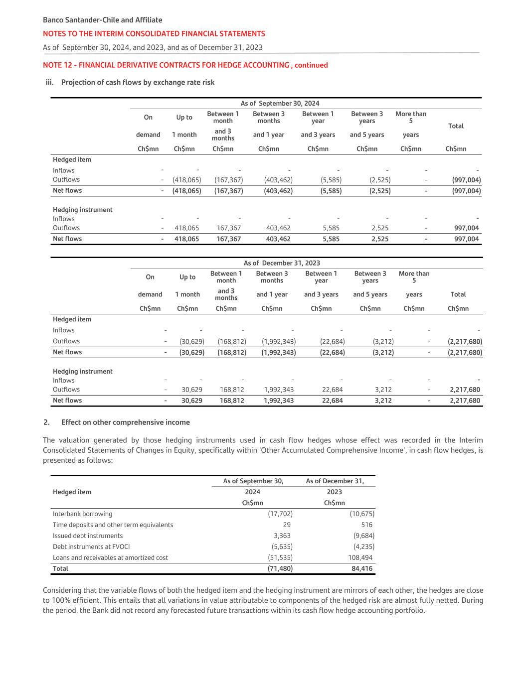 NOTE 12 - FINANCIAL DERIVATIVE CONTRACTS FOR HEDGE ACCOUNTING , continued iii. Projection of cash flows by exchange rate risk   As of September 30, 2024   On Up to Between 1 month Between 3 months Between 1 year Between 3 years More than 5 Total demand 1 month and 3 months and 1 year and 3 years and 5 years years   Ch$mn Ch$mn Ch$mn Ch$mn Ch$mn Ch$mn Ch$mn Ch$mn Hedged item           Inflows - - - - - - - - Outflows - (418,065) (167,367) (403,462) (5,585) (2,525) - (997,004) Net flows - (418,065) (167,367) (403,462) (5,585) (2,525) - (997,004) Hedging instrument Inflows - - - - - - - - Outflows - 418,065 167,367 403,462 5,585 2,525 - 997,004 Net flows - 418,065 167,367 403,462 5,585 2,525 - 997,004   As of December 31, 2023   On Up to Between 1 month Between 3 months Between 1 year Between 3 years More than 5 demand 1 month and 3 months and 1 year and 3 years and 5 years years Total   Ch$mn Ch$mn Ch$mn Ch$mn Ch$mn Ch$mn Ch$mn Ch$mn Hedged item           Inflows - - - - - - - - Outflows - (30,629) (168,812) (1,992,343) (22,684) (3,212) - (2,217,680) Net flows - (30,629) (168,812) (1,992,343) (22,684) (3,212) - (2,217,680) Hedging instrument Inflows - - - - - - - - Outflows - 30,629 168,812 1,992,343 22,684 3,212 - 2,217,680 Net flows - 30,629 168,812 1,992,343 22,684 3,212 - 2,217,680 2. Effect on other comprehensive income The valuation generated by those hedging instruments used in cash flow hedges whose effect was recorded in the Interim Consolidated Statements of Changes in Equity, specifically within 'Other Accumulated Comprehensive Income', in cash flow hedges, is presented as follows: As of September 30, As of December 31, Hedged item 2024 2023 Ch$mn Ch$mn Interbank borrowing (17,702) (10,675) Time deposits and other term equivalents 29 516 Issued debt instruments 3,363 (9,684) Debt instruments at FVOCI (5,635) (4,235) Loans and receivables at amortized cost (51,535) 108,494 Total (71,480) 84,416 Considering that the variable flows of both the hedged item and the hedging instrument are mirrors of each other, the hedges are close to 100% efficient. This entails that all variations in value attributable to components of the hedged risk are almost fully netted. During the period, the Bank did not record any forecasted future transactions within its cash flow hedge accounting portfolio. Banco Santander-Chile and Affiliate NOTES TO THE INTERIM CONSOLIDATED FINANCIAL STATEMENTS As of September 30, 2024, and 2023, and as of December 31, 2023