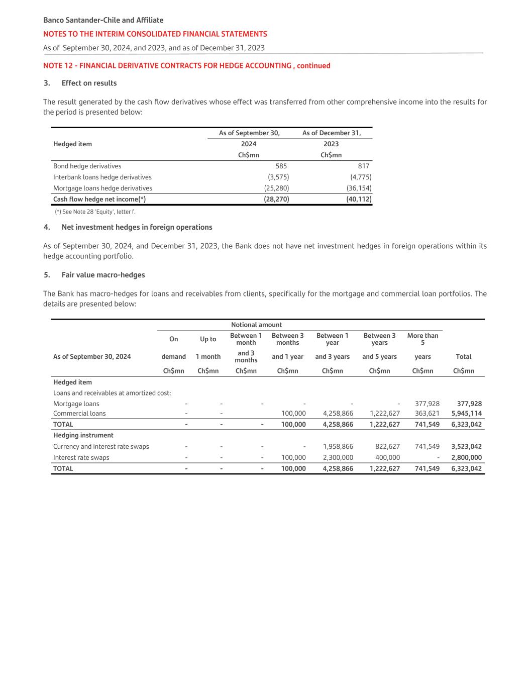 NOTE 12 - FINANCIAL DERIVATIVE CONTRACTS FOR HEDGE ACCOUNTING , continued 3. Effect on results The result generated by the cash flow derivatives whose effect was transferred from other comprehensive income into the results for the period is presented below: As of September 30, As of December 31, Hedged item 2024 2023 Ch$mn Ch$mn Bond hedge derivatives 585 817 Interbank loans hedge derivatives (3,575) (4,775) Mortgage loans hedge derivatives (25,280) (36,154) Cash flow hedge net income(*) (28,270) (40,112) (*) See Note 28 'Equity', letter f. 4. Net investment hedges in foreign operations As of September 30, 2024, and December 31, 2023, the Bank does not have net investment hedges in foreign operations within its hedge accounting portfolio. 5. Fair value macro-hedges The Bank has macro-hedges for loans and receivables from clients, specifically for the mortgage and commercial loan portfolios. The details are presented below:   Notional amount       On Up to Between 1 month Between 3 months Between 1 year Between 3 years More than 5 As of September 30, 2024 demand 1 month and 3 months and 1 year and 3 years and 5 years years Total   Ch$mn Ch$mn Ch$mn Ch$mn Ch$mn Ch$mn Ch$mn Ch$mn Hedged item Loans and receivables at amortized cost: Mortgage loans - - - - - - 377,928 377,928 Commercial loans - - 100,000 4,258,866 1,222,627 363,621 5,945,114 TOTAL - - - 100,000 4,258,866 1,222,627 741,549 6,323,042 Hedging instrument Currency and interest rate swaps - - - - 1,958,866 822,627 741,549 3,523,042 Interest rate swaps - - - 100,000 2,300,000 400,000 - 2,800,000 TOTAL - - - 100,000 4,258,866 1,222,627 741,549 6,323,042 Banco Santander-Chile and Affiliate NOTES TO THE INTERIM CONSOLIDATED FINANCIAL STATEMENTS As of September 30, 2024, and 2023, and as of December 31, 2023