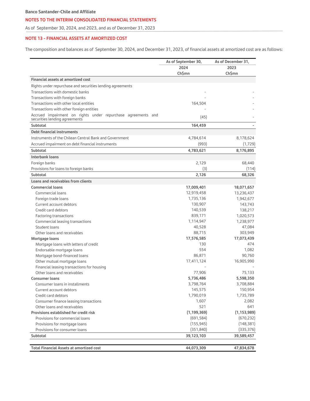 NOTE 13 - FINANCIAL ASSETS AT AMORTIZED COST The composition and balances as of September 30, 2024, and December 31, 2023, of financial assets at amortized cost are as follows:   As of September 30, As of December 31, 2024 2023 Ch$mn Ch$mn Financial assets at amortized cost     Rights under repurchase and securities lending agreements Transactions with domestic banks - - Transactions with foreign banks - - Transactions with other local entities 164,504 - Transactions with other foreign entities - - Accrued impairment on rights under repurchase agreements and securities lending agreements (45) - Subtotal 164,459 - Debt financial instruments Instruments of the Chilean Central Bank and Government 4,784,614 8,178,624 Accrued impairment on debt financial instruments (993) (1,729) Subtotal 4,783,621 8,176,895 Interbank loans Foreign banks 2,129 68,440 Provisions for loans to foreign banks (3) (114) Subtotal 2,126 68,326 Loans and receivables from clients Commercial loans 17,009,401 18,071,657 Commercial loans 12,919,458 13,236,437 Foreign trade loans 1,735,136 1,942,677 Current account debtors 130,907 143,743 Credit card debtors 140,539 138,217 Factoring transactions 839,171 1,020,573 Commercial leasing transactions 1,114,947 1,238,977 Student loans 40,528 47,084 Other loans and receivables 88,715 303,949 Mortgage loans 17,576,585 17,073,439 Mortgage loans with letters of credit 130 474 Endorsable mortgage loans 554 1,082 Mortgage bond-financed loans 86,871 90,760 Other mutual mortgage loans 17,411,124 16,905,990 Financial leasing transactions for housing - - Other loans and receivables 77,906 75,133 Consumer loans 5,736,486 5,598,350 Consumer loans in installments 3,798,764 3,708,884 Current account debtors 145,575 150,954 Credit card debtors 1,790,019 1,735,789 Consumer finance leasing transactions 1,607 2,082 Other loans and receivables 521 641 Provisions established for credit risk (1,199,369) (1,153,989) Provisions for commercial loans (691,584) (670,232) Provisions for mortgage loans (155,945) (148,381) Provisions for consumer loans (351,840) (335,376) Subtotal 39,123,103 39,589,457 Total Financial Assets at amortized cost 44,073,309 47,834,678 Banco Santander-Chile and Affiliate NOTES TO THE INTERIM CONSOLIDATED FINANCIAL STATEMENTS As of September 30, 2024, and 2023, and as of December 31, 2023