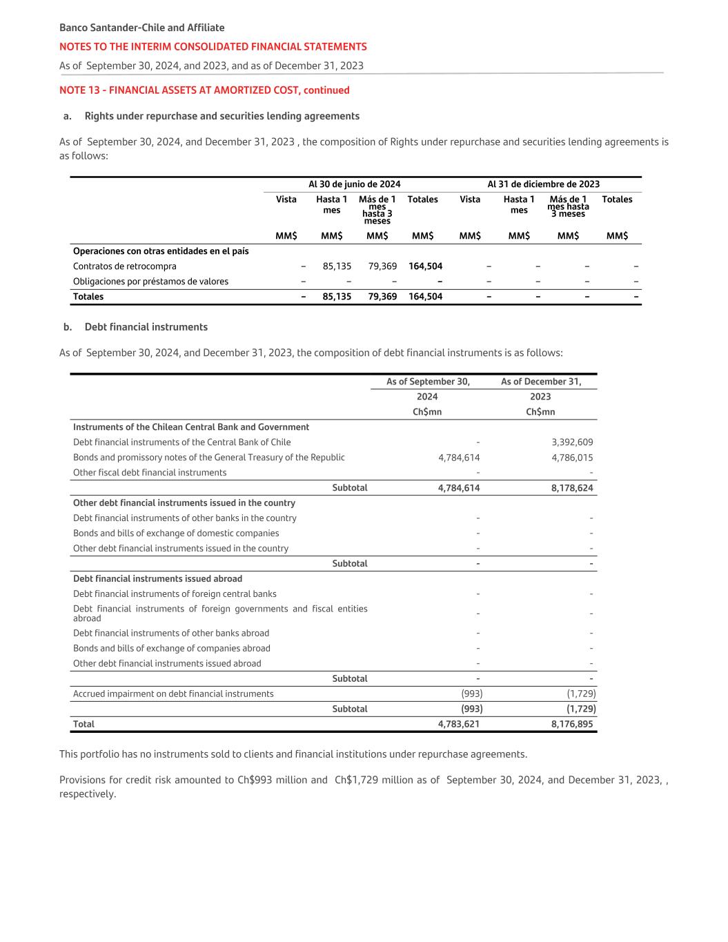 NOTE 13 - FINANCIAL ASSETS AT AMORTIZED COST, continued a. Rights under repurchase and securities lending agreements As of September 30, 2024, and December 31, 2023 , the composition of Rights under repurchase and securities lending agreements is as follows: Al 30 de junio de 2024 Al 31 de diciembre de 2023 Vista Hasta 1 mes Más de 1 mes hasta 3 meses Totales Vista Hasta 1 mes Más de 1 mes hasta 3 meses Totales MM$ MM$ MM$ MM$ MM$ MM$ MM$ MM$ Operaciones con otras entidades en el país Contratos de retrocompra – 85,135 79,369 164,504 – – – – Obligaciones por préstamos de valores – – – – – – – – Totales – 85,135 79,369 164,504 – – – – b. Debt financial instruments As of September 30, 2024, and December 31, 2023, the composition of debt financial instruments is as follows:   As of September 30, As of December 31, 2024 2023   Ch$mn Ch$mn Instruments of the Chilean Central Bank and Government   Debt financial instruments of the Central Bank of Chile - 3,392,609 Bonds and promissory notes of the General Treasury of the Republic 4,784,614 4,786,015 Other fiscal debt financial instruments - - Subtotal 4,784,614 8,178,624 Other debt financial instruments issued in the country Debt financial instruments of other banks in the country - - Bonds and bills of exchange of domestic companies - - Other debt financial instruments issued in the country - - Subtotal - - Debt financial instruments issued abroad Debt financial instruments of foreign central banks - - Debt financial instruments of foreign governments and fiscal entities abroad - - Debt financial instruments of other banks abroad - - Bonds and bills of exchange of companies abroad - - Other debt financial instruments issued abroad - - Subtotal - - Accrued impairment on debt financial instruments (993) (1,729) Subtotal (993) (1,729) Total 4,783,621 8,176,895 This portfolio has no instruments sold to clients and financial institutions under repurchase agreements. Provisions for credit risk amounted to Ch$993 million and Ch$1,729 million as of September 30, 2024, and December 31, 2023, , respectively. Banco Santander-Chile and Affiliate NOTES TO THE INTERIM CONSOLIDATED FINANCIAL STATEMENTS As of September 30, 2024, and 2023, and as of December 31, 2023