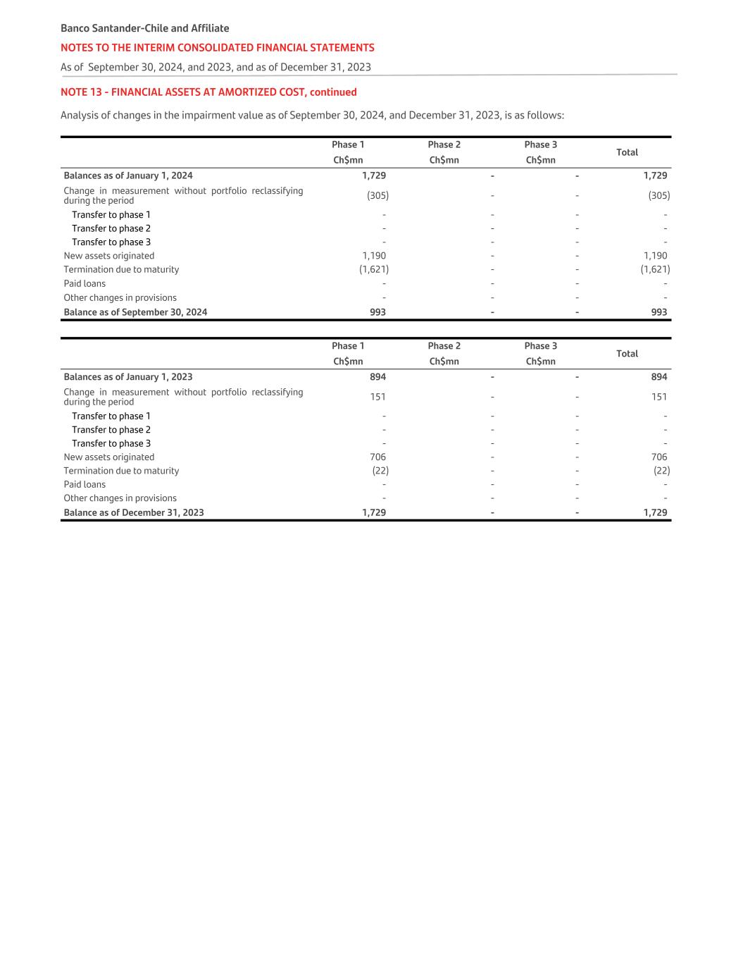 NOTE 13 - FINANCIAL ASSETS AT AMORTIZED COST, continued Analysis of changes in the impairment value as of September 30, 2024, and December 31, 2023, is as follows:   Phase 1 Phase 2 Phase 3 Total Ch$mn Ch$mn Ch$mn Balances as of January 1, 2024 1,729 - - 1,729 Change in measurement without portfolio reclassifying during the period (305) - - (305) Transfer to phase 1 - - - - Transfer to phase 2 - - - - Transfer to phase 3 - - - - New assets originated 1,190 - - 1,190 Termination due to maturity (1,621) - - (1,621) Paid loans - - - - Other changes in provisions - - - - Balance as of September 30, 2024 993 - - 993   Phase 1 Phase 2 Phase 3 Total Ch$mn Ch$mn Ch$mn Balances as of January 1, 2023 894 - - 894 Change in measurement without portfolio reclassifying during the period 151 - - 151 Transfer to phase 1 - - - - Transfer to phase 2 - - - - Transfer to phase 3 - - - - New assets originated 706 - - 706 Termination due to maturity (22) - - (22) Paid loans - - - - Other changes in provisions - - - - Balance as of December 31, 2023 1,729 - - 1,729 Banco Santander-Chile and Affiliate NOTES TO THE INTERIM CONSOLIDATED FINANCIAL STATEMENTS As of September 30, 2024, and 2023, and as of December 31, 2023