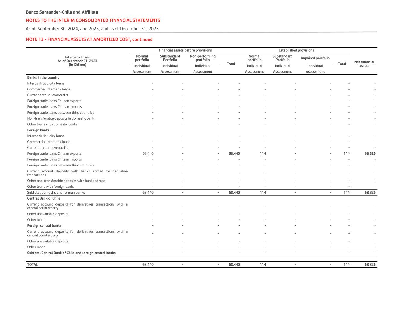 NOTE 13 - FINANCIAL ASSETS AT AMORTIZED COST, continued Interbank loans As of December 31, 2023 (In Ch$mn) Financial assets before provisions Established provisions Normal portfolio Substandard Portfolio Non-performing portfolio Total Normal portfolio Substandard Portfolio Impaired portfolio Total Net financial assetsIndividual Individual Individual Individual Individual Individual Assessment Assessment Assessment Assessment Assessment Assessment Banks in the country Interbank liquidity loans - - - - - - - - - Commercial interbank loans - - - - - - - - - Current account overdrafts - - - - - - - - - Foreign trade loans Chilean exports - - - - - - - - - Foreign trade loans Chilean imports - - - - - - - - - Foreign trade loans between third countries - - - - - - - - - Non-transferable deposits in domestic bank - - - - - - - - - Other loans with domestic banks - - - - - - - - - Foreign banks Interbank liquidity loans - - - - - - - - - Commercial interbank loans - - - - - - - - - Current account overdrafts - - - - - - - - - Foreign trade loans Chilean exports 68,440 - - 68,440 114 - - 114 68,326 Foreign trade loans Chilean imports - - - - - - - - - Foreign trade loans between third countries - - - - - - - - - Current account deposits with banks abroad for derivative transactions - - - - - - - - - Other non-transferable deposits with banks abroad - - - - - - - - - Other loans with foreign banks - - - - - - - - - Subtotal domestic and foreign banks 68,440 - - 68,440 114 - - 114 68,326 Central Bank of Chile Current account deposits for derivatives transactions with a central counterparty - - - - - - - - - Other unavailable deposits - - - - - - - - - Other loans - - - - - - - - - Foreign central banks - - - - - - - - - Current account deposits for derivatives transactions with a central counterparty - - - - - - - - - Other unavailable deposits - - - - - - - - - Other loans - - - - - - - - - Subtotal Central Bank of Chile and foreign central banks - - - - - - - - - TOTAL 68,440 - - 68,440 114 - - 114 68,326 Banco Santander-Chile and Affiliate NOTES TO THE INTERIM CONSOLIDATED FINANCIAL STATEMENTS As of September 30, 2024, and 2023, and as of December 31, 2023