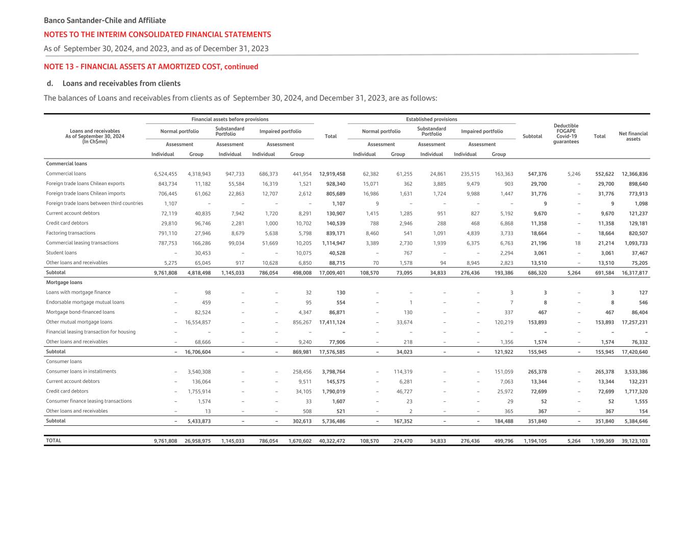 NOTE 13 - FINANCIAL ASSETS AT AMORTIZED COST, continued d. Loans and receivables from clients The balances of Loans and receivables from clients as of September 30, 2024, and December 31, 2023, are as follows: Loans and receivables As of September 30, 2024 (In Ch$mn) Financial assets before provisions Total Established provisions Subtotal Deductible FOGAPE Covid-19 guarantees Total Net financial assets Normal portfolio Substandard Portfolio Impaired portfolio Normal portfolio Substandard Portfolio Impaired portfolio Assessment Assessment Assessment Assessment Assessment Assessment Individual Group Individual Individual Group Individual Group Individual Individual Group Commercial loans Commercial loans 6,524,455 4,318,943 947,733 686,373 441,954 12,919,458 62,382 61,255 24,861 235,515 163,363 547,376 5,246 552,622 12,366,836 Foreign trade loans Chilean exports 843,734 11,182 55,584 16,319 1,521 928,340 15,071 362 3,885 9,479 903 29,700 – 29,700 898,640 Foreign trade loans Chilean imports 706,445 61,062 22,863 12,707 2,612 805,689 16,986 1,631 1,724 9,988 1,447 31,776 – 31,776 773,913 Foreign trade loans between third countries 1,107 – – – – 1,107 9 – – – – 9 – 9 1,098 Current account debtors 72,119 40,835 7,942 1,720 8,291 130,907 1,415 1,285 951 827 5,192 9,670 – 9,670 121,237 Credit card debtors 29,810 96,746 2,281 1,000 10,702 140,539 788 2,946 288 468 6,868 11,358 – 11,358 129,181 Factoring transactions 791,110 27,946 8,679 5,638 5,798 839,171 8,460 541 1,091 4,839 3,733 18,664 – 18,664 820,507 Commercial leasing transactions 787,753 166,286 99,034 51,669 10,205 1,114,947 3,389 2,730 1,939 6,375 6,763 21,196 18 21,214 1,093,733 Student loans – 30,453 – – 10,075 40,528 – 767 – – 2,294 3,061 – 3,061 37,467 Other loans and receivables 5,275 65,045 917 10,628 6,850 88,715 70 1,578 94 8,945 2,823 13,510 – 13,510 75,205 Subtotal 9,761,808 4,818,498 1,145,033 786,054 498,008 17,009,401 108,570 73,095 34,833 276,436 193,386 686,320 5,264 691,584 16,317,817 Mortgage loans Loans with mortgage finance – 98 – – 32 130 – – – – 3 3 – 3 127 Endorsable mortgage mutual loans – 459 – – 95 554 – 1 – – 7 8 – 8 546 Mortgage bond-financed loans – 82,524 – – 4,347 86,871 – 130 – – 337 467 – 467 86,404 Other mutual mortgage loans – 16,554,857 – – 856,267 17,411,124 – 33,674 – – 120,219 153,893 – 153,893 17,257,231 Financial leasing transaction for housing – – – – – – – – – – – – – – – Other loans and receivables – 68,666 – – 9,240 77,906 – 218 – – 1,356 1,574 – 1,574 76,332 Subtotal – 16,706,604 – – 869,981 17,576,585 – 34,023 – – 121,922 155,945 – 155,945 17,420,640 Consumer loans Consumer loans in installments – 3,540,308 – – 258,456 3,798,764 – 114,319 – – 151,059 265,378 – 265,378 3,533,386 Current account debtors – 136,064 – – 9,511 145,575 – 6,281 – – 7,063 13,344 – 13,344 132,231 Credit card debtors – 1,755,914 – – 34,105 1,790,019 – 46,727 – – 25,972 72,699 – 72,699 1,717,320 Consumer finance leasing transactions – 1,574 – – 33 1,607 – 23 – – 29 52 – 52 1,555 Other loans and receivables – 13 – – 508 521 – 2 – – 365 367 – 367 154 Subtotal – 5,433,873 – – 302,613 5,736,486 – 167,352 – – 184,488 351,840 – 351,840 5,384,646 TOTAL 9,761,808 26,958,975 1,145,033 786,054 1,670,602 40,322,472 108,570 274,470 34,833 276,436 499,796 1,194,105 5,264 1,199,369 39,123,103 Banco Santander-Chile and Affiliate NOTES TO THE INTERIM CONSOLIDATED FINANCIAL STATEMENTS As of September 30, 2024, and 2023, and as of December 31, 2023