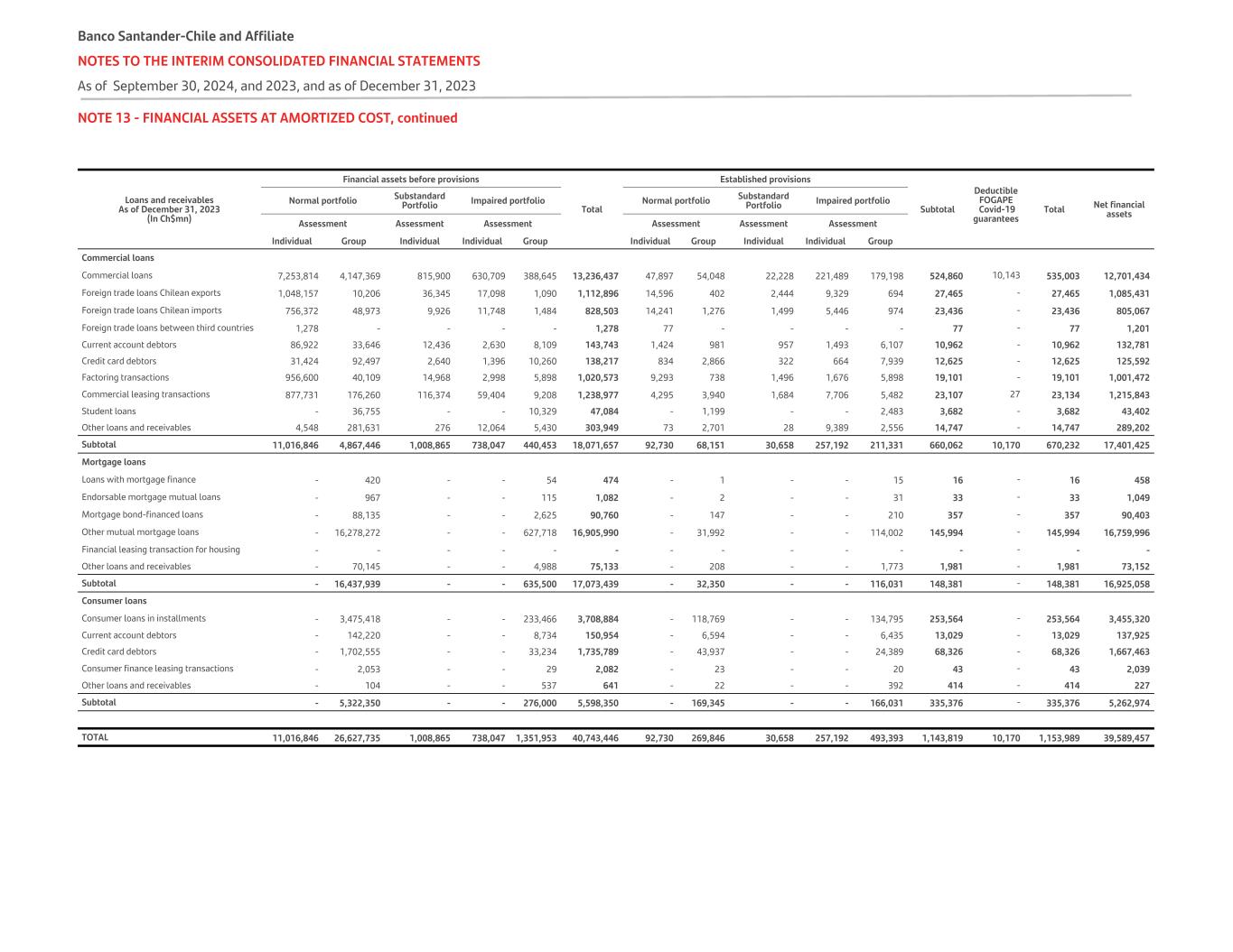 NOTE 13 - FINANCIAL ASSETS AT AMORTIZED COST, continued Loans and receivables As of December 31, 2023 (In Ch$mn) Financial assets before provisions Total Established provisions Subtotal Deductible FOGAPE Covid-19 guarantees Total Net financial assets Normal portfolio Substandard Portfolio Impaired portfolio Normal portfolio Substandard Portfolio Impaired portfolio Assessment Assessment Assessment Assessment Assessment Assessment Individual Group Individual Individual Group Individual Group Individual Individual Group Commercial loans Commercial loans 7,253,814 4,147,369 815,900 630,709 388,645 13,236,437 47,897 54,048 22,228 221,489 179,198 524,860 10,143 535,003 12,701,434 Foreign trade loans Chilean exports 1,048,157 10,206 36,345 17,098 1,090 1,112,896 14,596 402 2,444 9,329 694 27,465 - 27,465 1,085,431 Foreign trade loans Chilean imports 756,372 48,973 9,926 11,748 1,484 828,503 14,241 1,276 1,499 5,446 974 23,436 - 23,436 805,067 Foreign trade loans between third countries 1,278 - - - - 1,278 77 - - - - 77 - 77 1,201 Current account debtors 86,922 33,646 12,436 2,630 8,109 143,743 1,424 981 957 1,493 6,107 10,962 - 10,962 132,781 Credit card debtors 31,424 92,497 2,640 1,396 10,260 138,217 834 2,866 322 664 7,939 12,625 - 12,625 125,592 Factoring transactions 956,600 40,109 14,968 2,998 5,898 1,020,573 9,293 738 1,496 1,676 5,898 19,101 - 19,101 1,001,472 Commercial leasing transactions 877,731 176,260 116,374 59,404 9,208 1,238,977 4,295 3,940 1,684 7,706 5,482 23,107 27 23,134 1,215,843 Student loans - 36,755 - - 10,329 47,084 - 1,199 - - 2,483 3,682 - 3,682 43,402 Other loans and receivables 4,548 281,631 276 12,064 5,430 303,949 73 2,701 28 9,389 2,556 14,747 - 14,747 289,202 Subtotal 11,016,846 4,867,446 1,008,865 738,047 440,453 18,071,657 92,730 68,151 30,658 257,192 211,331 660,062 10,170 670,232 17,401,425 Mortgage loans Loans with mortgage finance - 420 - - 54 474 - 1 - - 15 16 - 16 458 Endorsable mortgage mutual loans - 967 - - 115 1,082 - 2 - - 31 33 - 33 1,049 Mortgage bond-financed loans - 88,135 - - 2,625 90,760 - 147 - - 210 357 - 357 90,403 Other mutual mortgage loans - 16,278,272 - - 627,718 16,905,990 - 31,992 - - 114,002 145,994 - 145,994 16,759,996 Financial leasing transaction for housing - - - - - - - - - - - - - - - Other loans and receivables - 70,145 - - 4,988 75,133 - 208 - - 1,773 1,981 - 1,981 73,152 Subtotal - 16,437,939 - - 635,500 17,073,439 - 32,350 - - 116,031 148,381 - 148,381 16,925,058 Consumer loans Consumer loans in installments - 3,475,418 - - 233,466 3,708,884 - 118,769 - - 134,795 253,564 - 253,564 3,455,320 Current account debtors - 142,220 - - 8,734 150,954 - 6,594 - - 6,435 13,029 - 13,029 137,925 Credit card debtors - 1,702,555 - - 33,234 1,735,789 - 43,937 - - 24,389 68,326 - 68,326 1,667,463 Consumer finance leasing transactions - 2,053 - - 29 2,082 - 23 - - 20 43 - 43 2,039 Other loans and receivables - 104 - - 537 641 - 22 - - 392 414 - 414 227 Subtotal - 5,322,350 - - 276,000 5,598,350 - 169,345 - - 166,031 335,376 - 335,376 5,262,974 TOTAL 11,016,846 26,627,735 1,008,865 738,047 1,351,953 40,743,446 92,730 269,846 30,658 257,192 493,393 1,143,819 10,170 1,153,989 39,589,457 Banco Santander-Chile and Affiliate NOTES TO THE INTERIM CONSOLIDATED FINANCIAL STATEMENTS As of September 30, 2024, and 2023, and as of December 31, 2023