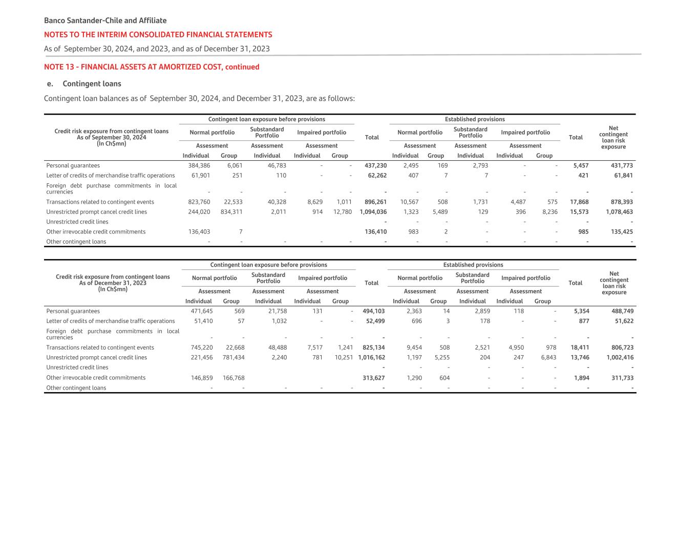 NOTE 13 - FINANCIAL ASSETS AT AMORTIZED COST, continued e. Contingent loans Contingent loan balances as of September 30, 2024, and December 31, 2023, are as follows: Credit risk exposure from contingent loans As of September 30, 2024 (In Ch$mn) Contingent loan exposure before provisions Total Established provisions Total Net contingent loan risk exposure Normal portfolio Substandard Portfolio Impaired portfolio Normal portfolio Substandard Portfolio Impaired portfolio Assessment Assessment Assessment Assessment Assessment Assessment Individual Group Individual Individual Group Individual Group Individual Individual Group Personal guarantees 384,386 6,061 46,783 - - 437,230 2,495 169 2,793 - - 5,457 431,773 Letter of credits of merchandise traffic operations 61,901 251 110 - - 62,262 407 7 7 - - 421 61,841 Foreign debt purchase commitments in local currencies - - - - - - - - - - - - - Transactions related to contingent events 823,760 22,533 40,328 8,629 1,011 896,261 10,567 508 1,731 4,487 575 17,868 878,393 Unrestricted prompt cancel credit lines 244,020 834,311 2,011 914 12,780 1,094,036 1,323 5,489 129 396 8,236 15,573 1,078,463 Unrestricted credit lines - - - - - - - - Other irrevocable credit commitments 136,403 7 136,410 983 2 - - - 985 135,425 Other contingent loans - - - - - - - - - - - - - Credit risk exposure from contingent loans As of December 31, 2023 (In Ch$mn) Contingent loan exposure before provisions Total Established provisions Total Net contingent loan risk exposure Normal portfolio Substandard Portfolio Impaired portfolio Normal portfolio Substandard Portfolio Impaired portfolio Assessment Assessment Assessment Assessment Assessment Assessment Individual Group Individual Individual Group Individual Group Individual Individual Group Personal guarantees 471,645 569 21,758 131 - 494,103 2,363 14 2,859 118 - 5,354 488,749 Letter of credits of merchandise traffic operations 51,410 57 1,032 - - 52,499 696 3 178 - - 877 51,622 Foreign debt purchase commitments in local currencies - - - - - - - - - - - - - Transactions related to contingent events 745,220 22,668 48,488 7,517 1,241 825,134 9,454 508 2,521 4,950 978 18,411 806,723 Unrestricted prompt cancel credit lines 221,456 781,434 2,240 781 10,251 1,016,162 1,197 5,255 204 247 6,843 13,746 1,002,416 Unrestricted credit lines - - - - - - - - Other irrevocable credit commitments 146,859 166,768 313,627 1,290 604 - - - 1,894 311,733 Other contingent loans - - - - - - - - - - - - - Banco Santander-Chile and Affiliate NOTES TO THE INTERIM CONSOLIDATED FINANCIAL STATEMENTS As of September 30, 2024, and 2023, and as of December 31, 2023