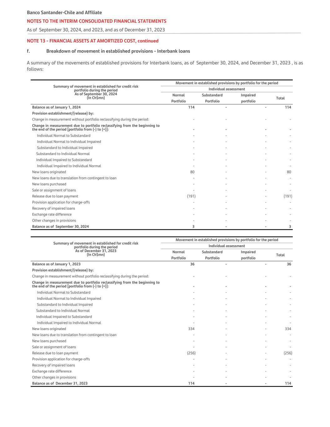 NOTE 13 - FINANCIAL ASSETS AT AMORTIZED COST, continued f. Breakdown of movement in established provisions - Interbank loans A summary of the movements of established provisions for Interbank loans, as of September 30, 2024, and December 31, 2023 , is as follows: Summary of movement in established for credit risk portfolio during the period As of September 30, 2024 (In Ch$mn) Movement in established provisions by portfolio for the period Individual assessment Normal Substandard Impaired Total Portfolio Portfolio portfolio Balance as of January 1, 2024 114 - - 114 Provision establishment/(release) by: Change in measurement without portfolio reclassifying during the period: - - - - Change in measurement due to portfolio reclassifying from the beginning to the end of the period [portfolio from (-) to (+)]: - - - - Individual Normal to Substandard - - - - Individual Normal to Individual Impaired - - - - Substandard to Individual Impaired - - - - Substandard to Individual Normal - - - - Individual Impaired to Substandard - - - - Individual Impaired to Individual Normal - - - - New loans originated 80 - - 80 New loans due to translation from contingent to loan - - - - New loans purchased - - - - Sale or assignment of loans - - - - Release due to loan payment (191) - - (191) Provision application for charge-offs - - - - Recovery of impaired loans - - - - Exchange rate difference - - - - Other changes in provisions - - - - Balance as of September 30, 2024 3 - - 3 Summary of movement in established for credit risk portfolio during the period As of December 31, 2023 (In Ch$mn) Movement in established provisions by portfolio for the period Individual assessment Normal Substandard Impaired Total Portfolio Portfolio portfolio Balance as of January 1, 2023 36 - - 36 Provision establishment/(release) by: Change in measurement without portfolio reclassifying during the period: - - - - Change in measurement due to portfolio reclassifying from the beginning to the end of the period [portfolio from (-) to (+)]: - - - - Individual Normal to Substandard - - - - Individual Normal to Individual Impaired - - - - Substandard to Individual Impaired - - - - Substandard to Individual Normal - - - - Individual Impaired to Substandard - - - - Individual Impaired to Individual Normal - - - - New loans originated 334 - - 334 New loans due to translation from contingent to loan - - - - New loans purchased - - - - Sale or assignment of loans - - - - Release due to loan payment (256) - - (256) Provision application for charge-offs - - - - Recovery of impaired loans - - - - Exchange rate difference - - - - Other changes in provisions - - - - Balance as of December 31, 2023 114 - - 114 Banco Santander-Chile and Affiliate NOTES TO THE INTERIM CONSOLIDATED FINANCIAL STATEMENTS As of September 30, 2024, and 2023, and as of December 31, 2023