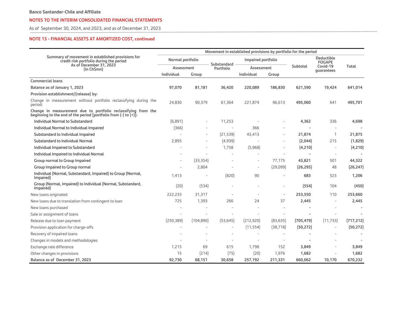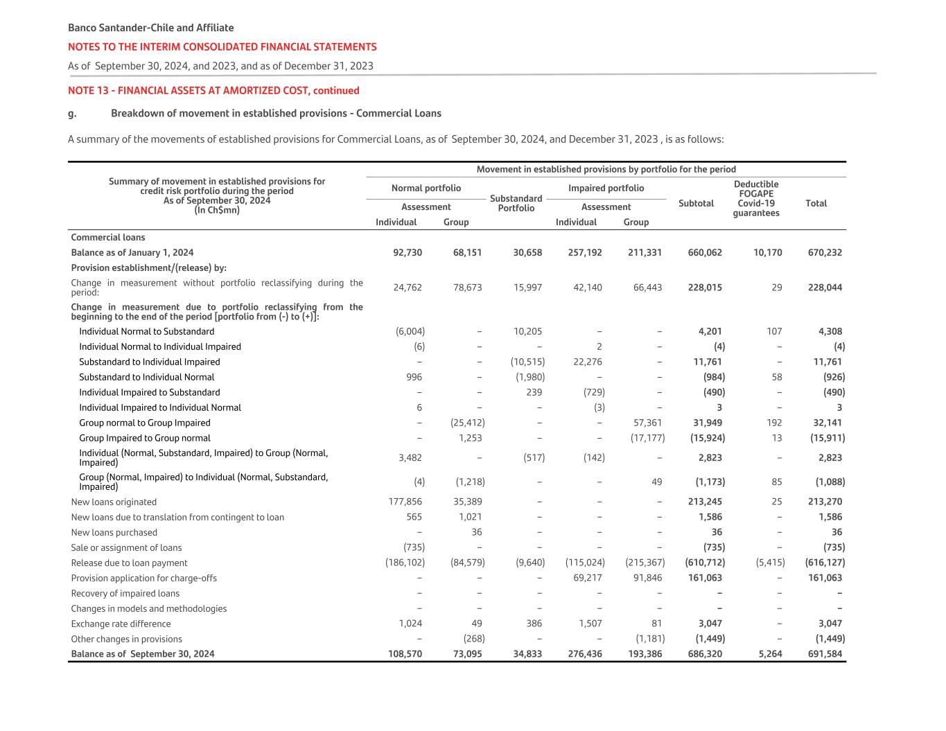 NOTE 13 - FINANCIAL ASSETS AT AMORTIZED COST, continued g. Breakdown of movement in established provisions - Commercial Loans A summary of the movements of established provisions for Commercial Loans, as of September 30, 2024, and December 31, 2023 , is as follows: Summary of movement in established provisions for credit risk portfolio during the period As of September 30, 2024 (In Ch$mn) Movement in established provisions by portfolio for the period Normal portfolio Substandard Portfolio Impaired portfolio Subtotal Deductible FOGAPE Covid-19 guarantees TotalAssessment Assessment Individual Group Individual Group Commercial loans Balance as of January 1, 2024 92,730 68,151 30,658 257,192 211,331 660,062 10,170 670,232 Provision establishment/(release) by: Change in measurement without portfolio reclassifying during the period: 24,762 78,673 15,997 42,140 66,443 228,015 29 228,044 Change in measurement due to portfolio reclassifying from the beginning to the end of the period [portfolio from (-) to (+)]: Individual Normal to Substandard (6,004) – 10,205 – – 4,201 107 4,308 Individual Normal to Individual Impaired (6) – – 2 – (4) – (4) Substandard to Individual Impaired – – (10,515) 22,276 – 11,761 – 11,761 Substandard to Individual Normal 996 – (1,980) – – (984) 58 (926) Individual Impaired to Substandard – – 239 (729) – (490) – (490) Individual Impaired to Individual Normal 6 – – (3) – 3 – 3 Group normal to Group Impaired – (25,412) – – 57,361 31,949 192 32,141 Group Impaired to Group normal – 1,253 – – (17,177) (15,924) 13 (15,911) Individual (Normal, Substandard, Impaired) to Group (Normal, Impaired) 3,482 – (517) (142) – 2,823 – 2,823 Group (Normal, Impaired) to Individual (Normal, Substandard, Impaired) (4) (1,218) – – 49 (1,173) 85 (1,088) New loans originated 177,856 35,389 – – – 213,245 25 213,270 New loans due to translation from contingent to loan 565 1,021 – – – 1,586 – 1,586 New loans purchased – 36 – – – 36 – 36 Sale or assignment of loans (735) – – – – (735) – (735) Release due to loan payment (186,102) (84,579) (9,640) (115,024) (215,367) (610,712) (5,415) (616,127) Provision application for charge-offs – – – 69,217 91,846 161,063 – 161,063 Recovery of impaired loans – – – – – – – – Changes in models and methodologies – – – – – – – – Exchange rate difference 1,024 49 386 1,507 81 3,047 – 3,047 Other changes in provisions – (268) – – (1,181) (1,449) – (1,449) Balance as of September 30, 2024 108,570 73,095 34,833 276,436 193,386 686,320 5,264 691,584 Banco Santander-Chile and Affiliate NOTES TO THE INTERIM CONSOLIDATED FINANCIAL STATEMENTS As of September 30, 2024, and 2023, and as of December 31, 2023