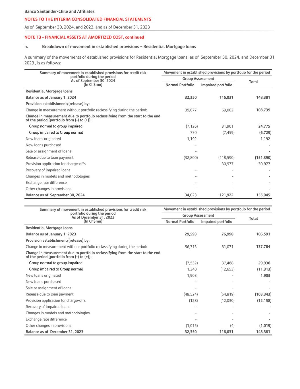 NOTE 13 - FINANCIAL ASSETS AT AMORTIZED COST, continued h. Breakdown of movement in established provisions – Residential Mortgage loans A summary of the movements of established provisions for Residential Mortgage loans, as of September 30, 2024, and December 31, 2023 , is as follows: Summary of movement in established provisions for credit risk portfolio during the period As of September 30, 2024 (In Ch$mn) Movement in established provisions by portfolio for the period Group Assessment Total Normal Portfolio Impaired portfolio Residential Mortgage loans Balance as of January 1, 2024 32,350 116,031 148,381 Provision establishment/(release) by: Change in measurement without portfolio reclassifying during the period: 39,677 69,062 108,739 Change in measurement due to portfolio reclassifying from the start to the end of the period [portfolio from (-) to (+)]: Group normal to group impaired (7,126) 31,901 24,775 Group impaired to Group normal 730 (7,459) (6,729) New loans originated 1,192 1,192 New loans purchased - - Sale or assignment of loans - - Release due to loan payment (32,800) (118,590) (151,390) Provision application for charge-offs 30,977 30,977 Recovery of impaired loans - - - Changes in models and methodologies - - - Exchange rate difference - - - Other changes in provisions - - - Balance as of September 30, 2024 34,023 121,922 155,945 Summary of movement in established provisions for credit risk portfolio during the period As of December 31, 2023 (In Ch$mn) Movement in established provisions by portfolio for the period Group Assessment Total Normal Portfolio Impaired portfolio Residential Mortgage loans Balance as of January 1, 2023 29,593 76,998 106,591 Provision establishment/(release) by: Change in measurement without portfolio reclassifying during the period: 56,713 81,071 137,784 Change in measurement due to portfolio reclassifying from the start to the end of the period [portfolio from (-) to (+)]: Group normal to group impaired (7,532) 37,468 29,936 Group impaired to Group normal 1,340 (12,653) (11,313) New loans originated 1,903 - 1,903 New loans purchased - - - Sale or assignment of loans - - - Release due to loan payment (48,524) (54,819) (103,343) Provision application for charge-offs (128) (12,030) (12,158) Recovery of impaired loans - - - Changes in models and methodologies - - - Exchange rate difference - - - Other changes in provisions (1,015) (4) (1,019) Balance as of December 31, 2023 32,350 116,031 148,381 Banco Santander-Chile and Affiliates NOTES TO THE INTERIM CONSOLIDATED FINANCIAL STATEMENTS As of September 30, 2024, and 2023, and as of December 31, 2023