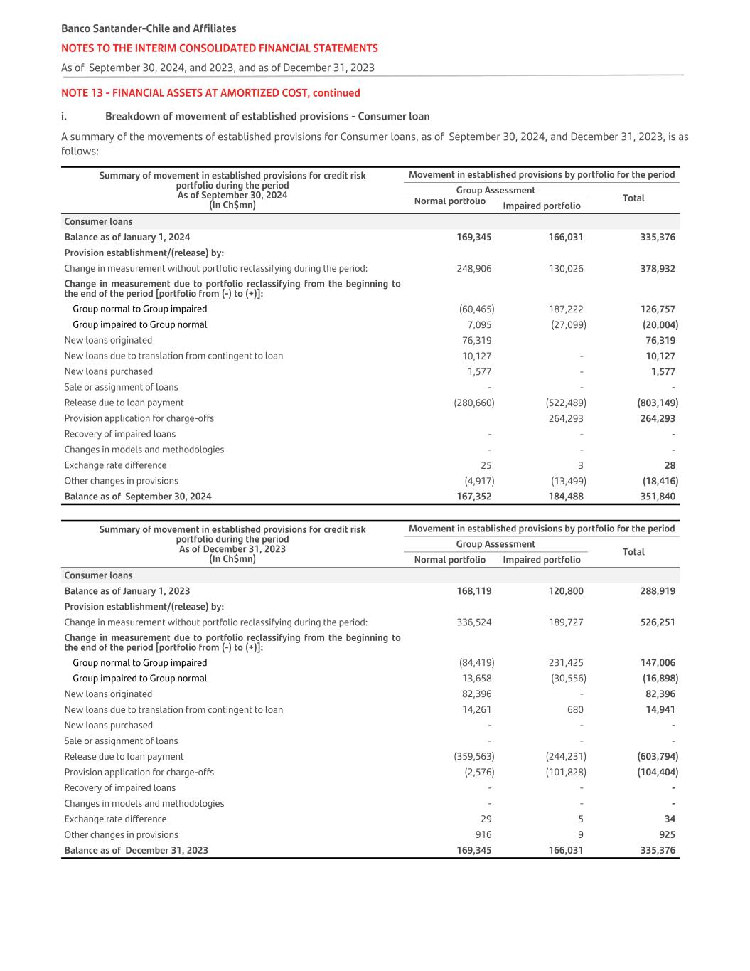 NOTE 13 - FINANCIAL ASSETS AT AMORTIZED COST, continued i. Breakdown of movement of established provisions - Consumer loan A summary of the movements of established provisions for Consumer loans, as of September 30, 2024, and December 31, 2023, is as follows: Summary of movement in established provisions for credit risk portfolio during the period As of September 30, 2024 (In Ch$mn) Movement in established provisions by portfolio for the period Group Assessment TotalNormal portfolio Impaired portfolio Consumer loans Balance as of January 1, 2024 169,345 166,031 335,376 Provision establishment/(release) by: Change in measurement without portfolio reclassifying during the period: 248,906 130,026 378,932 Change in measurement due to portfolio reclassifying from the beginning to the end of the period [portfolio from (-) to (+)]: Group normal to Group impaired (60,465) 187,222 126,757 Group impaired to Group normal 7,095 (27,099) (20,004) New loans originated 76,319 76,319 New loans due to translation from contingent to loan 10,127 - 10,127 New loans purchased 1,577 - 1,577 Sale or assignment of loans - - - Release due to loan payment (280,660) (522,489) (803,149) Provision application for charge-offs 264,293 264,293 Recovery of impaired loans - - - Changes in models and methodologies - - - Exchange rate difference 25 3 28 Other changes in provisions (4,917) (13,499) (18,416) Balance as of September 30, 2024 167,352 184,488 351,840 Summary of movement in established provisions for credit risk portfolio during the period As of December 31, 2023 (In Ch$mn) Movement in established provisions by portfolio for the period Group Assessment Total Normal portfolio Impaired portfolio Consumer loans Balance as of January 1, 2023 168,119 120,800 288,919 Provision establishment/(release) by: Change in measurement without portfolio reclassifying during the period: 336,524 189,727 526,251 Change in measurement due to portfolio reclassifying from the beginning to the end of the period [portfolio from (-) to (+)]: Group normal to Group impaired (84,419) 231,425 147,006 Group impaired to Group normal 13,658 (30,556) (16,898) New loans originated 82,396 - 82,396 New loans due to translation from contingent to loan 14,261 680 14,941 New loans purchased - - - Sale or assignment of loans - - - Release due to loan payment (359,563) (244,231) (603,794) Provision application for charge-offs (2,576) (101,828) (104,404) Recovery of impaired loans - - - Changes in models and methodologies - - - Exchange rate difference 29 5 34 Other changes in provisions 916 9 925 Balance as of December 31, 2023 169,345 166,031 335,376 Banco Santander-Chile and Affiliates NOTES TO THE INTERIM CONSOLIDATED FINANCIAL STATEMENTS As of September 30, 2024, and 2023, and as of December 31, 2023