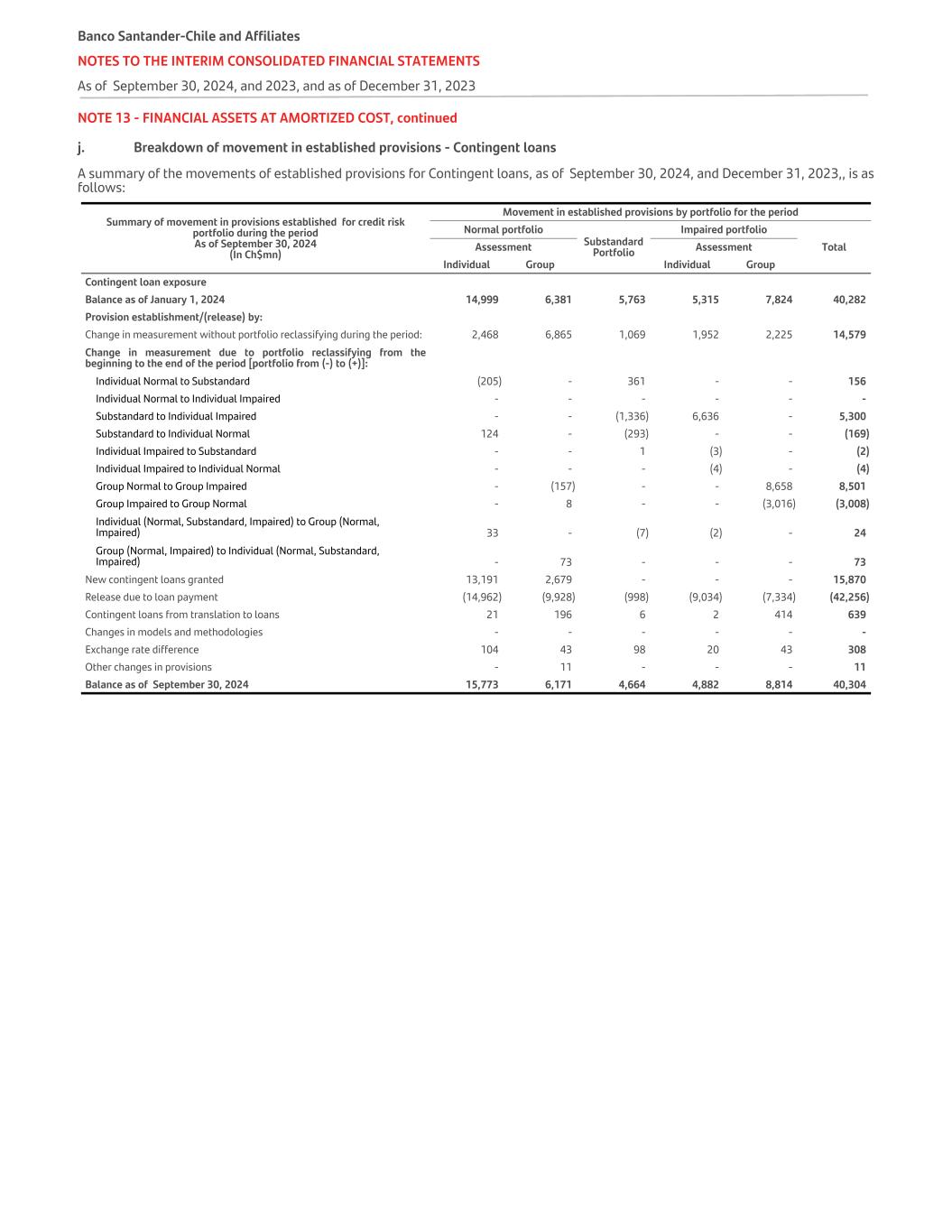 NOTE 13 - FINANCIAL ASSETS AT AMORTIZED COST, continued j. Breakdown of movement in established provisions - Contingent loans A summary of the movements of established provisions for Contingent loans, as of September 30, 2024, and December 31, 2023,, is as follows: Summary of movement in provisions established for credit risk portfolio during the period As of September 30, 2024 (In Ch$mn) Movement in established provisions by portfolio for the period Normal portfolio Substandard Portfolio Impaired portfolio TotalAssessment Assessment Individual Group Individual Group Contingent loan exposure Balance as of January 1, 2024 14,999 6,381 5,763 5,315 7,824 40,282 Provision establishment/(release) by: Change in measurement without portfolio reclassifying during the period: 2,468 6,865 1,069 1,952 2,225 14,579 Change in measurement due to portfolio reclassifying from the beginning to the end of the period [portfolio from (-) to (+)]: Individual Normal to Substandard (205) - 361 - - 156 Individual Normal to Individual Impaired - - - - - - Substandard to Individual Impaired - - (1,336) 6,636 - 5,300 Substandard to Individual Normal 124 - (293) - - (169) Individual Impaired to Substandard - - 1 (3) - (2) Individual Impaired to Individual Normal - - - (4) - (4) Group Normal to Group Impaired - (157) - - 8,658 8,501 Group Impaired to Group Normal - 8 - - (3,016) (3,008) Individual (Normal, Substandard, Impaired) to Group (Normal, Impaired) 33 - (7) (2) - 24 Group (Normal, Impaired) to Individual (Normal, Substandard, Impaired) - 73 - - - 73 New contingent loans granted 13,191 2,679 - - - 15,870 Release due to loan payment (14,962) (9,928) (998) (9,034) (7,334) (42,256) Contingent loans from translation to loans 21 196 6 2 414 639 Changes in models and methodologies - - - - - - Exchange rate difference 104 43 98 20 43 308 Other changes in provisions - 11 - - - 11 Balance as of September 30, 2024 15,773 6,171 4,664 4,882 8,814 40,304 Banco Santander-Chile and Affiliates NOTES TO THE INTERIM CONSOLIDATED FINANCIAL STATEMENTS As of September 30, 2024, and 2023, and as of December 31, 2023