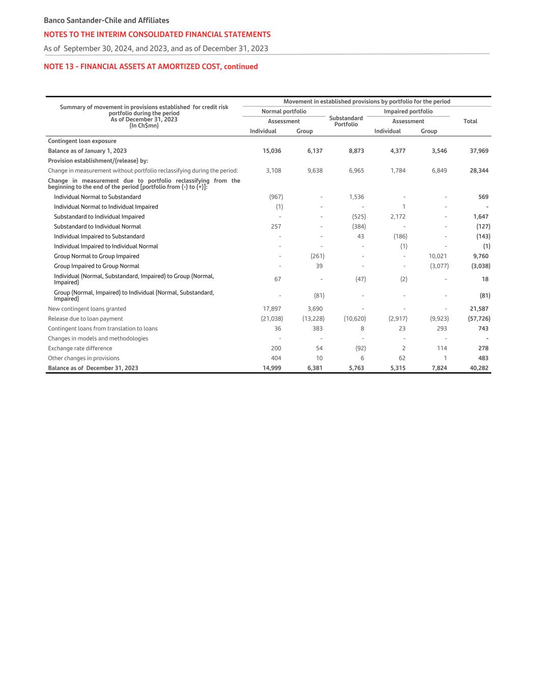 NOTE 13 - FINANCIAL ASSETS AT AMORTIZED COST, continued Summary of movement in provisions established for credit risk portfolio during the period As of December 31, 2023 (In Ch$mn) Movement in established provisions by portfolio for the period Normal portfolio Substandard Portfolio Impaired portfolio TotalAssessment Assessment Individual Group Individual Group Contingent loan exposure Balance as of January 1, 2023 15,036 6,137 8,873 4,377 3,546 37,969 Provision establishment/(release) by: Change in measurement without portfolio reclassifying during the period: 3,108 9,638 6,965 1,784 6,849 28,344 Change in measurement due to portfolio reclassifying from the beginning to the end of the period [portfolio from (-) to (+)]: Individual Normal to Substandard (967) - 1,536 - - 569 Individual Normal to Individual Impaired (1) - - 1 - - Substandard to Individual Impaired - - (525) 2,172 - 1,647 Substandard to Individual Normal 257 - (384) - - (127) Individual Impaired to Substandard - - 43 (186) - (143) Individual Impaired to Individual Normal - - - (1) - (1) Group Normal to Group Impaired - (261) - - 10,021 9,760 Group Impaired to Group Normal - 39 - - (3,077) (3,038) Individual (Normal, Substandard, Impaired) to Group (Normal, Impaired) 67 - (47) (2) - 18 Group (Normal, Impaired) to Individual (Normal, Substandard, Impaired) - (81) - - - (81) New contingent loans granted 17,897 3,690 - - - 21,587 Release due to loan payment (21,038) (13,228) (10,620) (2,917) (9,923) (57,726) Contingent loans from translation to loans 36 383 8 23 293 743 Changes in models and methodologies - - - - - - Exchange rate difference 200 54 (92) 2 114 278 Other changes in provisions 404 10 6 62 1 483 Balance as of December 31, 2023 14,999 6,381 5,763 5,315 7,824 40,282 Banco Santander-Chile and Affiliates NOTES TO THE INTERIM CONSOLIDATED FINANCIAL STATEMENTS As of September 30, 2024, and 2023, and as of December 31, 2023