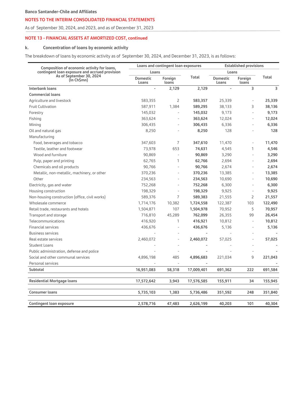 NOTE 13 - FINANCIAL ASSETS AT AMORTIZED COST, continued k. Concentration of loans by economic activity The breakdown of loans by economic activity as of September 30, 2024, and December 31, 2023, is as follows: Composition of economic activity for loans, contingent loan exposure and accrued provision As of September 30, 2024 (In Ch$mn) Loans and contingent loan exposures Established provisions Loans Total Loans TotalDomestic Loans Foreign loans Domestic Loans Foreign loans Interbank loans - 2,129 2,129 - 3 3 Commercial loans Agriculture and livestock 583,355 2 583,357 25,339 - 25,339 Fruit Cultivation 587,911 1,384 589,295 38,133 3 38,136 Forestry 145,032 - 145,032 9,173 - 9,173 Fishing 363,624 - 363,624 12,024 - 12,024 Mining 306,435 - 306,435 6,336 - 6,336 Oil and natural gas 8,250 - 8,250 128 - 128 Manufacturing Food, beverages and tobacco 347,603 7 347,610 11,470 - 11,470 Textile, leather and footwear 73,978 653 74,631 4,545 1 4,546 Wood and furniture 90,869 - 90,869 3,290 - 3,290 Pulp, paper and printing 62,765 1 62,766 2,694 - 2,694 Chemicals and oil products 90,766 - 90,766 2,674 - 2,674 Metallic, non-metallic, machinery, or other 370,236 - 370,236 13,385 - 13,385 Other 234,563 - 234,563 10,690 - 10,690 Electricity, gas and water 752,268 - 752,268 6,300 - 6,300 Housing construction 198,329 - 198,329 9,925 - 9,925 Non-housing construction (office, civil works) 589,376 7 589,383 21,555 2 21,557 Wholesale commerce 1,714,176 10,382 1,724,558 122,387 103 122,490 Retail trade, restaurants and hotels 1,504,871 107 1,504,978 70,952 5 70,957 Transport and storage 716,810 45,289 762,099 26,355 99 26,454 Telecommunications 416,920 1 416,921 10,812 - 10,812 Financial services 436,676 - 436,676 5,136 - 5,136 Business services - - - - - - Real estate services 2,460,072 - 2,460,072 57,025 - 57,025 Student Loans - - - - - - Public administration, defense and police - - - - - - Social and other communal services 4,896,198 485 4,896,683 221,034 9 221,043 Personal services - - - - Subtotal 16,951,083 58,318 17,009,401 691,362 222 691,584 Residential Mortgage loans 17,572,642 3,943 17,576,585 155,911 34 155,945 Consumer loans 5,735,103 1,383 5,736,486 351,592 248 351,840 Contingent loan exposure 2,578,716 47,483 2,626,199 40,203 101 40,304 Banco Santander-Chile and Affiliates NOTES TO THE INTERIM CONSOLIDATED FINANCIAL STATEMENTS As of September 30, 2024, and 2023, and as of December 31, 2023