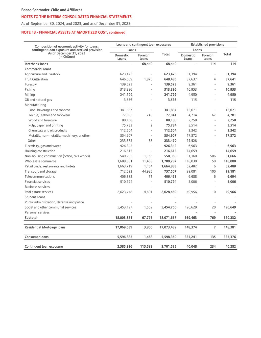 NOTE 13 - FINANCIAL ASSETS AT AMORTIZED COST, continued Composition of economic activity for loans, contingent loan exposure and accrued provision As of December 31, 2023 (In Ch$mn) Loans and contingent loan exposures Established provisions Loans Total Loans TotalDomestic Loans Foreign loans Domestic Loans Foreign loans Interbank loans - 68,440 68,440 - 114 114 Commercial loans Agriculture and livestock 623,473 - 623,473 31,394 - 31,394 Fruit Cultivation 646,609 1,876 648,485 37,637 4 37,641 Forestry 139,523 - 139,523 9,361 - 9,361 Fishing 313,396 - 313,396 10,953 - 10,953 Mining 241,799 - 241,799 4,950 - 4,950 Oil and natural gas 3,536 - 3,536 115 - 115 Manufacturing Food, beverages and tobacco 341,837 - 341,837 12,671 - 12,671 Textile, leather and footwear 77,092 749 77,841 4,714 67 4,781 Wood and furniture 88,188 - 88,188 2,258 - 2,258 Pulp, paper and printing 75,732 2 75,734 3,514 - 3,514 Chemicals and oil products 112,504 - 112,504 2,342 - 2,342 Metallic, non-metallic, machinery, or other 354,907 - 354,907 17,372 - 17,372 Other 233,382 88 233,470 11,528 - Electricity, gas and water 926,342 - 926,342 6,963 - 6,963 Housing construction 216,613 - 216,613 14,659 - 14,659 Non-housing construction (office, civil works) 549,205 1,155 550,360 31,160 506 31,666 Wholesale commerce 1,689,351 11,436 1,700,787 118,030 50 118,080 Retail trade, restaurants and hotels 1,663,719 1,164 1,664,883 62,482 6 62,488 Transport and storage 712,522 44,985 757,507 29,081 100 29,181 Telecommunications 406,382 71 406,453 6,688 6 6,694 Financial services 510,794 - 510,794 5,006 - 5,006 Business services - - - - - - Real estate services 2,623,778 4,691 2,628,469 49,956 10 49,966 Student Loans - - - - - - Public administration, defense and police - - - - - - Social and other communal services 5,453,197 1,559 5,454,756 196,629 20 196,649 Personal services - - - - - - Subtotal 18,003,881 67,776 18,071,657 669,463 769 670,232 Residential Mortgage loans 17,069,639 3,800 17,073,439 148,374 7 148,381 Consumer loans 5,596,882 1,468 5,598,350 335,241 135 335,376 Contingent loan exposure 2,585,936 115,589 2,701,525 40,048 234 40,282 Banco Santander-Chile and Affiliates NOTES TO THE INTERIM CONSOLIDATED FINANCIAL STATEMENTS As of September 30, 2024, and 2023, and as of December 31, 2023
