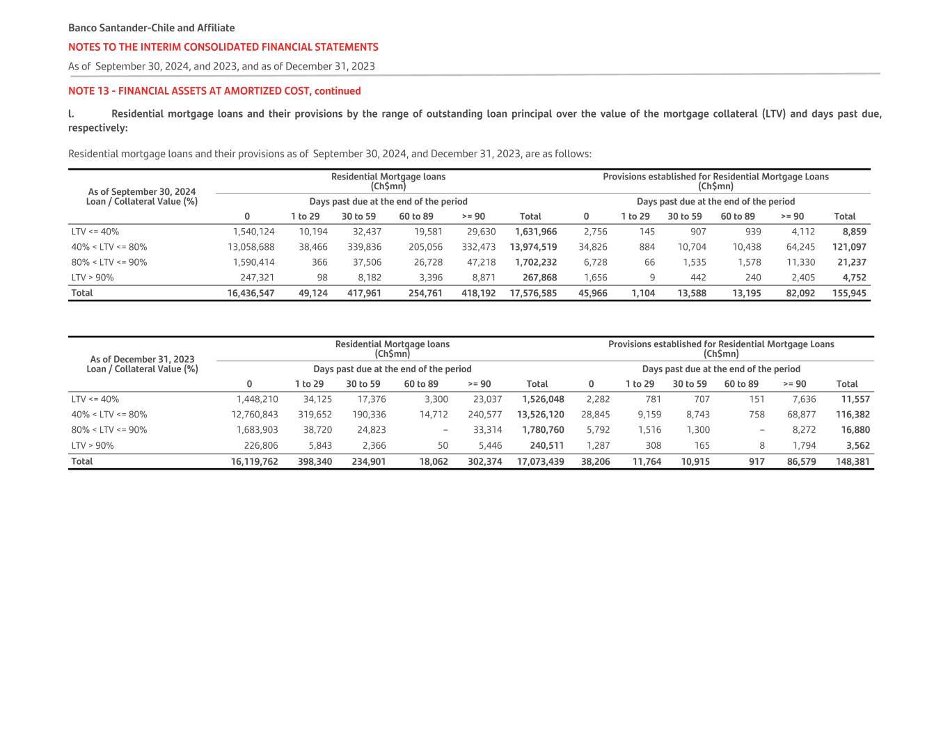 NOTE 13 - FINANCIAL ASSETS AT AMORTIZED COST, continued l. Residential mortgage loans and their provisions by the range of outstanding loan principal over the value of the mortgage collateral (LTV) and days past due, respectively: Residential mortgage loans and their provisions as of September 30, 2024, and December 31, 2023, are as follows: As of September 30, 2024 Loan / Collateral Value (%) Residential Mortgage loans (Ch$mn) Provisions established for Residential Mortgage Loans (Ch$mn) Days past due at the end of the period Days past due at the end of the period 0 1 to 29 30 to 59 60 to 89 >= 90 Total 0 1 to 29 30 to 59 60 to 89 >= 90 Total LTV <= 40% 1,540,124 10,194 32,437 19,581 29,630 1,631,966 2,756 145 907 939 4,112 8,859 40% < LTV <= 80% 13,058,688 38,466 339,836 205,056 332,473 13,974,519 34,826 884 10,704 10,438 64,245 121,097 80% < LTV <= 90% 1,590,414 366 37,506 26,728 47,218 1,702,232 6,728 66 1,535 1,578 11,330 21,237 LTV > 90% 247,321 98 8,182 3,396 8,871 267,868 1,656 9 442 240 2,405 4,752 Total 16,436,547 49,124 417,961 254,761 418,192 17,576,585 45,966 1,104 13,588 13,195 82,092 155,945 As of December 31, 2023 Loan / Collateral Value (%) Residential Mortgage loans (Ch$mn) Provisions established for Residential Mortgage Loans (Ch$mn) Days past due at the end of the period Days past due at the end of the period 0 1 to 29 30 to 59 60 to 89 >= 90 Total 0 1 to 29 30 to 59 60 to 89 >= 90 Total LTV <= 40% 1,448,210 34,125 17,376 3,300 23,037 1,526,048 2,282 781 707 151 7,636 11,557 40% < LTV <= 80% 12,760,843 319,652 190,336 14,712 240,577 13,526,120 28,845 9,159 8,743 758 68,877 116,382 80% < LTV <= 90% 1,683,903 38,720 24,823 – 33,314 1,780,760 5,792 1,516 1,300 – 8,272 16,880 LTV > 90% 226,806 5,843 2,366 50 5,446 240,511 1,287 308 165 8 1,794 3,562 Total 16,119,762 398,340 234,901 18,062 302,374 17,073,439 38,206 11,764 10,915 917 86,579 148,381 Banco Santander-Chile and Affiliate NOTES TO THE INTERIM CONSOLIDATED FINANCIAL STATEMENTS As of September 30, 2024, and 2023, and as of December 31, 2023