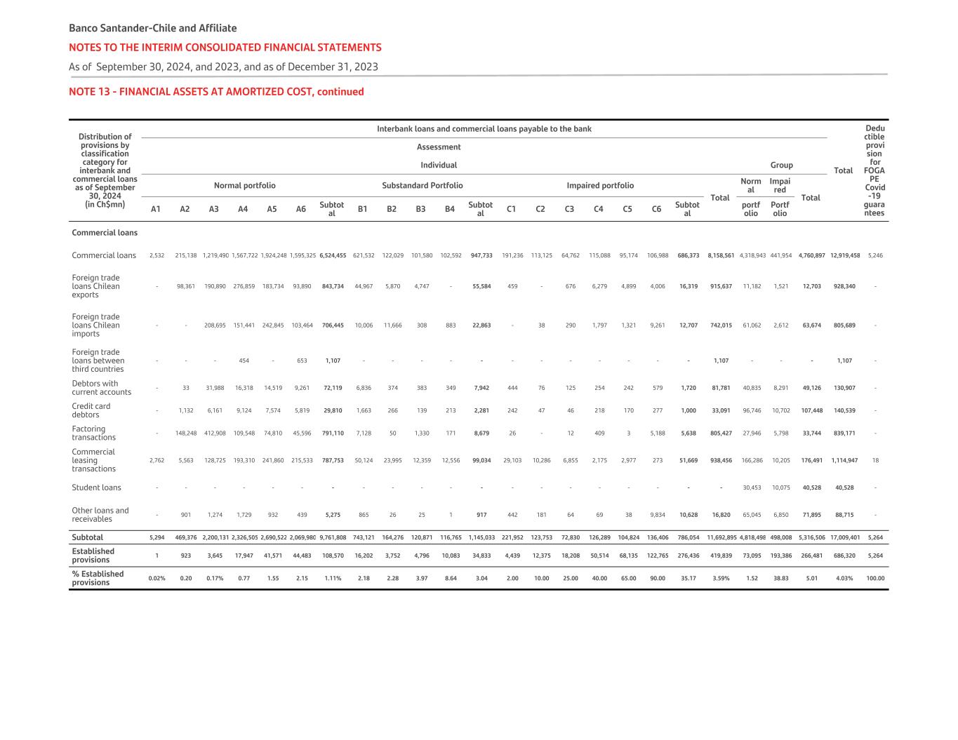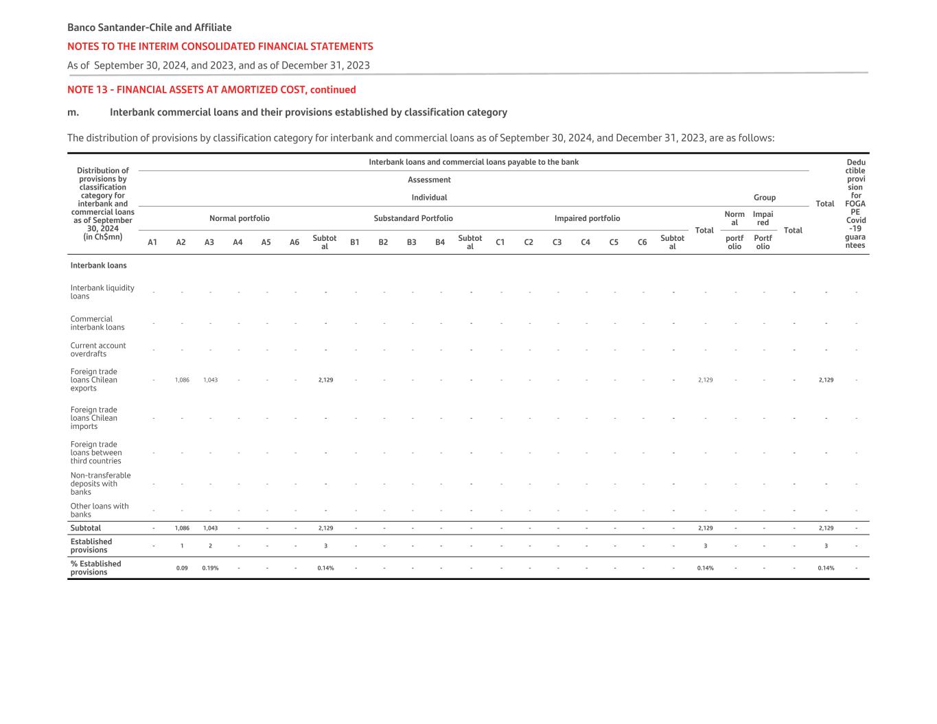 NOTE 13 - FINANCIAL ASSETS AT AMORTIZED COST, continued m. Interbank commercial loans and their provisions established by classification category The distribution of provisions by classification category for interbank and commercial loans as of September 30, 2024, and December 31, 2023, are as follows: Distribution of provisions by classification category for interbank and commercial loans as of September 30, 2024 (in Ch$mn) Interbank loans and commercial loans payable to the bank Total  Dedu ctible provi sion for FOGA PE Covid -19 guara ntees Assessment Individual Group Normal portfolio Substandard Portfolio Impaired portfolio Total Norm al Impai red Total A1 A2 A3 A4 A5 A6 Subtot al B1 B2 B3 B4 Subtot al C1 C2 C3 C4 C5 C6 Subtot al portf olio Portf olio Interbank loans   Interbank liquidity loans - - - - - - - - - - - - - - - - - - - - - - - - - Commercial interbank loans - - - - - - - - - - - - - - - - - - - - - - - - - Current account overdrafts - - - - - - - - - - - - - - - - - - - - - - - - - Foreign trade loans Chilean exports - 1,086 1,043 - - - 2,129 - - - - - - - - - - - - 2,129 - - - 2,129 - Foreign trade loans Chilean imports - - - - - - - - - - - - - - - - - - - - - - - - - Foreign trade loans between third countries - - - - - - - - - - - - - - - - - - - - - - - - - Non-transferable deposits with banks - - - - - - - - - - - - - - - - - - - - - - - - - Other loans with banks - - - - - - - - - - - - - - - - - - - - - - - - - Subtotal - 1,086 1,043 - - - 2,129 - - - - - - - - - - - - 2,129 - - - 2,129 - Established provisions - 1 2 - - - 3 - - - - - - - - - - - - 3 - - - 3 - % Established provisions 0.09 0.19% - - - 0.14% - - - - - - - - - - - - 0.14% - - - 0.14% - Banco Santander-Chile and Affiliate NOTES TO THE INTERIM CONSOLIDATED FINANCIAL STATEMENTS As of September 30, 2024, and 2023, and as of December 31, 2023