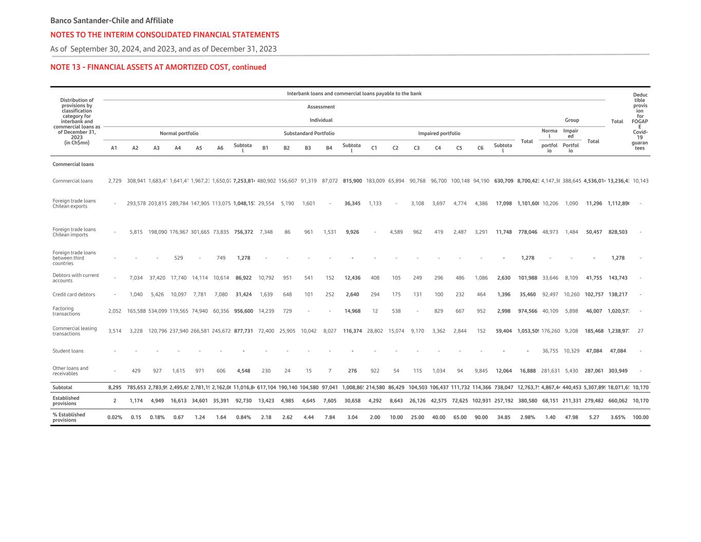 NOTE 13 - FINANCIAL ASSETS AT AMORTIZED COST, continued Distribution of provisions by classification category for interbank and commercial loans as of December 31, 2023 (in Ch$mn) Interbank loans and commercial loans payable to the bank Total  Deduc tible provis ion for FOGAP E Covid- 19 guaran tees Assessment Individual Group Normal portfolio Substandard Portfolio Impaired portfolio Total Norma l Impair ed Total A1 A2 A3 A4 A5 A6 Subtota l B1 B2 B3 B4 Subtota l C1 C2 C3 C4 C5 C6 Subtota l portfol io Portfol io Interbank loans   Interbank liquidity loans - - - - - - - - - - - - - - - - - - - - - - - - - Commercial interbank loans - - - - - - - - - - - - - - - - - - - - - - - - - Current account overdrafts - - - - - - - - - - - - - - - - - - - - - - - - - Foreign trade loans Chilean exports 19,711 - 48,729 - - - 68,440 - - - - - - - - - - - - 68,440 - - - 68,440 - Foreign trade loans Chilean imports - - - - - - - - - - - - - - - - - - - - - - - - - Foreign trade loans between third countries - - - - - - - - - - - - - - - - - - - - - - - - - Non-transferable deposits with banks - - - - - - - - - - - - - - - - - - - - - - - - - Other loans with banks - - - - - - - - - - - - - - - - - - - - - - - - - Subtotal 19,711 - 48,729 - - - 68,440 - - - - - - - - - - - - 68,440 - - - 68,440 - Established provisions 7 - 107 - - - 114 - - - - - - - - - - - - 114 - - - 114 - % Established provisions 0.04% - 0.22% - - - 0.17% - - - - - - - - - - - - 0.17% - - - 0.17% - Banco Santander-Chile and Affiliate NOTES TO THE INTERIM CONSOLIDATED FINANCIAL STATEMENTS As of September 30, 2024, and 2023, and as of December 31, 2023
