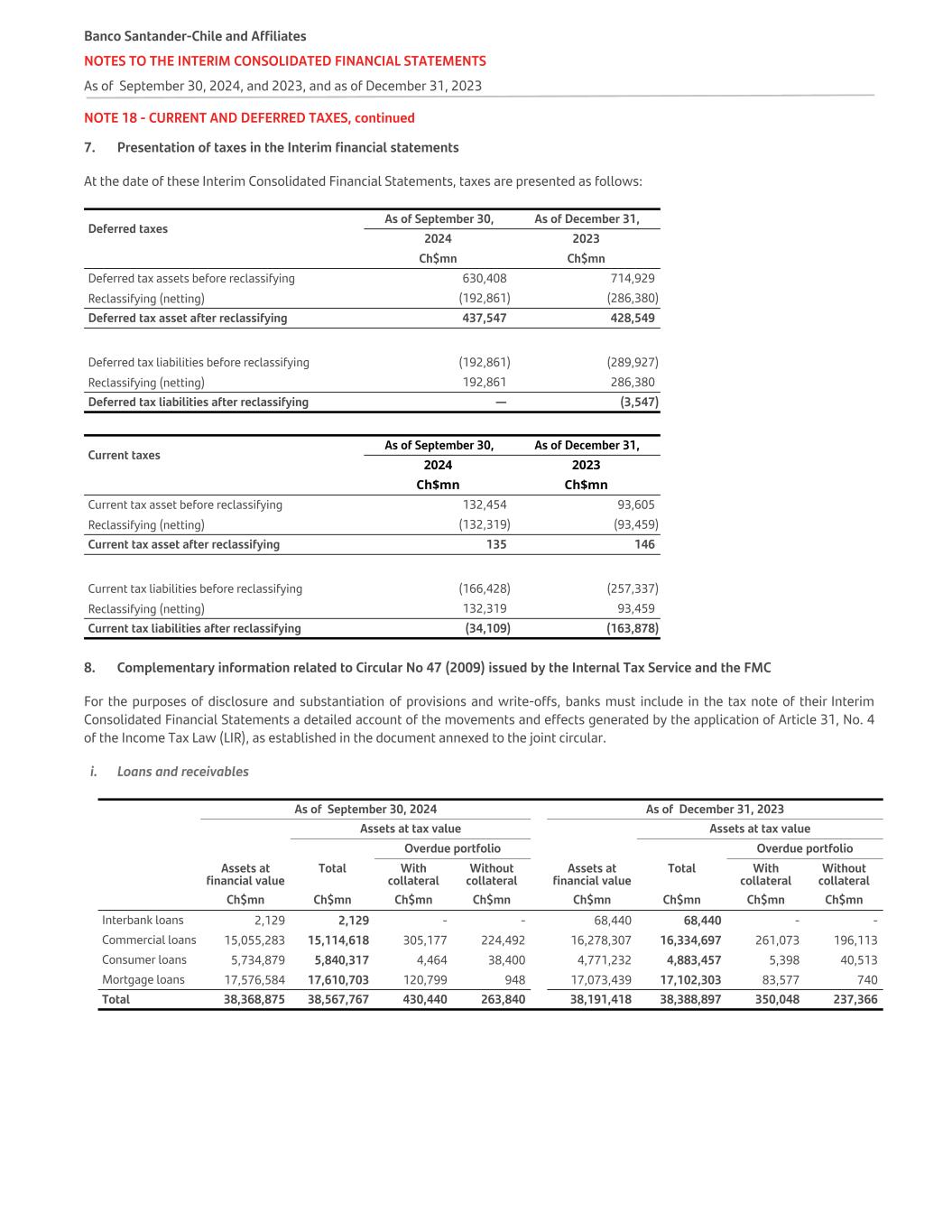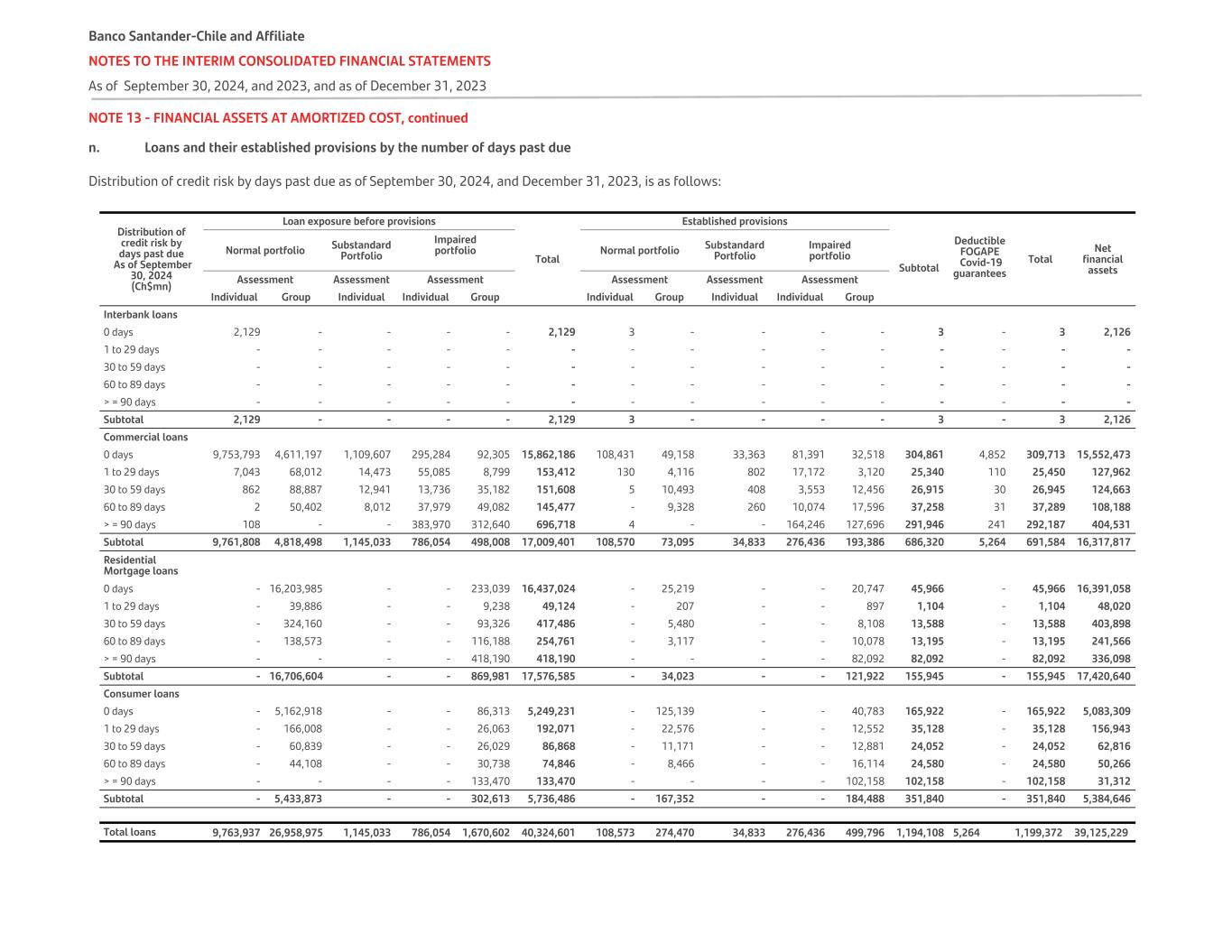 NOTE 13 - FINANCIAL ASSETS AT AMORTIZED COST, continued n. Loans and their established provisions by the number of days past due Distribution of credit risk by days past due as of September 30, 2024, and December 31, 2023, is as follows: Distribution of credit risk by days past due As of September 30, 2024 (Ch$mn) Loan exposure before provisions Total Established provisions     Total Net financial assets Normal portfolio Substandard Portfolio Impaired portfolio Normal portfolio Substandard Portfolio Impaired portfolio Subtotal Deductible FOGAPE Covid-19 guaranteesAssessment Assessment Assessment Assessment Assessment Assessment Individual Group Individual Individual Group Individual Group Individual Individual Group Interbank loans 0 days 2,129 - - - - 2,129 3 - - - - 3 - 3 2,126 1 to 29 days - - - - - - - - - - - - - - - 30 to 59 days - - - - - - - - - - - - - - - 60 to 89 days - - - - - - - - - - - - - - - > = 90 days - - - - - - - - - - - - - - - Subtotal 2,129 - - - - 2,129 3 - - - - 3 - 3 2,126 Commercial loans 0 days 9,753,793 4,611,197 1,109,607 295,284 92,305 15,862,186 108,431 49,158 33,363 81,391 32,518 304,861 4,852 309,713 15,552,473 1 to 29 days 7,043 68,012 14,473 55,085 8,799 153,412 130 4,116 802 17,172 3,120 25,340 110 25,450 127,962 30 to 59 days 862 88,887 12,941 13,736 35,182 151,608 5 10,493 408 3,553 12,456 26,915 30 26,945 124,663 60 to 89 days 2 50,402 8,012 37,979 49,082 145,477 - 9,328 260 10,074 17,596 37,258 31 37,289 108,188 > = 90 days 108 - - 383,970 312,640 696,718 4 - - 164,246 127,696 291,946 241 292,187 404,531 Subtotal 9,761,808 4,818,498 1,145,033 786,054 498,008 17,009,401 108,570 73,095 34,833 276,436 193,386 686,320 5,264 691,584 16,317,817 Residential Mortgage loans 0 days - 16,203,985 - - 233,039 16,437,024 - 25,219 - - 20,747 45,966 - 45,966 16,391,058 1 to 29 days - 39,886 - - 9,238 49,124 - 207 - - 897 1,104 - 1,104 48,020 30 to 59 days - 324,160 - - 93,326 417,486 - 5,480 - - 8,108 13,588 - 13,588 403,898 60 to 89 days - 138,573 - - 116,188 254,761 - 3,117 - - 10,078 13,195 - 13,195 241,566 > = 90 days - - - - 418,190 418,190 - - - - 82,092 82,092 - 82,092 336,098 Subtotal - 16,706,604 - - 869,981 17,576,585 - 34,023 - - 121,922 155,945 - 155,945 17,420,640 Consumer loans 0 days - 5,162,918 - - 86,313 5,249,231 - 125,139 - - 40,783 165,922 - 165,922 5,083,309 1 to 29 days - 166,008 - - 26,063 192,071 - 22,576 - - 12,552 35,128 - 35,128 156,943 30 to 59 days - 60,839 - - 26,029 86,868 - 11,171 - - 12,881 24,052 - 24,052 62,816 60 to 89 days - 44,108 - - 30,738 74,846 - 8,466 - - 16,114 24,580 - 24,580 50,266 > = 90 days - - - - 133,470 133,470 - - - - 102,158 102,158 - 102,158 31,312 Subtotal - 5,433,873 - - 302,613 5,736,486 - 167,352 - - 184,488 351,840 - 351,840 5,384,646   Total loans 9,763,937 26,958,975 1,145,033 786,054 1,670,602 40,324,601 108,573 274,470 34,833 276,436 499,796 1,194,108 5,264 1,199,372 39,125,229 Banco Santander-Chile and Affiliate NOTES TO THE INTERIM CONSOLIDATED FINANCIAL STATEMENTS As of September 30, 2024, and 2023, and as of December 31, 2023