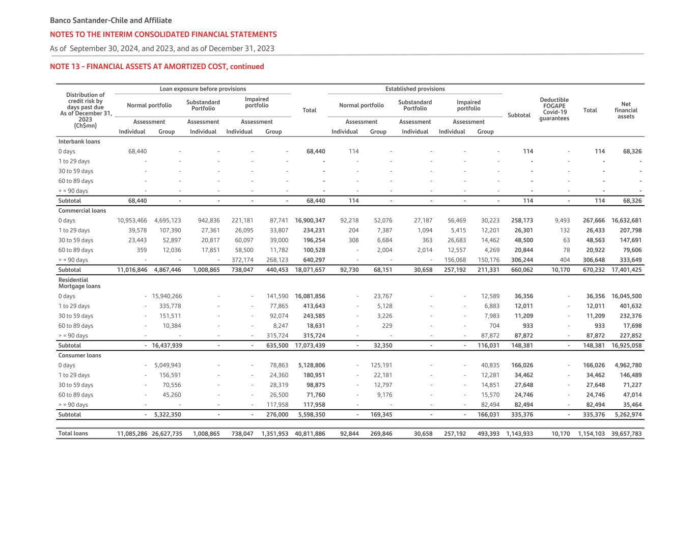 NOTE 13 - FINANCIAL ASSETS AT AMORTIZED COST, continued Distribution of credit risk by days past due As of December 31, 2023 (Ch$mn) Loan exposure before provisions Total Established provisions     Total Net financial assets Normal portfolio Substandard Portfolio Impaired portfolio Normal portfolio Substandard Portfolio Impaired portfolio Subtotal Deductible FOGAPE Covid-19 guaranteesAssessment Assessment Assessment Assessment Assessment Assessment Individual Group Individual Individual Group Individual Group Individual Individual Group Interbank loans 0 days 68,440 - - - - 68,440 114 - - - - 114 - 114 68,326 1 to 29 days - - - - - - - - - - - - - - - 30 to 59 days - - - - - - - - - - - - - - - 60 to 89 days - - - - - - - - - - - - - - - > = 90 days - - - - - - - - - - - - - - - Subtotal 68,440 - - - - 68,440 114 - - - - 114 - 114 68,326 Commercial loans 0 days 10,953,466 4,695,123 942,836 221,181 87,741 16,900,347 92,218 52,076 27,187 56,469 30,223 258,173 9,493 267,666 16,632,681 1 to 29 days 39,578 107,390 27,361 26,095 33,807 234,231 204 7,387 1,094 5,415 12,201 26,301 132 26,433 207,798 30 to 59 days 23,443 52,897 20,817 60,097 39,000 196,254 308 6,684 363 26,683 14,462 48,500 63 48,563 147,691 60 to 89 days 359 12,036 17,851 58,500 11,782 100,528 - 2,004 2,014 12,557 4,269 20,844 78 20,922 79,606 > = 90 days - - - 372,174 268,123 640,297 - - - 156,068 150,176 306,244 404 306,648 333,649 Subtotal 11,016,846 4,867,446 1,008,865 738,047 440,453 18,071,657 92,730 68,151 30,658 257,192 211,331 660,062 10,170 670,232 17,401,425 Residential Mortgage loans 0 days - 15,940,266 - - 141,590 16,081,856 - 23,767 - - 12,589 36,356 - 36,356 16,045,500 1 to 29 days - 335,778 - - 77,865 413,643 - 5,128 - - 6,883 12,011 - 12,011 401,632 30 to 59 days - 151,511 - - 92,074 243,585 - 3,226 - - 7,983 11,209 - 11,209 232,376 60 to 89 days - 10,384 - - 8,247 18,631 - 229 - - 704 933 - 933 17,698 > = 90 days - - - - 315,724 315,724 - - - - 87,872 87,872 - 87,872 227,852 Subtotal - 16,437,939 - - 635,500 17,073,439 - 32,350 - - 116,031 148,381 - 148,381 16,925,058 Consumer loans 0 days - 5,049,943 - - 78,863 5,128,806 - 125,191 - - 40,835 166,026 - 166,026 4,962,780 1 to 29 days - 156,591 - - 24,360 180,951 - 22,181 - - 12,281 34,462 - 34,462 146,489 30 to 59 days - 70,556 - - 28,319 98,875 - 12,797 - - 14,851 27,648 - 27,648 71,227 60 to 89 days - 45,260 - - 26,500 71,760 - 9,176 - - 15,570 24,746 - 24,746 47,014 > = 90 days - - - - 117,958 117,958 - - - - 82,494 82,494 - 82,494 35,464 Subtotal - 5,322,350 - - 276,000 5,598,350 - 169,345 - - 166,031 335,376 - 335,376 5,262,974   Total loans 11,085,286 26,627,735 1,008,865 738,047 1,351,953 40,811,886 92,844 269,846 30,658 257,192 493,393 1,143,933 10,170 1,154,103 39,657,783 Banco Santander-Chile and Affiliate NOTES TO THE INTERIM CONSOLIDATED FINANCIAL STATEMENTS As of September 30, 2024, and 2023, and as of December 31, 2023