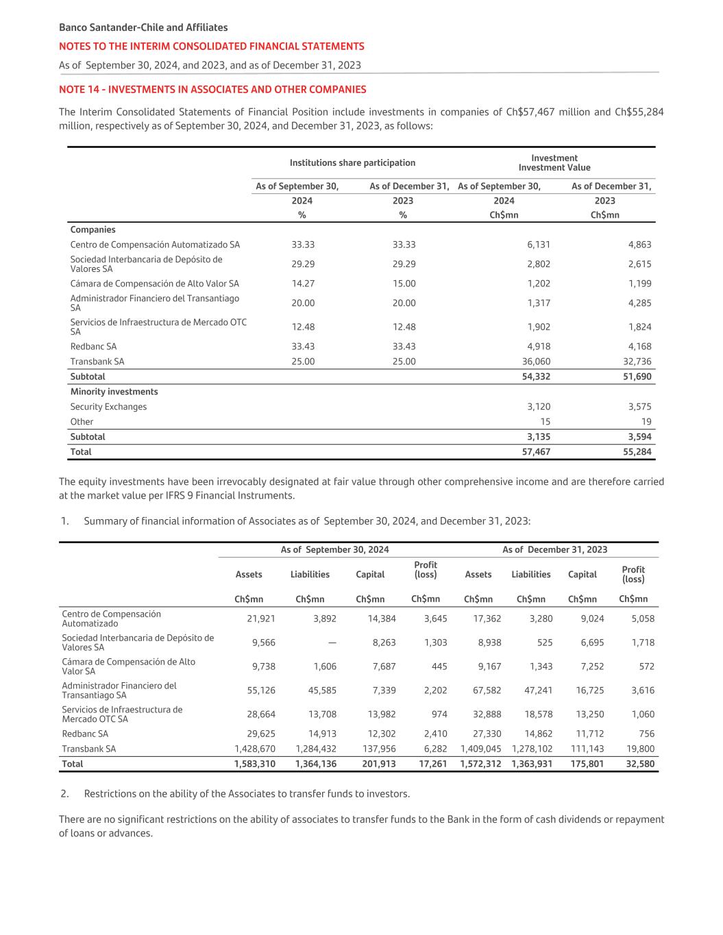 NOTE 14 - INVESTMENTS IN ASSOCIATES AND OTHER COMPANIES The Interim Consolidated Statements of Financial Position include investments in companies of Ch$57,467 million and Ch$55,284 million, respectively as of September 30, 2024, and December 31, 2023, as follows:   Institutions share participation Investment Investment Value As of September 30, As of December 31, As of September 30, As of December 31, 2024 2023 2024 2023   % % Ch$mn Ch$mn Companies Centro de Compensación Automatizado SA 33.33 33.33 6,131 4,863 Sociedad Interbancaria de Depósito de Valores SA 29.29 29.29 2,802 2,615 Cámara de Compensación de Alto Valor SA 14.27 15.00 1,202 1,199 Administrador Financiero del Transantiago SA 20.00 20.00 1,317 4,285 Servicios de Infraestructura de Mercado OTC SA 12.48 12.48 1,902 1,824 Redbanc SA 33.43 33.43 4,918 4,168 Transbank SA 25.00 25.00 36,060 32,736 Subtotal 54,332 51,690 Minority investments Security Exchanges 3,120 3,575 Other 15 19 Subtotal 3,135 3,594 Total 57,467 55,284 The equity investments have been irrevocably designated at fair value through other comprehensive income and are therefore carried at the market value per IFRS 9 Financial Instruments. 1. Summary of financial information of Associates as of September 30, 2024, and December 31, 2023: As of September 30, 2024 As of December 31, 2023 Assets Liabilities Capital Profit (loss) Assets Liabilities Capital Profit (loss)   Ch$mn Ch$mn Ch$mn Ch$mn Ch$mn Ch$mn Ch$mn Ch$mn Centro de Compensación Automatizado 21,921 3,892 14,384 3,645 17,362 3,280 9,024 5,058 Sociedad Interbancaria de Depósito de Valores SA 9,566 — 8,263 1,303 8,938 525 6,695 1,718 Cámara de Compensación de Alto Valor SA 9,738 1,606 7,687 445 9,167 1,343 7,252 572 Administrador Financiero del Transantiago SA 55,126 45,585 7,339 2,202 67,582 47,241 16,725 3,616 Servicios de Infraestructura de Mercado OTC SA 28,664 13,708 13,982 974 32,888 18,578 13,250 1,060 Redbanc SA 29,625 14,913 12,302 2,410 27,330 14,862 11,712 756 Transbank SA 1,428,670 1,284,432 137,956 6,282 1,409,045 1,278,102 111,143 19,800 Total 1,583,310 1,364,136 201,913 17,261 1,572,312 1,363,931 175,801 32,580 2. Restrictions on the ability of the Associates to transfer funds to investors. There are no significant restrictions on the ability of associates to transfer funds to the Bank in the form of cash dividends or repayment of loans or advances. Banco Santander-Chile and Affiliates NOTES TO THE INTERIM CONSOLIDATED FINANCIAL STATEMENTS As of September 30, 2024, and 2023, and as of December 31, 2023