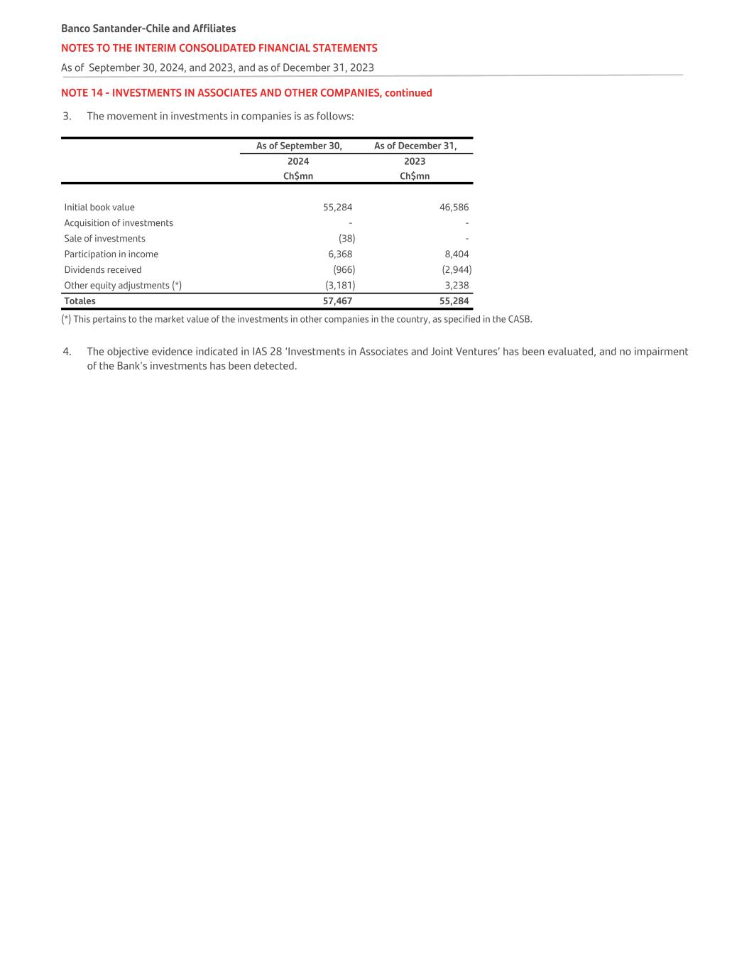 NOTE 14 - INVESTMENTS IN ASSOCIATES AND OTHER COMPANIES, continued 3. The movement in investments in companies is as follows:   As of September 30, As of December 31, 2024 2023   Ch$mn Ch$mn Initial book value 55,284 46,586 Acquisition of investments - - Sale of investments (38) - Participation in income 6,368 8,404 Dividends received (966) (2,944) Other equity adjustments (*) (3,181) 3,238 Totales 57,467 55,284 (*) This pertains to the market value of the investments in other companies in the country, as specified in the CASB. 4. The objective evidence indicated in IAS 28 ‘Investments in Associates and Joint Ventures’ has been evaluated, and no impairment of the Bank's investments has been detected. Banco Santander-Chile and Affiliates NOTES TO THE INTERIM CONSOLIDATED FINANCIAL STATEMENTS As of September 30, 2024, and 2023, and as of December 31, 2023