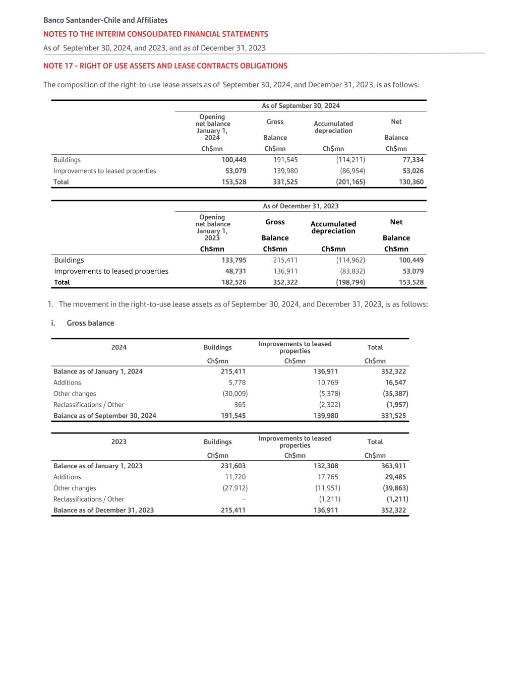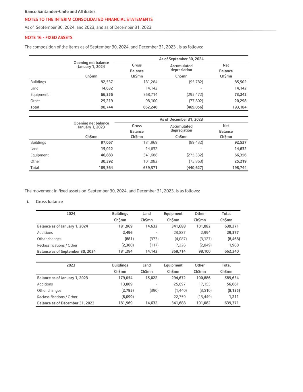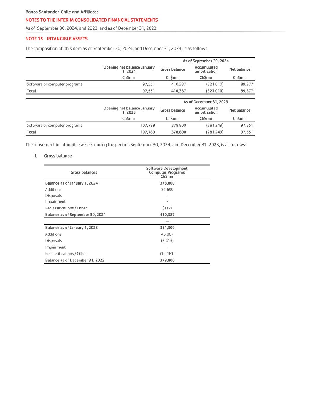 NOTE 15 - INTANGIBLE ASSETS The composition of this item as of September 30, 2024, and December 31, 2023, is as follows: As of September 30, 2024 Opening net balance January 1, 2024 Gross balance Accumulated amortization Net balance Ch$mn Ch$mn Ch$mn Ch$mn Software or computer programs 97,551 410,387 (321,010) 89,377 Total 97,551 410,387 (321,010) 89,377 As of December 31, 2023 Opening net balance January 1, 2023 Gross balance Accumulated amortization Net balance Ch$mn Ch$mn Ch$mn Ch$mn Software or computer programs 107,789 378,800 (281,249) 97,551 Total 107,789 378,800 (281,249) 97,551 The movement in intangible assets during the periods September 30, 2024, and December 31, 2023, is as follows: i. Gross balance Gross balances Software Development Computer Programs Ch$mn Balance as of January 1, 2024 378,800 Additions 31,699 Disposals - Impairment - Reclassifications / Other (112) Balance as of September 30, 2024 410,387 — Balance as of January 1, 2023 351,309 Additions 45,067 Disposals (5,415) Impairment - Reclassifications / Other (12,161) Balance as of December 31, 2023 378,800 Banco Santander-Chile and Affiliates NOTES TO THE INTERIM CONSOLIDATED FINANCIAL STATEMENTS As of September 30, 2024, and 2023, and as of December 31, 2023