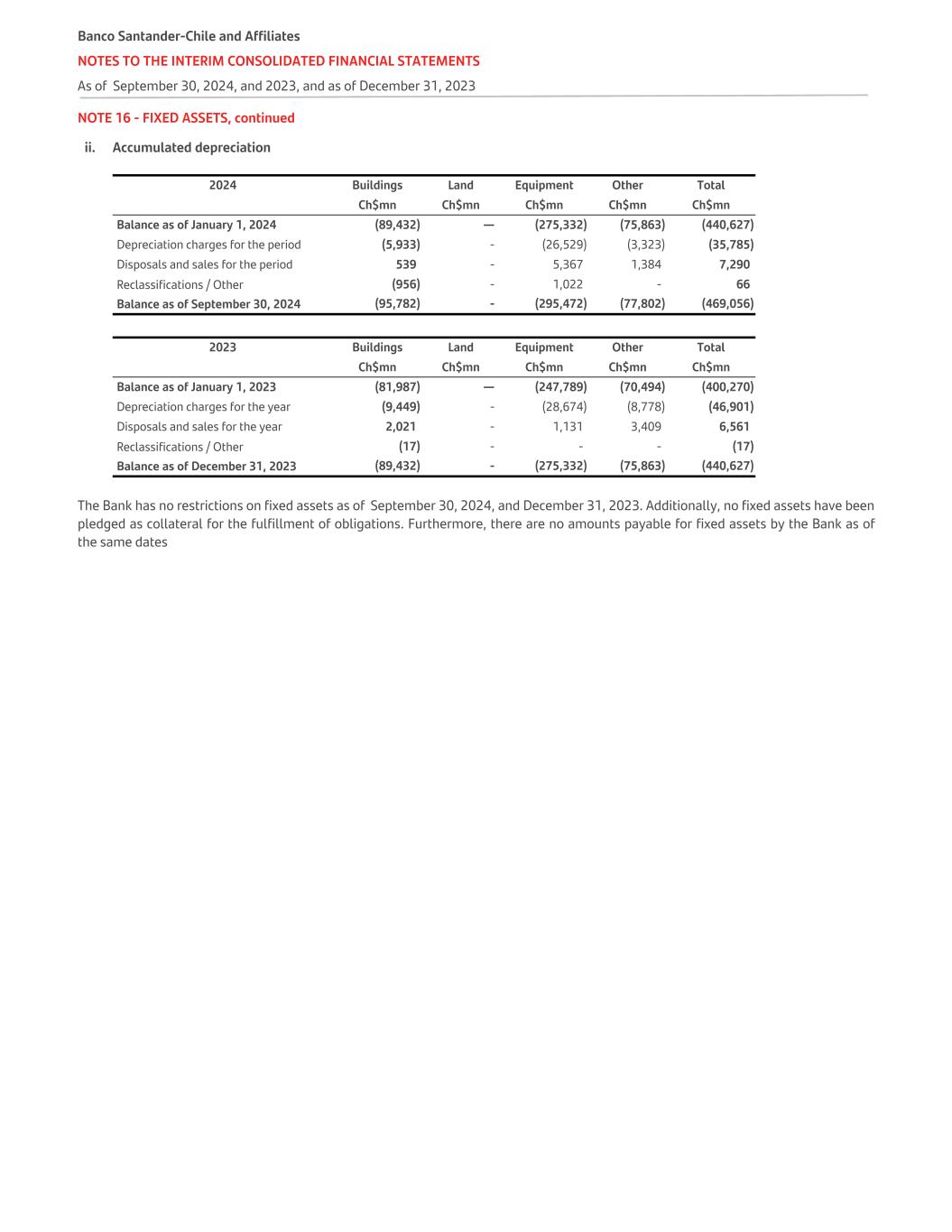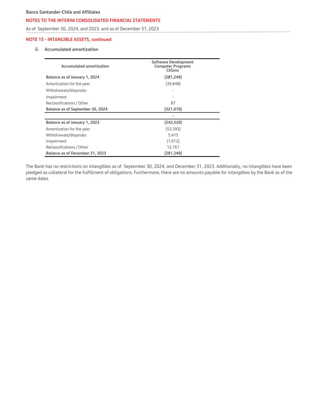 NOTE 15 - INTANGIBLE ASSETS, continued ii. Accumulated amortization Accumulated amortization Software Development Computer Programs Ch$mn Balance as of January 1, 2024 (281,249) Amortization for the year (39,848) Withdrawals/disposals - Impairment - Reclassifications / Other 87 Balance as of September 30, 2024 (321,010) - Balance as of January 1, 2023 (243,520) Amortization for the year (53,393) Withdrawals/disposals 5,415 Impairment (1,912) Reclassifications / Other 12,161 Balance as of December 31, 2023 (281,249) The Bank has no restrictions on intangibles as of September 30, 2024, and December 31, 2023. Additionally, no intangibles have been pledged as collateral for the fulfillment of obligations. Furthermore, there are no amounts payable for intangibles by the Bank as of the same dates Banco Santander-Chile and Affiliates NOTES TO THE INTERIM CONSOLIDATED FINANCIAL STATEMENTS As of September 30, 2024, and 2023, and as of December 31, 2023