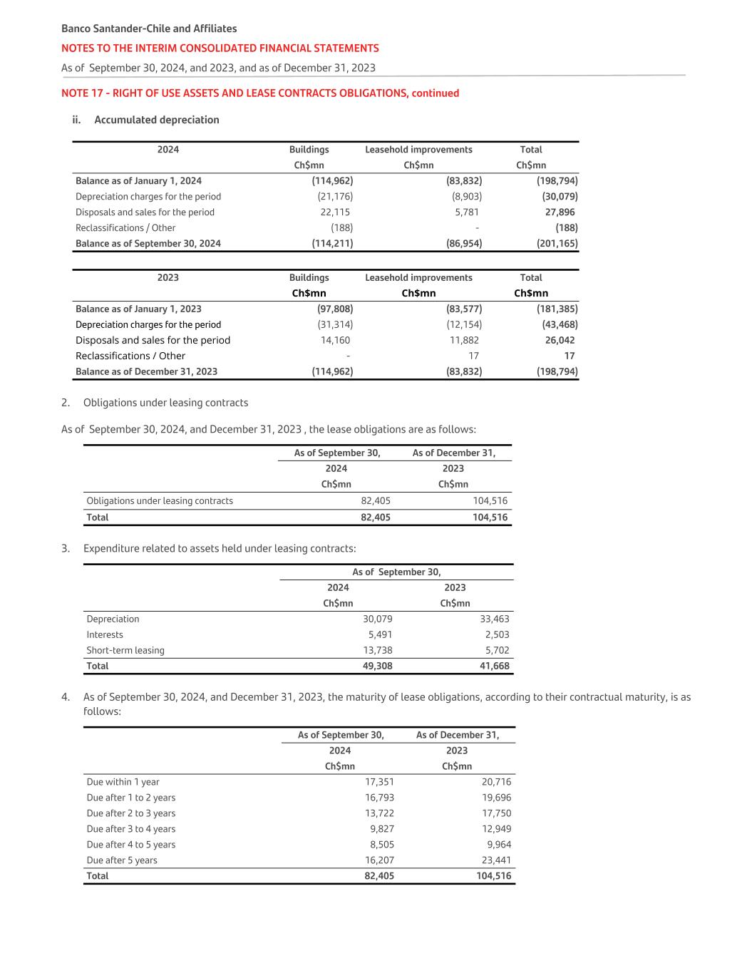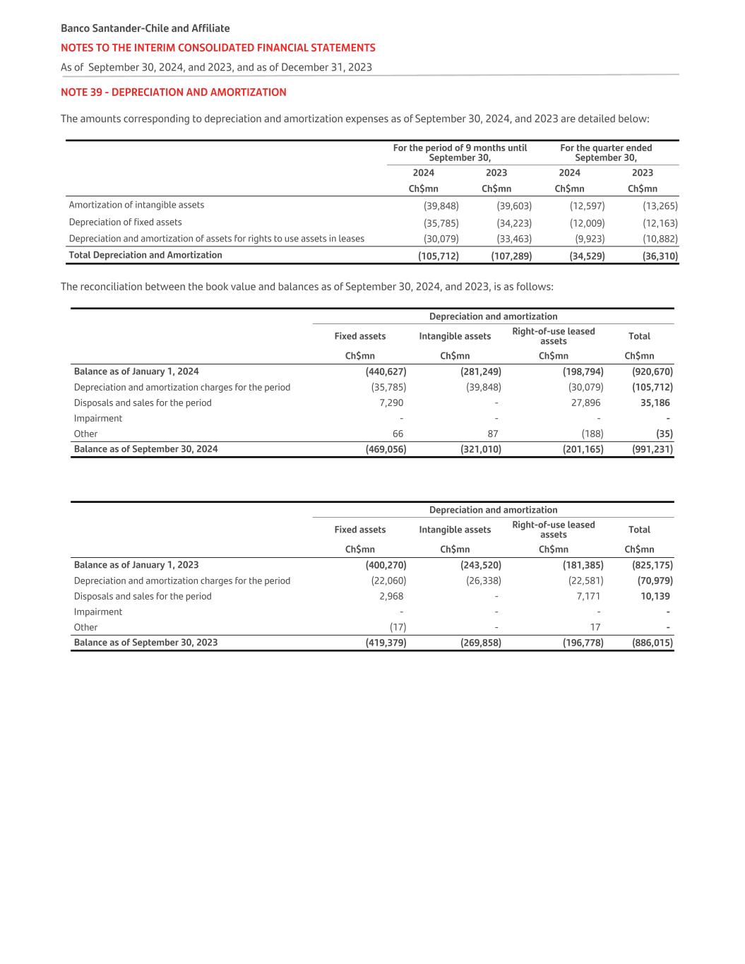 NOTE 39 - DEPRECIATION AND AMORTIZATION The amounts corresponding to depreciation and amortization expenses as of September 30, 2024, and 2023 are detailed below:   For the period of 9 months until September 30, For the quarter ended September 30,   2024 2023 2024 2023   Ch$mn Ch$mn Ch$mn Ch$mn Amortization of intangible assets (39,848) (39,603) (12,597) (13,265) Depreciation of fixed assets (35,785) (34,223) (12,009) (12,163) Depreciation and amortization of assets for rights to use assets in leases (30,079) (33,463) (9,923) (10,882) Total Depreciation and Amortization (105,712) (107,289) (34,529) (36,310) The reconciliation between the book value and balances as of September 30, 2024, and 2023, is as follows: Depreciation and amortization Fixed assets Intangible assets Right-of-use leased assets Total Ch$mn Ch$mn Ch$mn Ch$mn Balance as of January 1, 2024 (440,627) (281,249) (198,794) (920,670) Depreciation and amortization charges for the period (35,785) (39,848) (30,079) (105,712) Disposals and sales for the period 7,290 - 27,896 35,186 Impairment - - - - Other 66 87 (188) (35) Balance as of September 30, 2024 (469,056) (321,010) (201,165) (991,231) Depreciation and amortization Fixed assets Intangible assets Right-of-use leased assets Total Ch$mn Ch$mn Ch$mn Ch$mn Balance as of January 1, 2023 (400,270) (243,520) (181,385) (825,175) Depreciation and amortization charges for the period (22,060) (26,338) (22,581) (70,979) Disposals and sales for the period 2,968 - 7,171 10,139 Impairment - - - - Other (17) - 17 - Balance as of September 30, 2023 (419,379) (269,858) (196,778) (886,015) Banco Santander-Chile and Affiliate NOTES TO THE INTERIM CONSOLIDATED FINANCIAL STATEMENTS As of September 30, 2024, and 2023, and as of December 31, 2023
