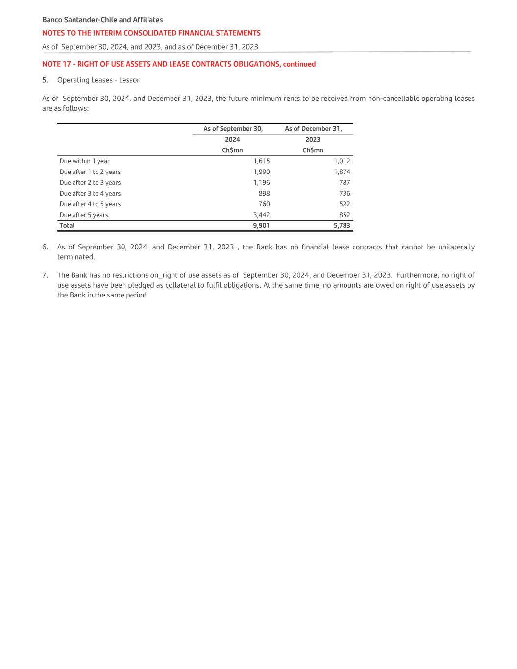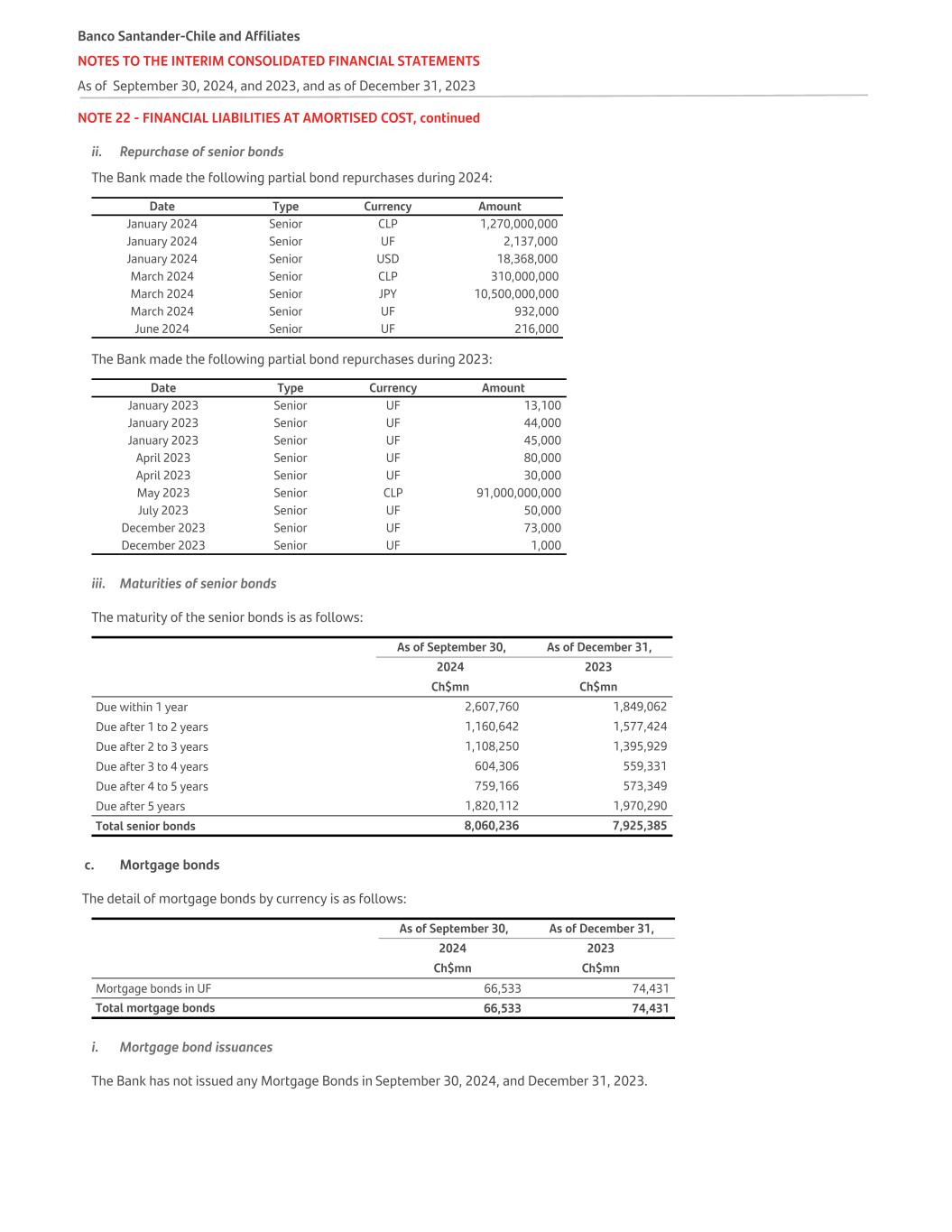 NOTE 22 - FINANCIAL LIABILITIES AT AMORTISED COST, continued ii. Repurchase of senior bonds The Bank made the following partial bond repurchases during 2024: Date Type Currency Amount January 2024 Senior CLP 1,270,000,000 January 2024 Senior UF 2,137,000 January 2024 Senior USD 18,368,000 March 2024 Senior CLP 310,000,000 March 2024 Senior JPY 10,500,000,000 March 2024 Senior UF 932,000 June 2024 Senior UF 216,000 The Bank made the following partial bond repurchases during 2023: Date Type Currency Amount January 2023 Senior UF 13,100 January 2023 Senior UF 44,000 January 2023 Senior UF 45,000 April 2023 Senior UF 80,000 April 2023 Senior UF 30,000 May 2023 Senior CLP 91,000,000,000 July 2023 Senior UF 50,000 December 2023 Senior UF 73,000 December 2023 Senior UF 1,000 iii. Maturities of senior bonds The maturity of the senior bonds is as follows: As of September 30, As of December 31,   2024 2023 Ch$mn Ch$mn Due within 1 year 2,607,760 1,849,062 Due after 1 to 2 years 1,160,642 1,577,424 Due after 2 to 3 years 1,108,250 1,395,929 Due after 3 to 4 years 604,306 559,331 Due after 4 to 5 years 759,166 573,349 Due after 5 years 1,820,112 1,970,290 Total senior bonds 8,060,236 7,925,385 c. Mortgage bonds The detail of mortgage bonds by currency is as follows: As of September 30, As of December 31, 2024 2023 Ch$mn Ch$mn Mortgage bonds in UF 66,533 74,431 Total mortgage bonds 66,533 74,431 i. Mortgage bond issuances The Bank has not issued any Mortgage Bonds in September 30, 2024, and December 31, 2023. Banco Santander-Chile and Affiliates NOTES TO THE INTERIM CONSOLIDATED FINANCIAL STATEMENTS As of September 30, 2024, and 2023, and as of December 31, 2023