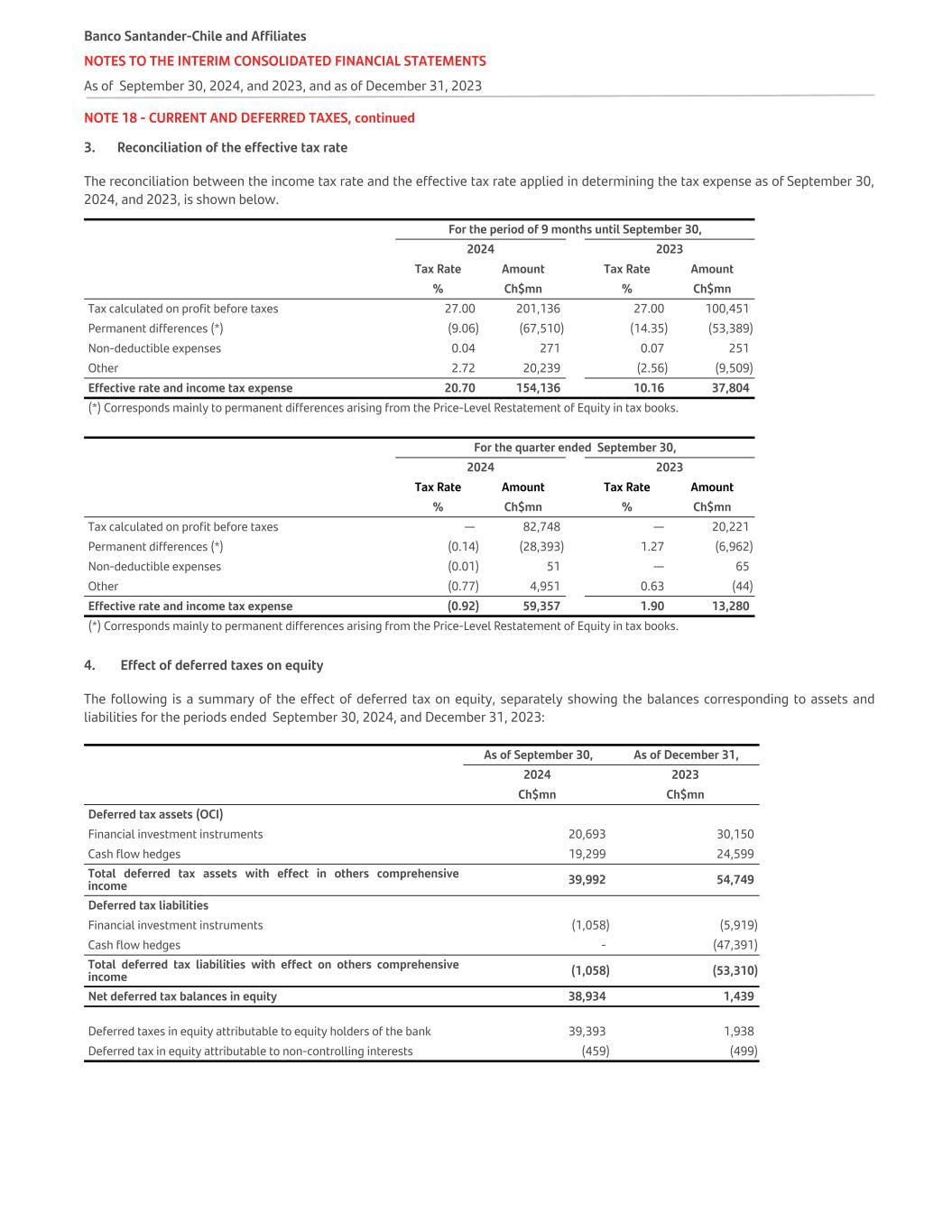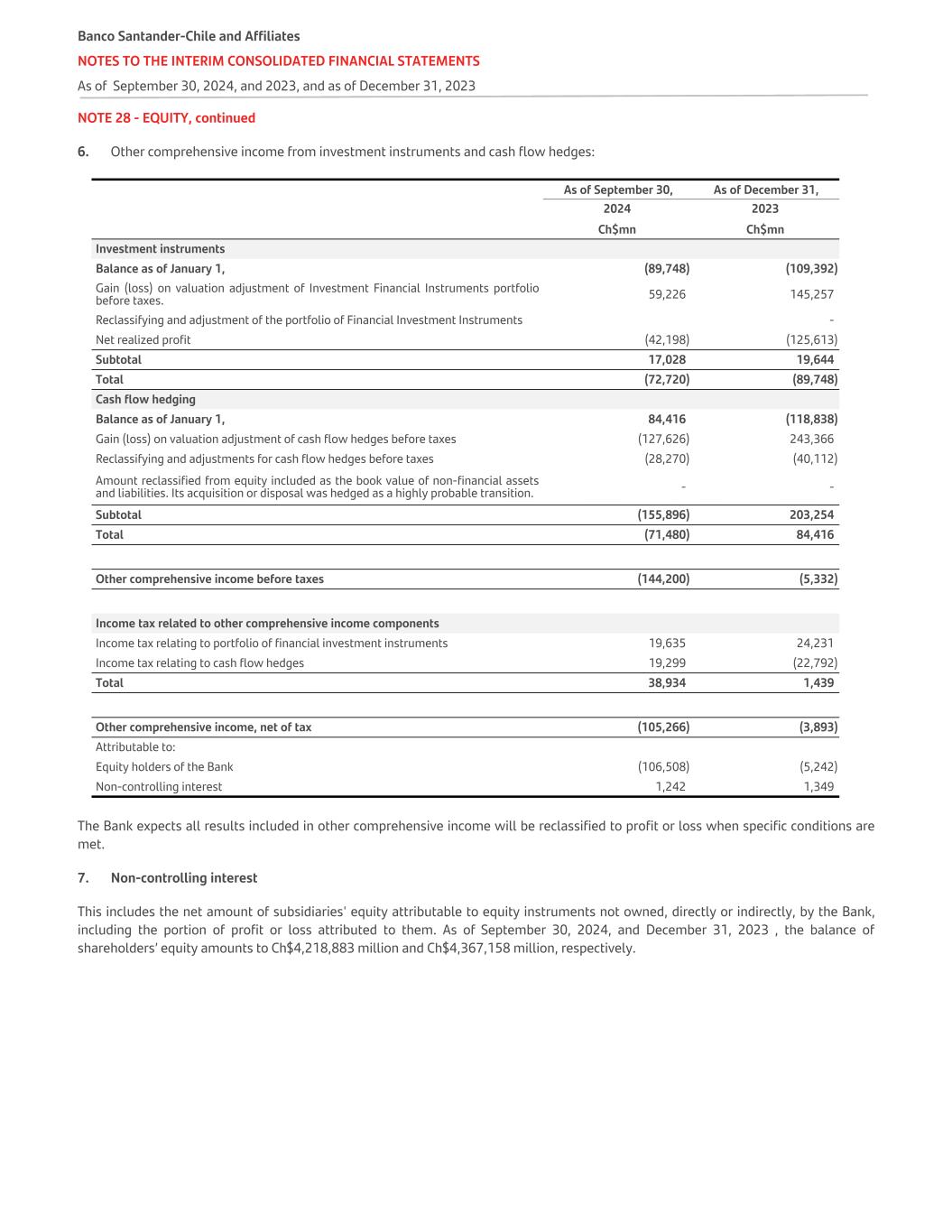 NOTE 28 - EQUITY, continued 6. Other comprehensive income from investment instruments and cash flow hedges: As of September 30, As of December 31, 2024 2023 Ch$mn Ch$mn Investment instruments Balance as of January 1, (89,748) (109,392) Gain (loss) on valuation adjustment of Investment Financial Instruments portfolio before taxes. 59,226 145,257 Reclassifying and adjustment of the portfolio of Financial Investment Instruments - Net realized profit (42,198) (125,613) Subtotal 17,028 19,644 Total (72,720) (89,748) Cash flow hedging Balance as of January 1, 84,416 (118,838) Gain (loss) on valuation adjustment of cash flow hedges before taxes (127,626) 243,366 Reclassifying and adjustments for cash flow hedges before taxes (28,270) (40,112) Amount reclassified from equity included as the book value of non-financial assets and liabilities. Its acquisition or disposal was hedged as a highly probable transition. - - Subtotal (155,896) 203,254 Total (71,480) 84,416 Other comprehensive income before taxes (144,200) (5,332) Income tax related to other comprehensive income components Income tax relating to portfolio of financial investment instruments 19,635 24,231 Income tax relating to cash flow hedges 19,299 (22,792) Total 38,934 1,439 Other comprehensive income, net of tax (105,266) (3,893) Attributable to: Equity holders of the Bank (106,508) (5,242) Non-controlling interest 1,242 1,349 The Bank expects all results included in other comprehensive income will be reclassified to profit or loss when specific conditions are met. 7. Non-controlling interest This includes the net amount of subsidiaries' equity attributable to equity instruments not owned, directly or indirectly, by the Bank, including the portion of profit or loss attributed to them. As of September 30, 2024, and December 31, 2023 , the balance of shareholders’ equity amounts to Ch$4,218,883 million and Ch$4,367,158 million, respectively. Banco Santander-Chile and Affiliates NOTES TO THE INTERIM CONSOLIDATED FINANCIAL STATEMENTS As of September 30, 2024, and 2023, and as of December 31, 2023