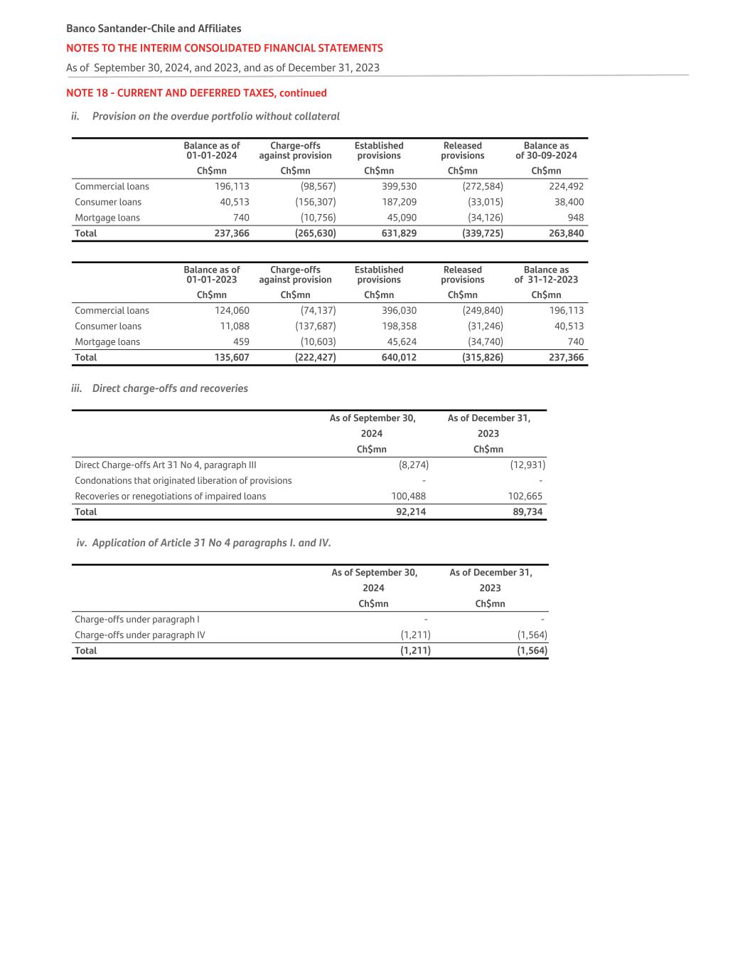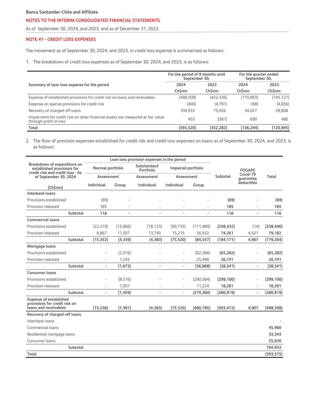 NOTE 41 - CREDIT LOSS EXPENSES The movement as of September 30, 2024, and 2023, in credit loss expense is summarized as follows: 1. The breakdown of credit loss expenses as of September 30, 2024, and 2023, is as follows: For the period of 9 months until September 30, For the quarter ended September 30, Summary of loan loss expense for the period 2024 2023 2024 2023 Ch$mn Ch$mn Ch$mn Ch$mn Expense of established provisions for credit risk on loans and receivables (498,508) (422,336) (170,893) (145,127) Expense on special provisions for credit risk (400) (4,791) (68) (4,856) Recovery of charged-off loans 104,933 75,426 34,027 28,808 Impairment for credit risk on other financial assets not measured at fair value through profit or loss 455 (581) 690 480 Total (393,520) (352,282) (136,244) (120,695) 2. The flow of provision expenses established for credit risk and credit loss expenses on loans as of September 30, 2024, and 2023, is as follows: Breakdown of expenditure on established provisions for credit risk and credit loss - As of September 30, 2024 Loan loss provision expenses in the period Normal portfolio Substandard Portfolio Impaired portfolio Subtotal FOGAPE Covid-19 guarantee deductible Assessment Assessment Assessment Total Individual Group Individual Individual Group(Ch$mn) Interbank loans Provisions established (69) - - - - (69) - (69) Provision released 185 - - - - 185 - 185 Subtotal 116 - - - - 116 - 116 Commercial loans Provisions established (22,219) (15,866) (18,123) (90,735) (111,489) (258,432) (14) (258,446) Provision released 6,867 11,507 13,740 15,215 26,932 74,261 4,921 79,182 Subtotal (15,352) (4,359) (4,383) (75,520) (84,557) (184,171) 4,907 (179,264) Mortgage loans Provisions established - (2,916) - - (62,366) (65,282) - (65,282) Provision released - 1,243 - - 25,498 26,741 - 26,741 Subtotal - (1,673) - - (36,868) (38,541) - (38,541) Consumer loans Provisions established - (8,516) - - (290,584) (299,100) - (299,100) Provision released - 7,057 - - 11,224 18,281 - 18,281 Subtotal - (1,459) - - (279,360) (280,819) - (280,819) Expense of established provisions for credit risk on loans and receivables (15,236) (7,491) (4,383) (75,520) (400,785) (503,415) 4,907 (498,508) Recovery of charged-off loans Interbank loans - Commercial loans 45,960 Residential mortgage loans 33,343 Consumer loans 25,630 Subtotal 104,933 Total (393,575) Banco Santander-Chile and Affiliate NOTES TO THE INTERIM CONSOLIDATED FINANCIAL STATEMENTS As of September 30, 2024, and 2023, and as of December 31, 2023