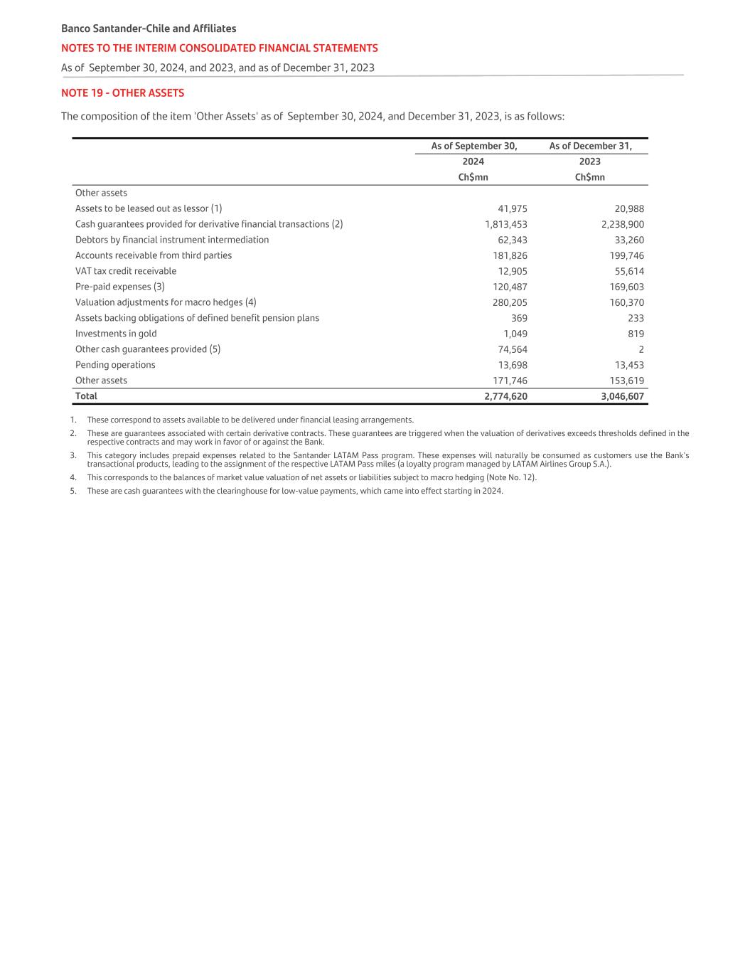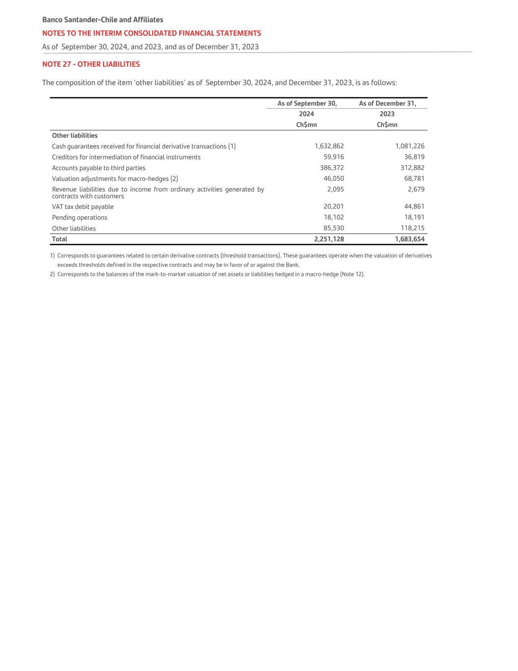 NOTE 27 - OTHER LIABILITIES The composition of the item 'other liabilities' as of September 30, 2024, and December 31, 2023, is as follows: As of September 30, As of December 31, 2024 2023 Ch$mn Ch$mn Other liabilities Cash guarantees received for financial derivative transactions (1) 1,632,862 1,081,226 Creditors for intermediation of financial instruments 59,916 36,819 Accounts payable to third parties 386,372 312,882 Valuation adjustments for macro-hedges (2) 46,050 68,781 Revenue liabilities due to income from ordinary activities generated by contracts with customers 2,095 2,679 VAT tax debit payable 20,201 44,861 Pending operations 18,102 18,191 Other liabilities 85,530 118,215 Total 2,251,128 1,683,654 1) Corresponds to guarantees related to certain derivative contracts (threshold transactions). These guarantees operate when the valuation of derivatives exceeds thresholds defined in the respective contracts and may be in favor of or against the Bank. 2) Corresponds to the balances of the mark-to-market valuation of net assets or liabilities hedged in a macro-hedge (Note 12). Banco Santander-Chile and Affiliates NOTES TO THE INTERIM CONSOLIDATED FINANCIAL STATEMENTS As of September 30, 2024, and 2023, and as of December 31, 2023
