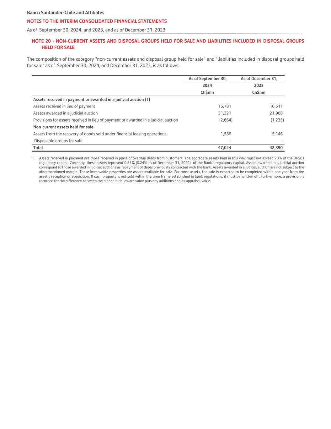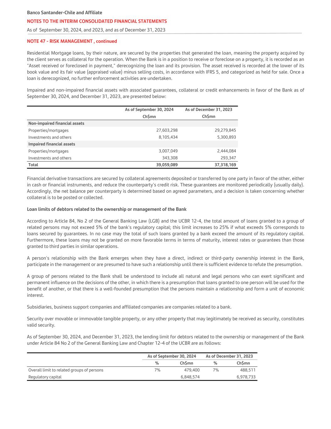 NOTE 47 - RISK MANAGEMENT , continued Residential Mortgage loans, by their nature, are secured by the properties that generated the loan, meaning the property acquired by the client serves as collateral for the operation. When the Bank is in a position to receive or foreclose on a property, it is recorded as an "Asset received or foreclosed in payment," derecognizing the loan and its provision. The asset received is recorded at the lower of its book value and its fair value (appraised value) minus selling costs, in accordance with IFRS 5, and categorized as held for sale. Once a loan is derecognized, no further enforcement activities are undertaken. Impaired and non-impaired financial assets with associated guarantees, collateral or credit enhancements in favor of the Bank as of September 30, 2024, and December 31, 2023, are presented below:   As of September 30, 2024 As of December 31, 2023 Ch$mn Ch$mn Non-impaired financial assets Properties/mortgages 27,603,298 29,279,845 Investments and others 8,105,434 5,300,893 Impaired financial assets Properties/mortgages 3,007,049 2,444,084 Investments and others 343,308 293,347 Total 39,059,089 37,318,169 Financial derivative transactions are secured by collateral agreements deposited or transferred by one party in favor of the other, either in cash or financial instruments, and reduce the counterparty's credit risk. These guarantees are monitored periodically (usually daily). Accordingly, the net balance per counterparty is determined based on agreed parameters, and a decision is taken concerning whether collateral is to be posted or collected. Loan limits of debtors related to the ownership or management of the Bank According to Article 84, No 2 of the General Banking Law (LGB) and the UCBR 12-4, the total amount of loans granted to a group of related persons may not exceed 5% of the bank's regulatory capital; this limit increases to 25% if what exceeds 5% corresponds to loans secured by guarantees. In no case may the total of such loans granted by a bank exceed the amount of its regulatory capital. Furthermore, these loans may not be granted on more favorable terms in terms of maturity, interest rates or guarantees than those granted to third parties in similar operations. A person's relationship with the Bank emerges when they have a direct, indirect or third-party ownership interest in the Bank, participate in the management or are presumed to have such a relationship until there is sufficient evidence to refute the presumption. A group of persons related to the Bank shall be understood to include all natural and legal persons who can exert significant and permanent influence on the decisions of the other, in which there is a presumption that loans granted to one person will be used for the benefit of another, or that there is a well-founded presumption that the persons maintain a relationship and form a unit of economic interest. Subsidiaries, business support companies and affiliated companies are companies related to a bank. Security over movable or immovable tangible property, or any other property that may legitimately be received as security, constitutes valid security. As of September 30, 2024, and December 31, 2023, the lending limit for debtors related to the ownership or management of the Bank under Article 84 No 2 of the General Banking Law and Chapter 12-4 of the UCBR are as follows:   As of September 30, 2024 As of December 31, 2023   % Ch$mn % Ch$mn Overall limit to related groups of persons 7% 479,400 7% 488,511 Regulatory capital 6,848,574 6,978,733 Banco Santander-Chile and Affiliate NOTES TO THE INTERIM CONSOLIDATED FINANCIAL STATEMENTS As of September 30, 2024, and 2023, and as of December 31, 2023