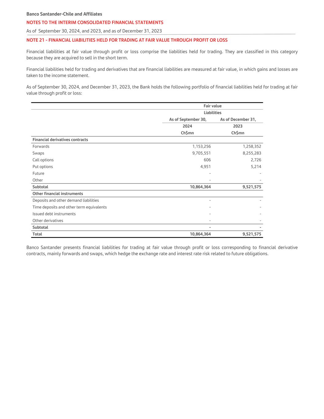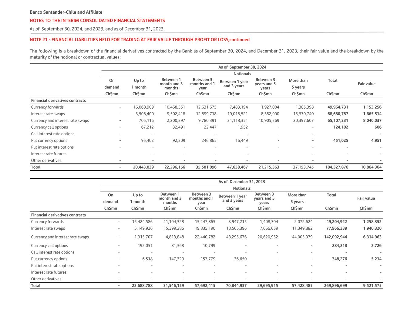 NOTE 21 - FINANCIAL LIABILITIES HELD FOR TRADING AT FAIR VALUE THROUGH PROFIT OR LOSS,continued The following is a breakdown of the financial derivatives contracted by the Bank as of September 30, 2024, and December 31, 2023, their fair value and the breakdown by the maturity of the notional or contractual values: As of September 30, 2024 Notionals On Up to Between 1 month and 3 months Between 3 months and 1 year Between 1 year and 3 years Between 3 years and 5 years More than Total Fair value demand 1 month 5 years   Ch$mn Ch$mn Ch$mn Ch$mn Ch$mn Ch$mn Ch$mn Ch$mn Ch$mn Financial derivatives contracts               Currency forwards - 16,068,909 10,468,551 12,631,675 7,483,194 1,927,004 1,385,398 49,964,731 1,153,256 Interest rate swaps - 3,506,400 9,502,418 12,899,718 19,018,521 8,382,990 15,370,740 68,680,787 1,665,514 Currency and interest rate swaps - 705,116 2,200,397 9,780,391 21,118,351 10,905,369 20,397,607 65,107,231 8,040,037 Currency call options - 67,212 32,491 22,447 1,952 - - 124,102 606 Call interest rate options - - - - - - - - - Put currency options - 95,402 92,309 246,865 16,449 - - 451,025 4,951 Put interest rate options - - - - - - - - - Interest rate futures - - - - - - - - - Other derivatives - - - - - - - - - Total - 20,443,039 22,296,166 35,581,096 47,638,467 21,215,363 37,153,745 184,327,876 10,864,364 As of December 31, 2023 Notionals On Up to Between 1 month and 3 months Between 3 months and 1 year Between 1 year and 3 years Between 3 years and 5 years More than Total Fair value demand 1 month 5 years   Ch$mn Ch$mn Ch$mn Ch$mn Ch$mn Ch$mn Ch$mn Ch$mn Ch$mn Financial derivatives contracts               Currency forwards - 15,424,586 11,104,328 15,247,865 3,947,215 1,408,304 2,072,624 49,204,922 1,258,352 Interest rate swaps - 5,149,926 15,399,286 19,835,190 18,565,396 7,666,659 11,349,882 77,966,339 1,940,320 Currency and interest rate swaps - 1,915,707 4,813,848 22,440,782 48,295,676 20,620,952 44,005,979 142,092,944 6,314,963 Currency call options - 192,051 81,368 10,799 - - - 284,218 2,726 Call interest rate options - - - - - - - - - Put currency options - 6,518 147,329 157,779 36,650 - - 348,276 5,214 Put interest rate options - - - - - - - - - Interest rate futures - - - - - - - - - Other derivatives - - - - - - - - - Total - 22,688,788 31,546,159 57,692,415 70,844,937 29,695,915 57,428,485 269,896,699 9,521,575 Banco Santander-Chile and Affiliate NOTES TO THE INTERIM CONSOLIDATED FINANCIAL STATEMENTS As of September 30, 2024, and 2023, and as of December 31, 2023